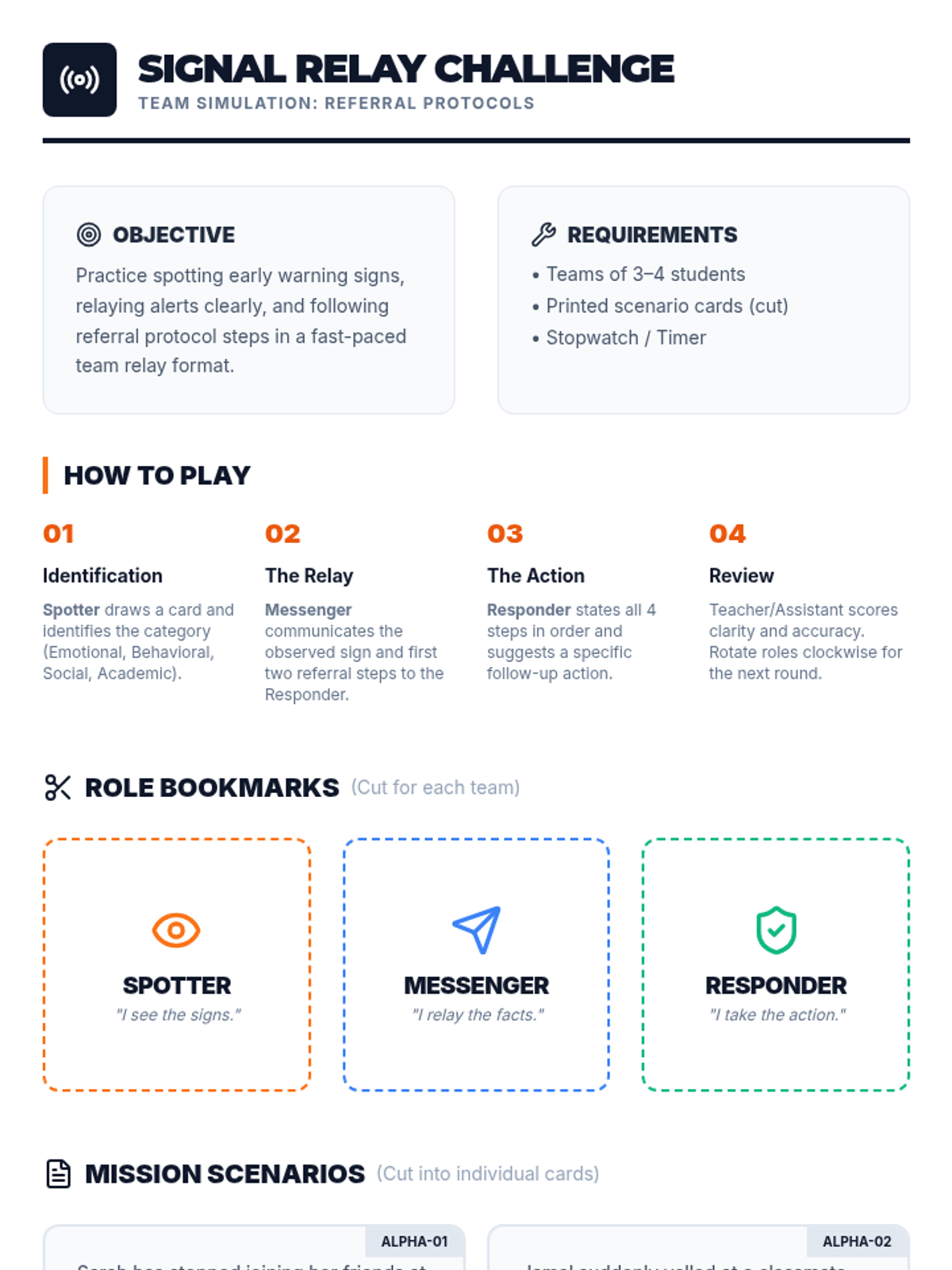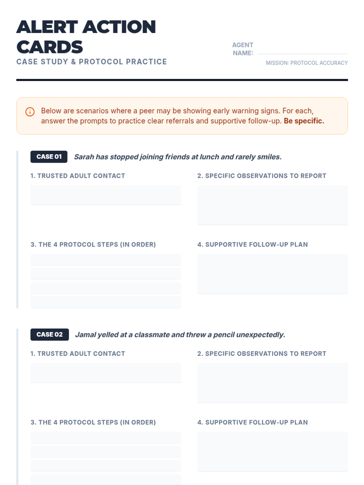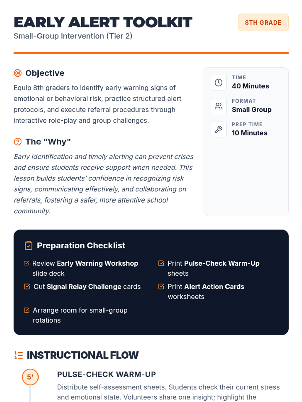A Tier 2 intervention for 8th graders focused on identifying risk signs, practicing referral protocols, and boosting collective vigilance in small groups.