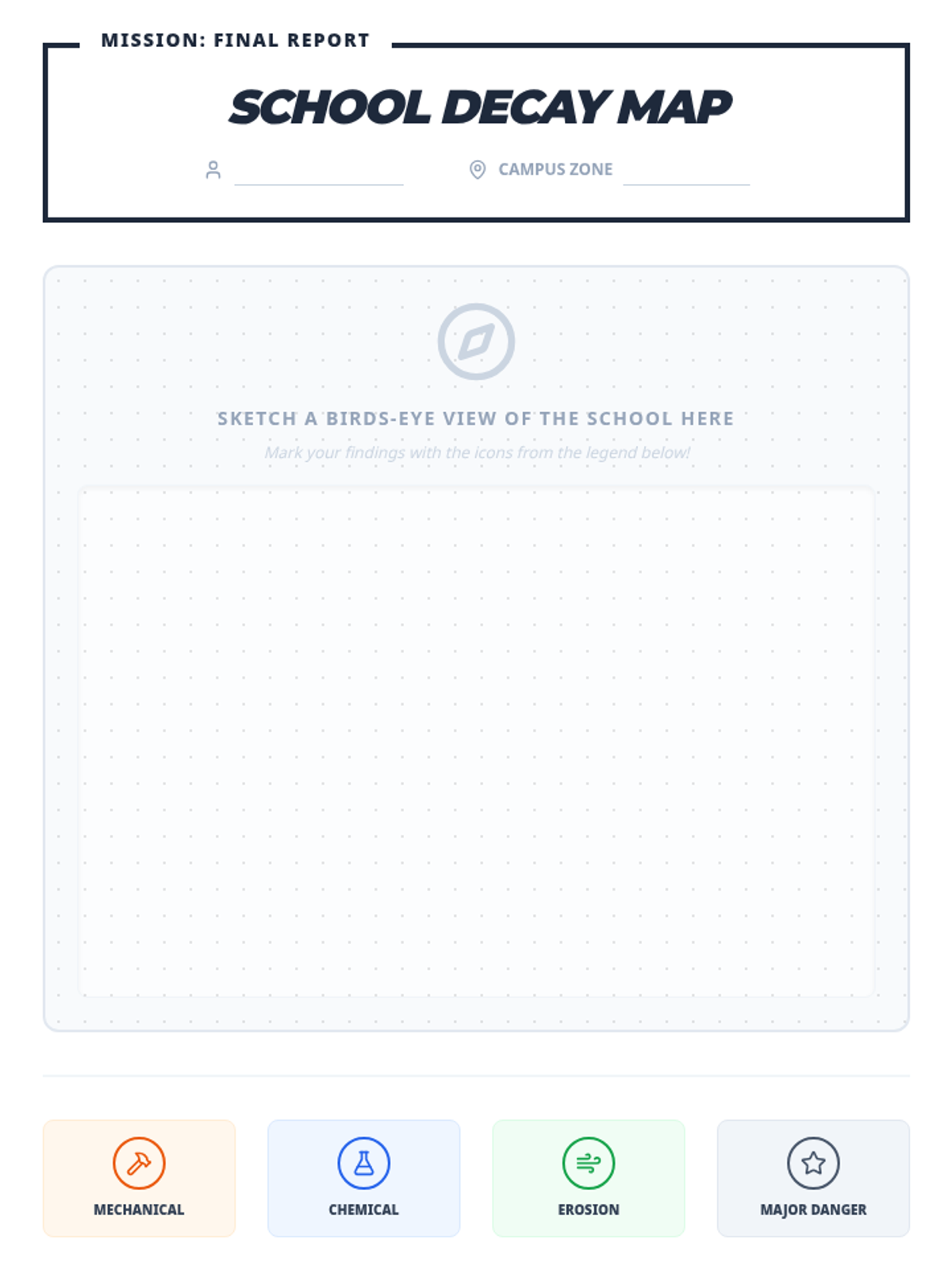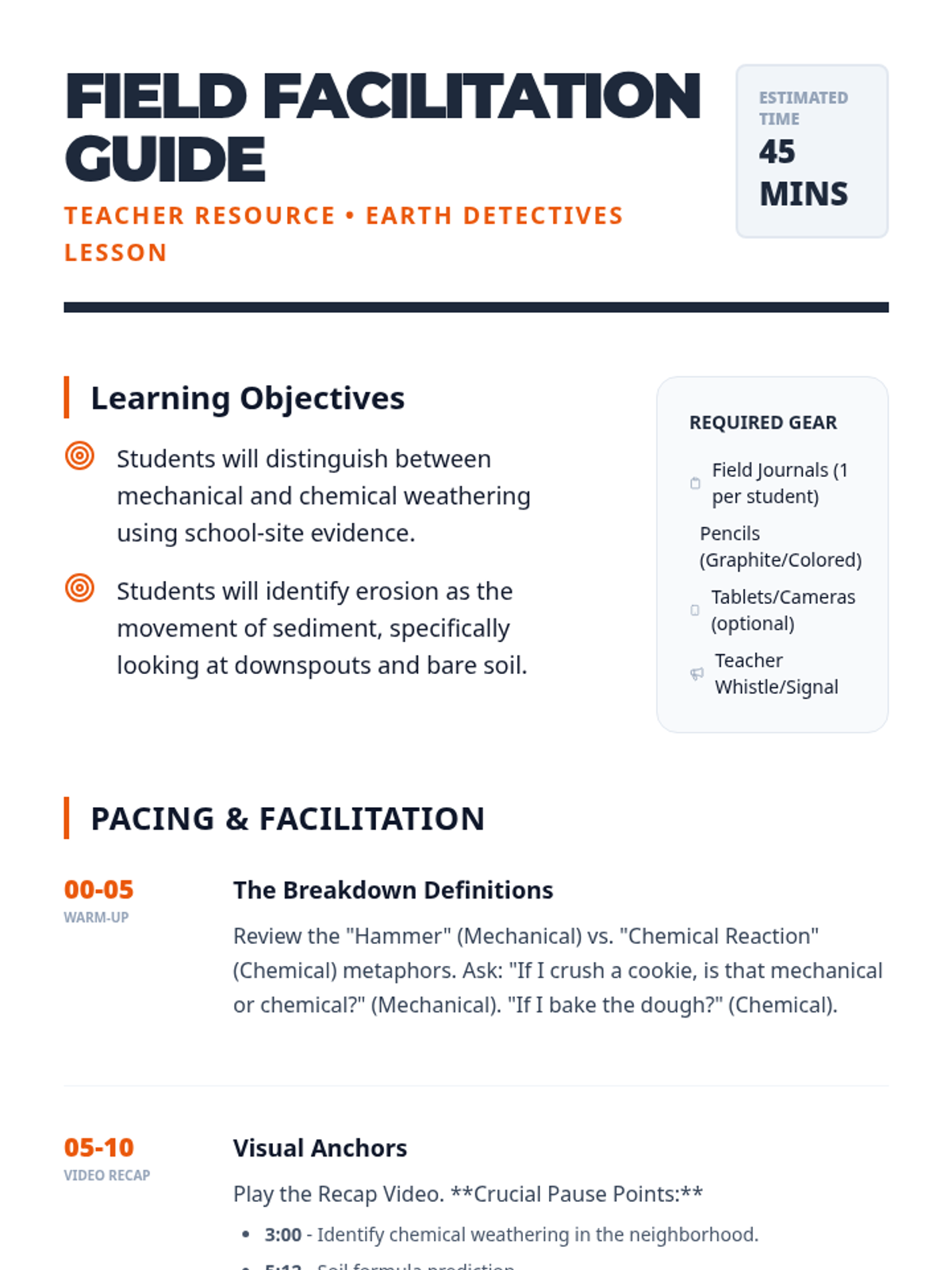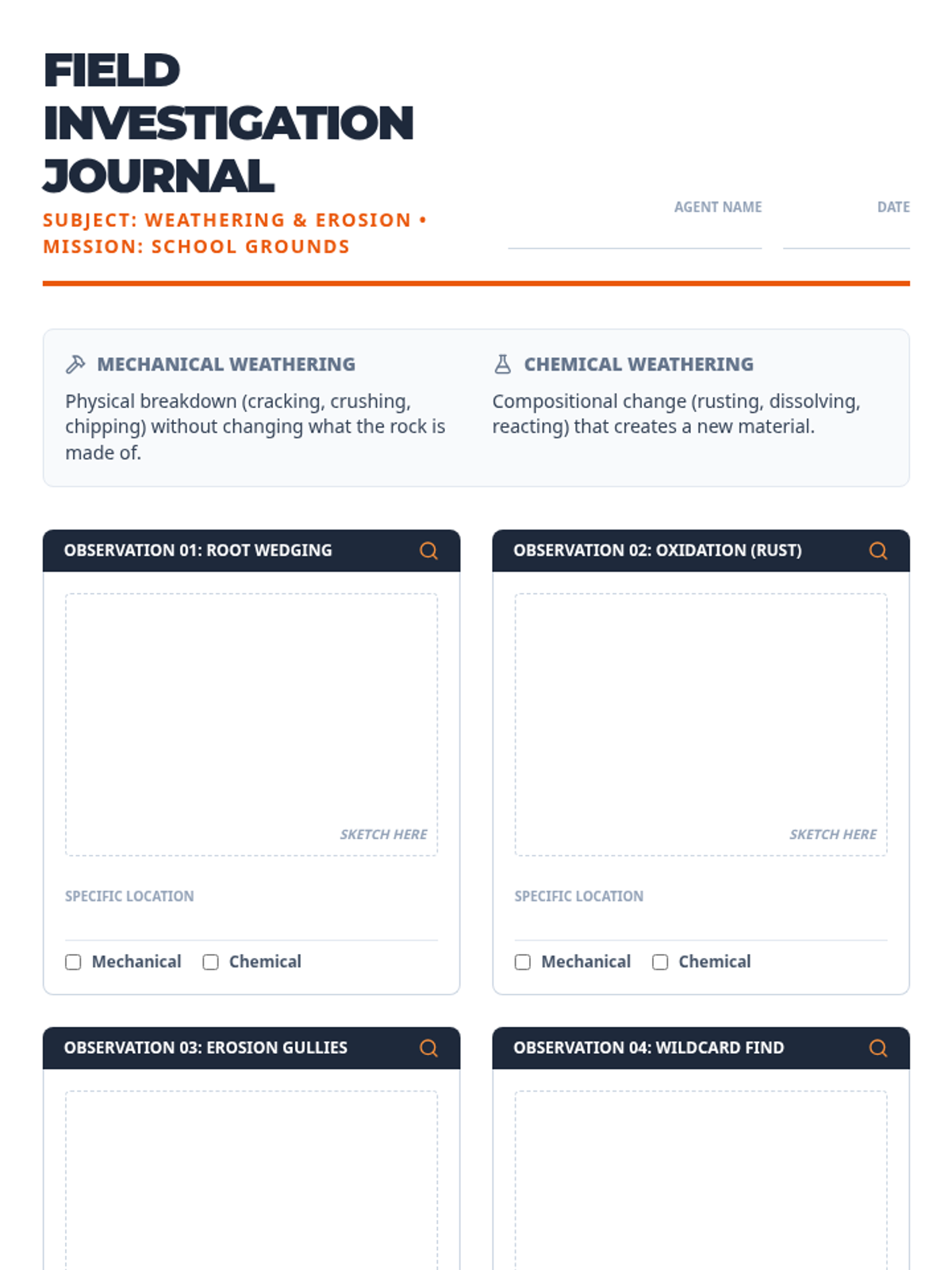 An outdoor-focused science lesson where students identify mechanical and chemical weathering and erosion around their school grounds, supported by a video recap and hands-on field sketching.
