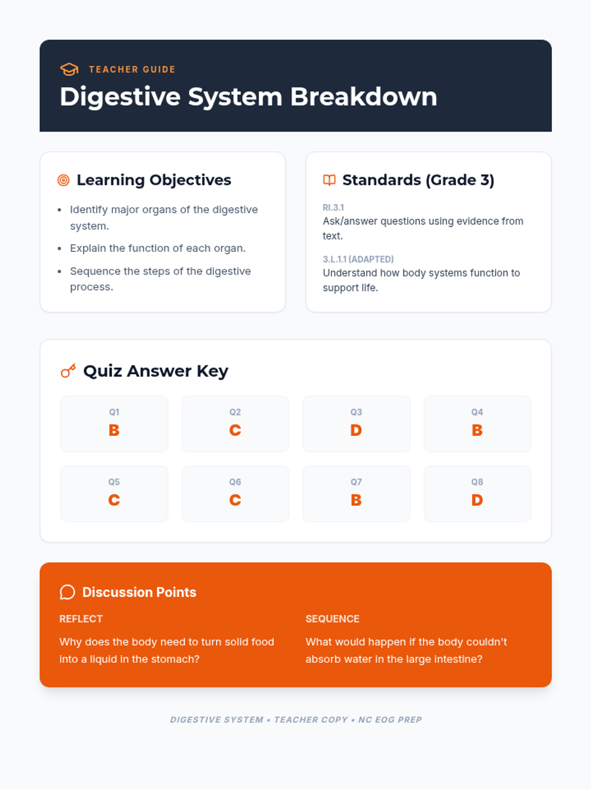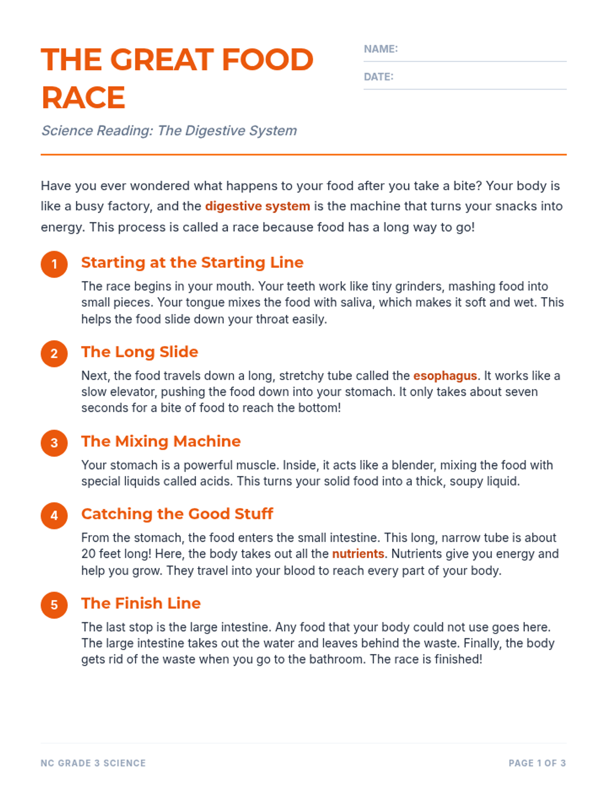 A comprehensive reading and assessment lesson focusing on the human digestive system, designed to meet NC 3rd grade reading levels and science concepts. Students will follow a piece of food through the 'Great Food Race' and demonstrate comprehension through EOG-style questioning.