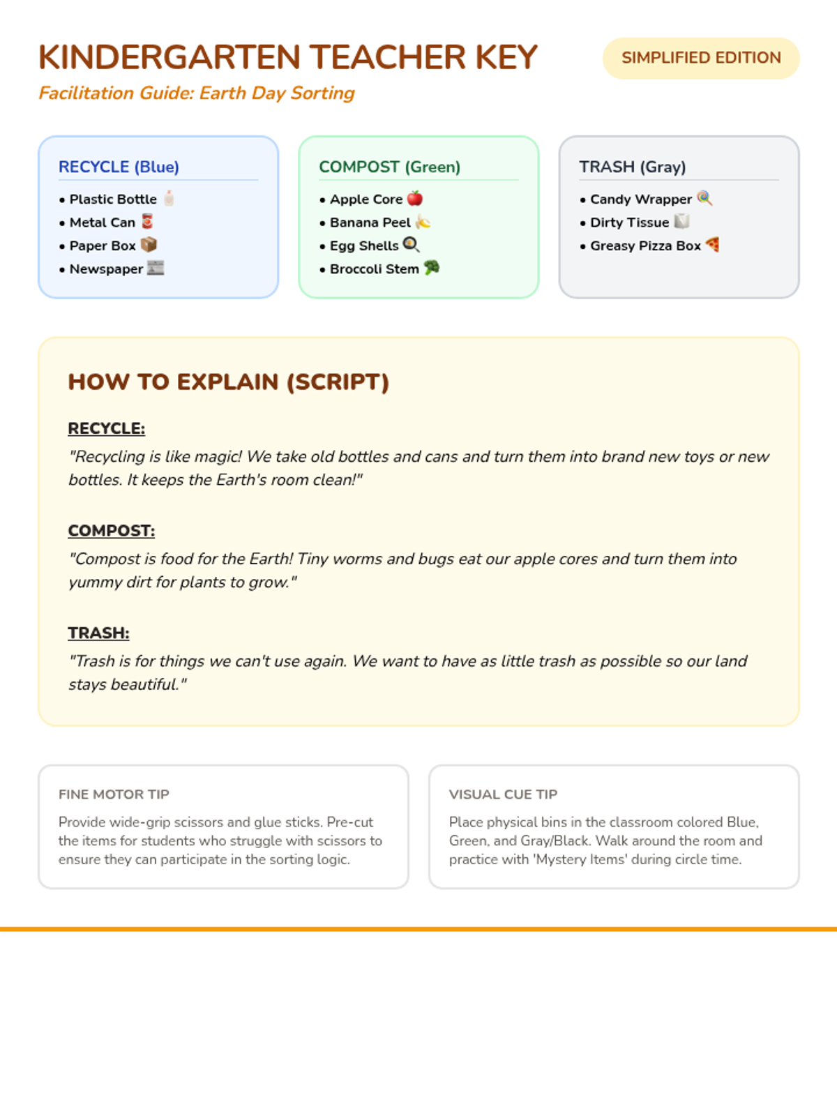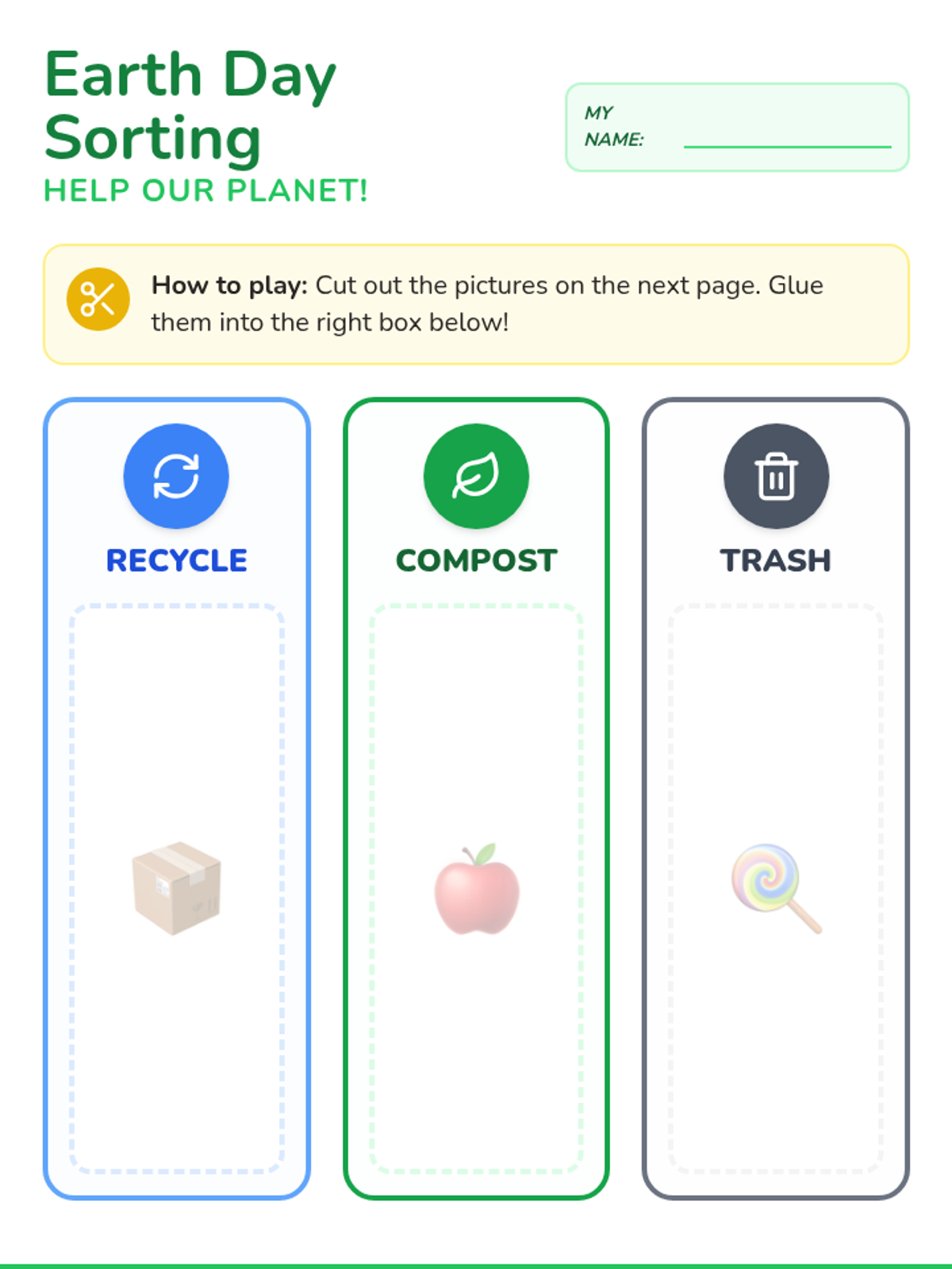 A hands-on lesson teaching students how to identify and sort different types of waste into recycling, compost, and landfill categories through visual activities.