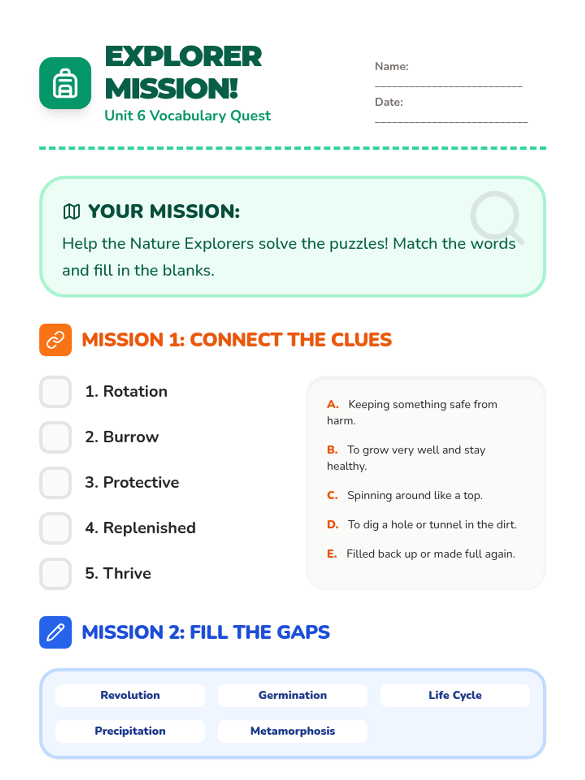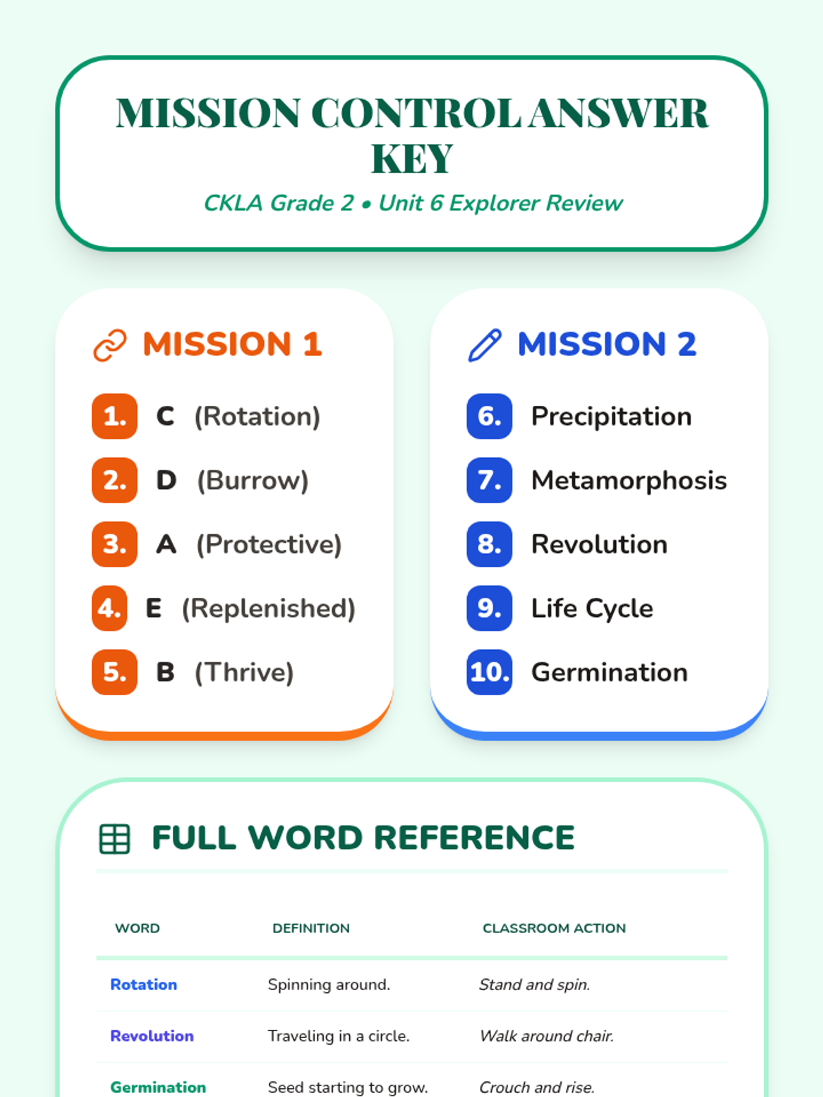 A comprehensive review of key vocabulary for the CKLA Grade 2 Unit 6 "Cycles in Nature" unit, preparing students for their vocabulary assessment.