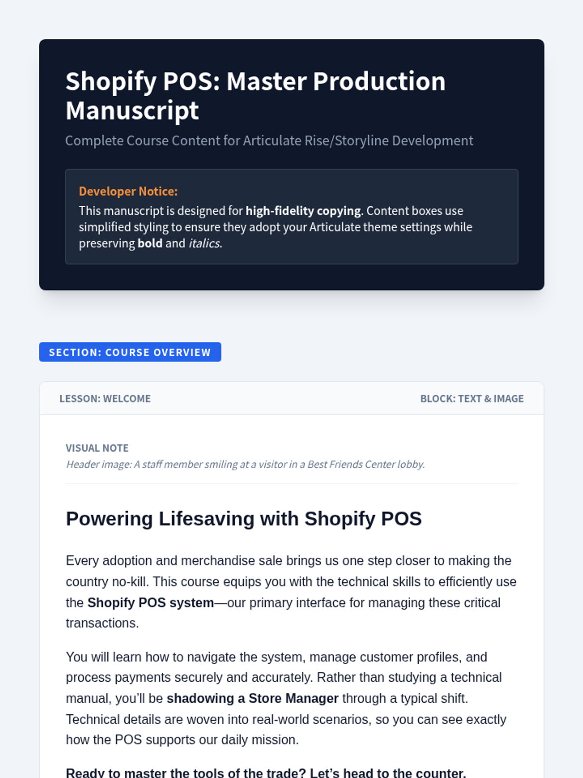 A comprehensive guide for new associates to master the Shopify POS system through a narrative 'First Day' experience at Best Friends Animal Society.