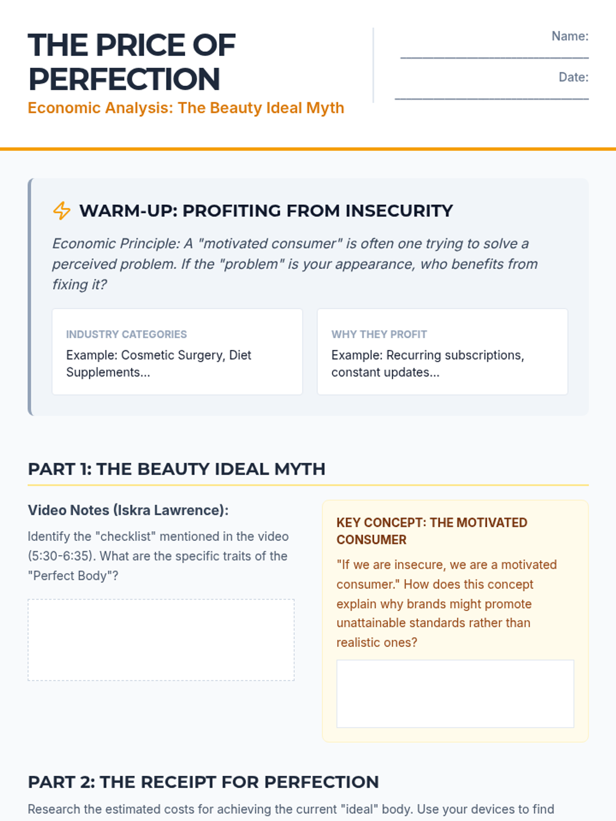 Students analyze the economic incentives behind unrealistic beauty standards, calculating the financial 'cost of perfection' and exploring the concept of the 'motivated consumer.'
