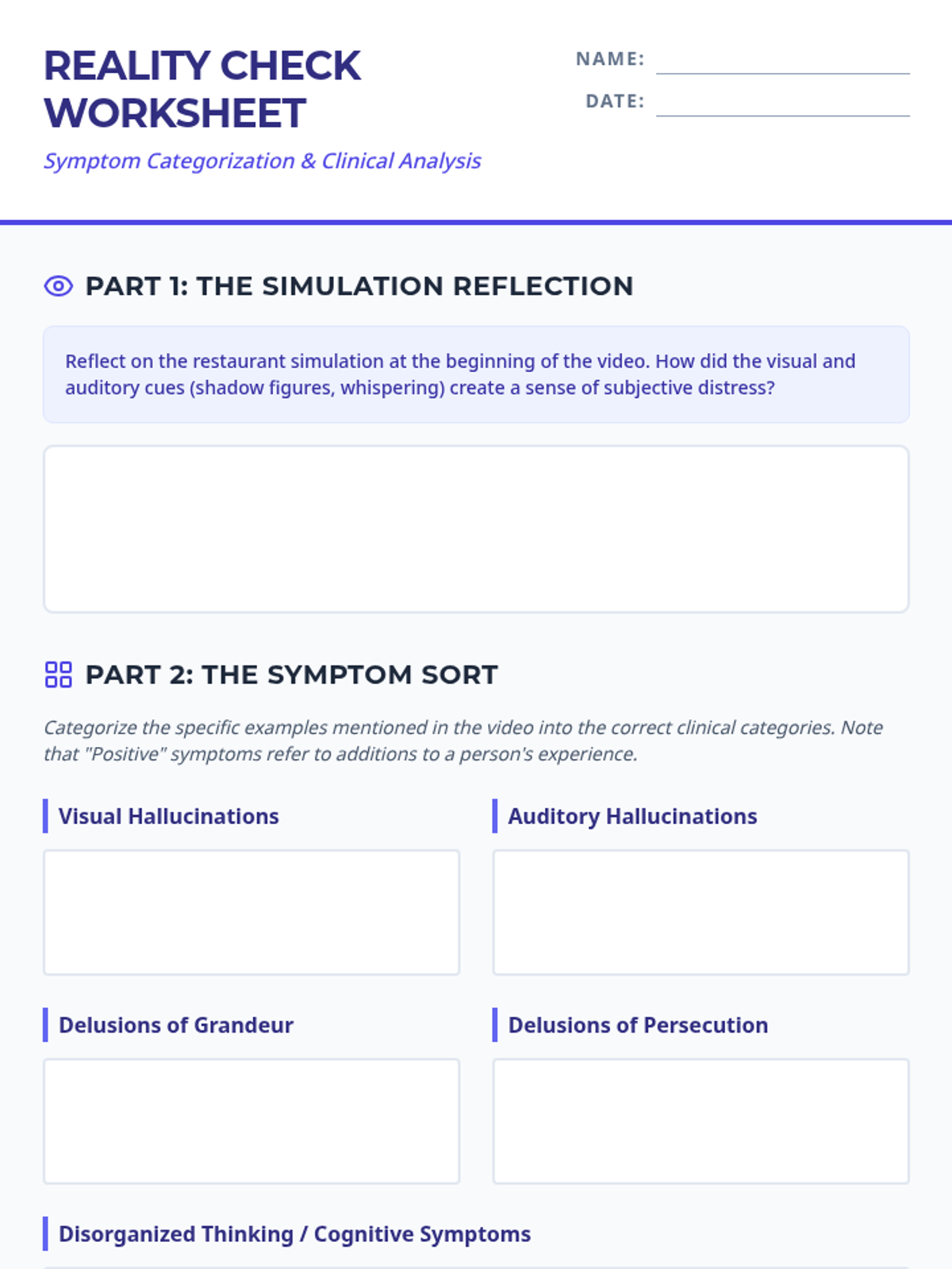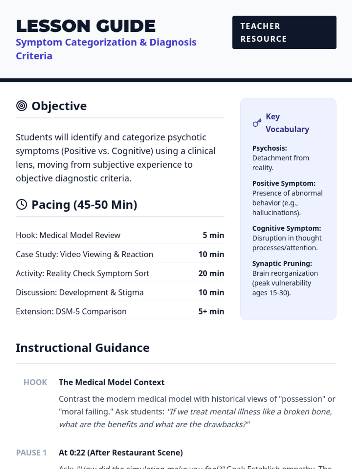 A clinical psychology lesson for undergraduates focusing on the categorization of psychotic symptoms using a simulation video as a case study. Students learn to distinguish between positive and cognitive symptoms and compare media representations to DSM-5 diagnostic criteria.