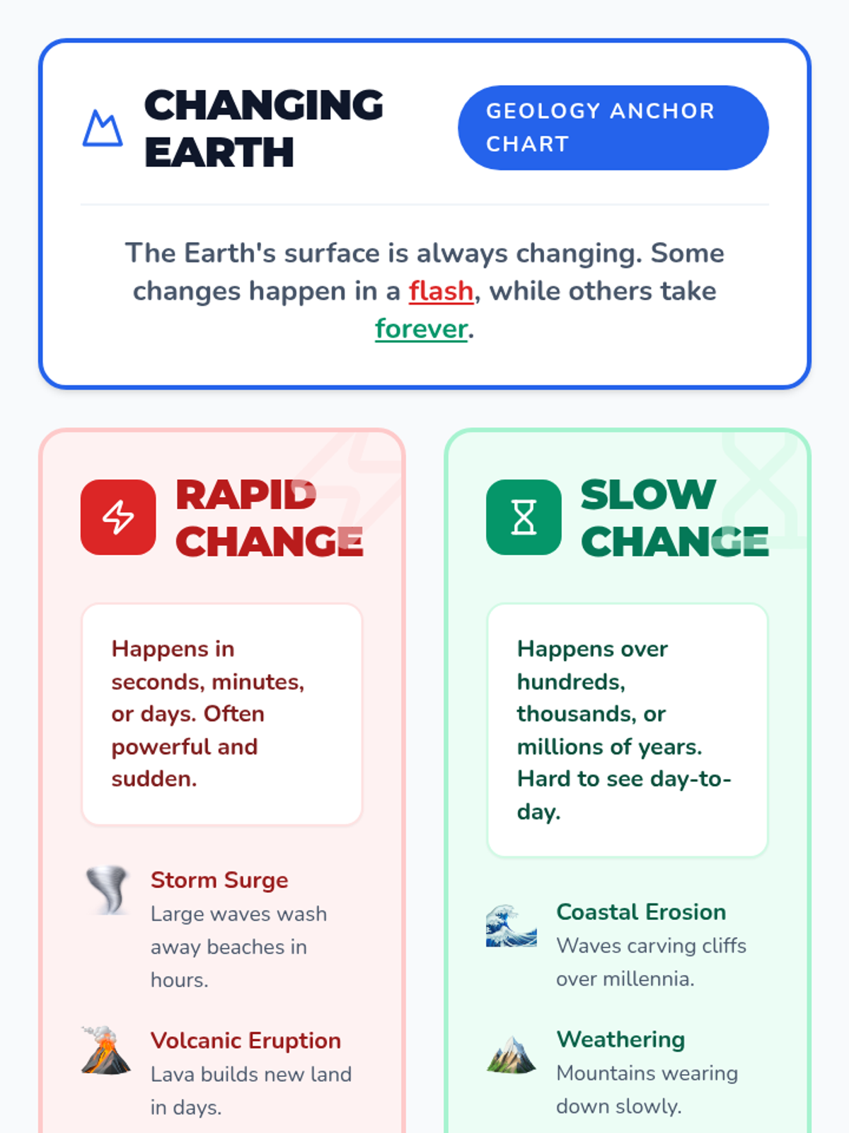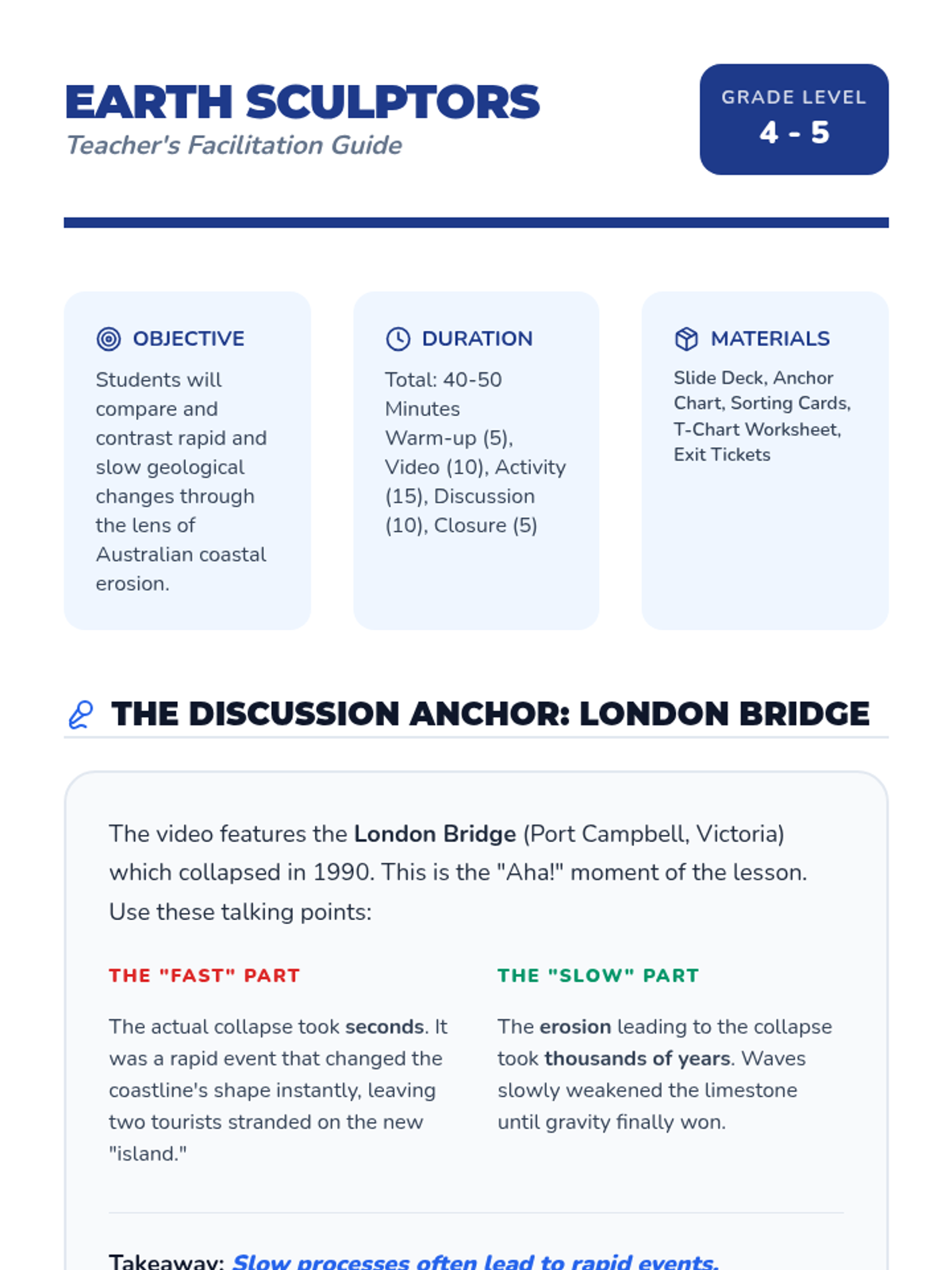 Students explore the dynamic nature of Earth's surface by comparing and contrasting rapid and slow geological changes, with a focus on coastal erosion in Australia.