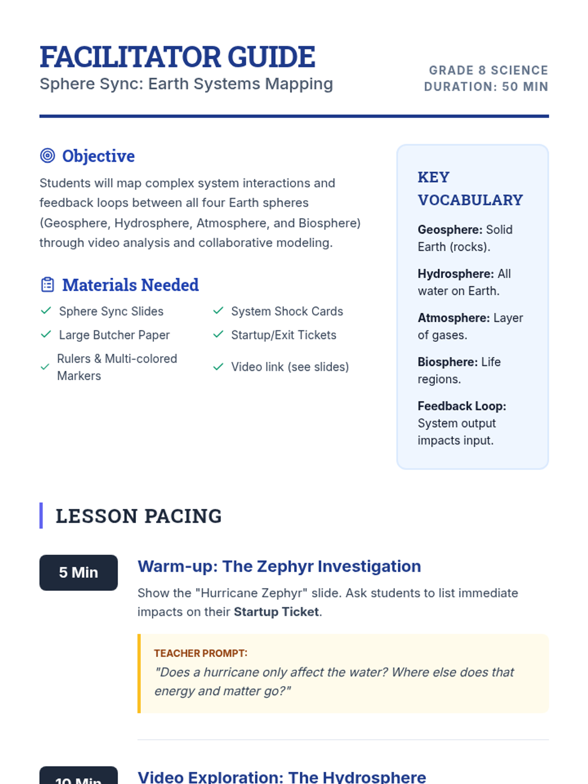 Students will investigate the complex interactions and feedback loops between Earth's four spheres (Geosphere, Hydrosphere, Atmosphere, and Biosphere) through video analysis and a collaborative systems mapping activity.
