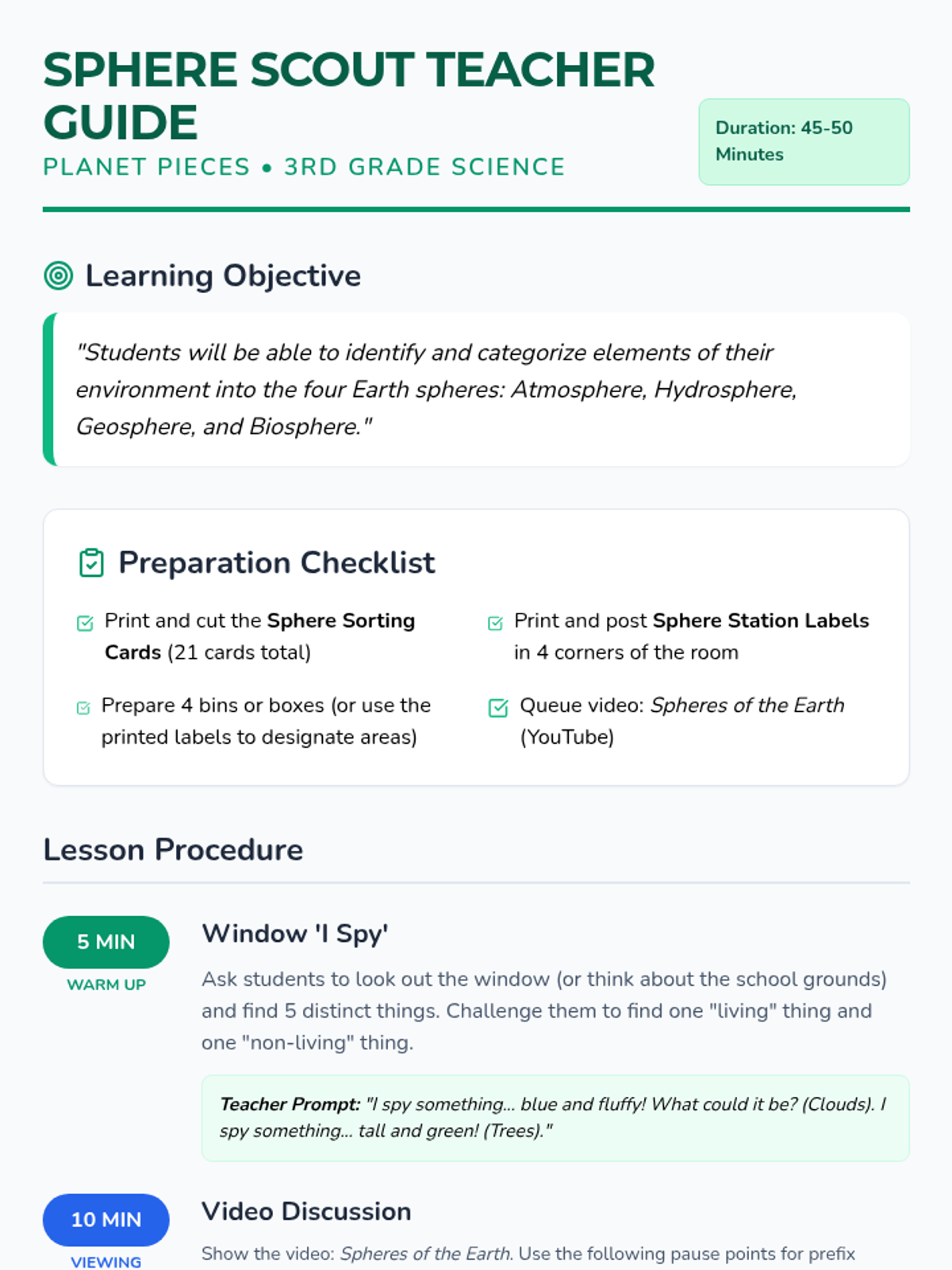 A 3rd-grade science lesson exploring the four Earth spheres (Atmosphere, Hydrosphere, Geosphere, and Biosphere) through a video-based discussion and a high-energy sorting relay activity.