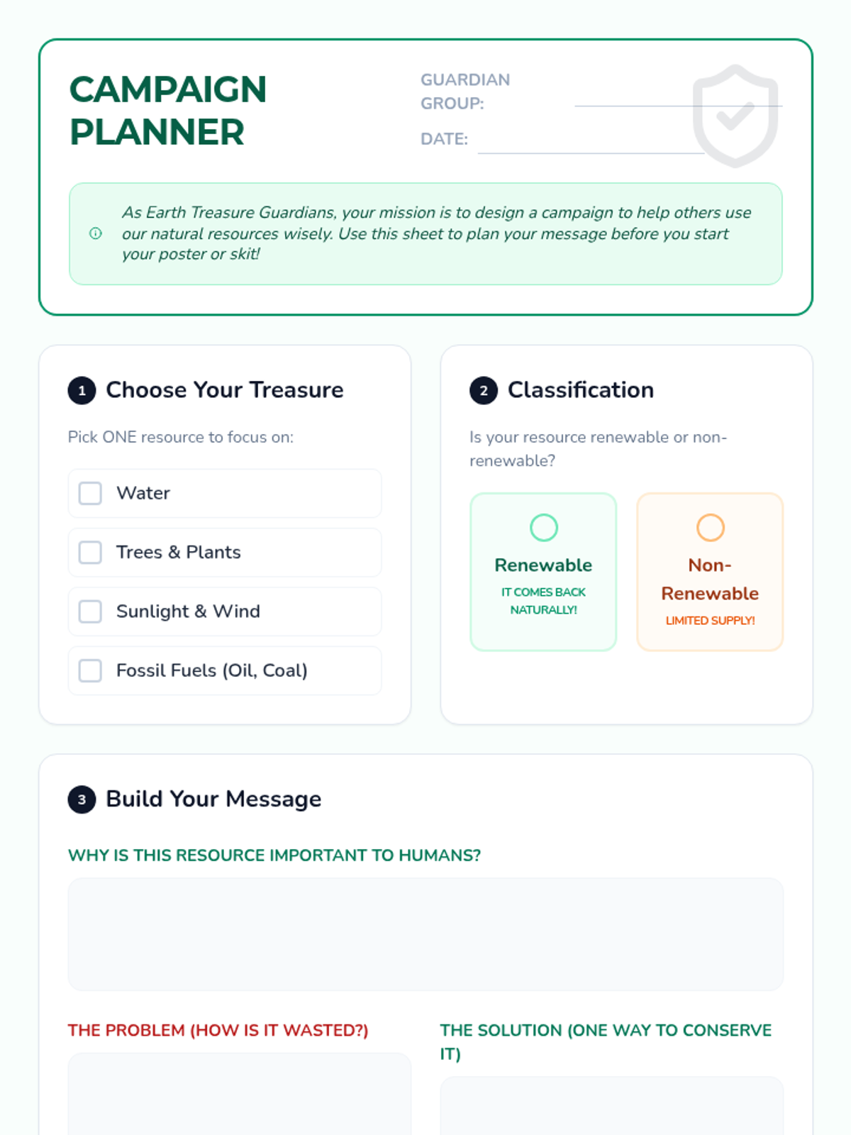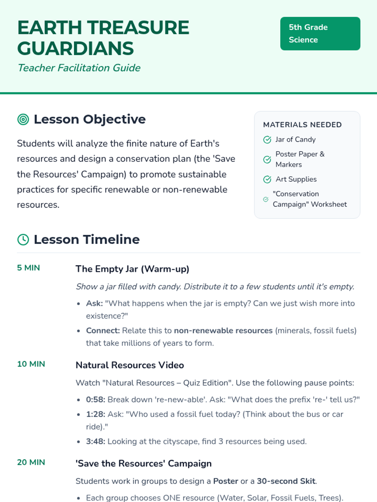 Students explore renewable and non-renewable natural resources through a 'candy jar' analogy and a video, concluding with a creative 'Save the Resources' campaign to promote conservation strategies.