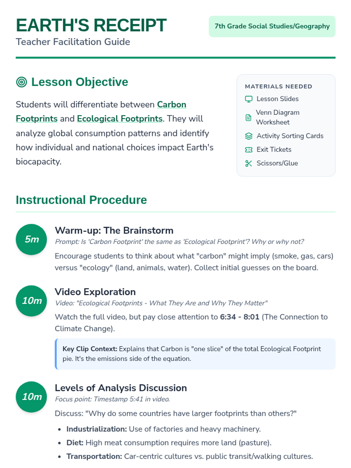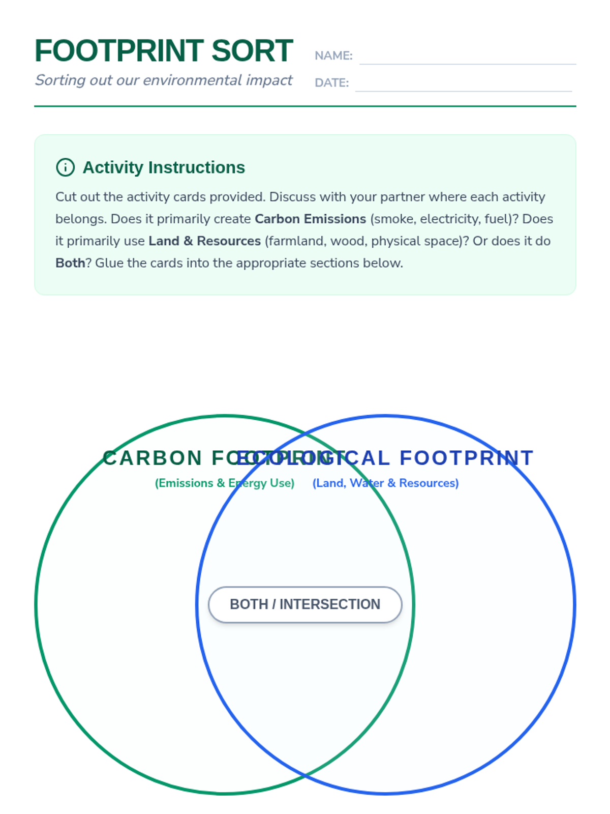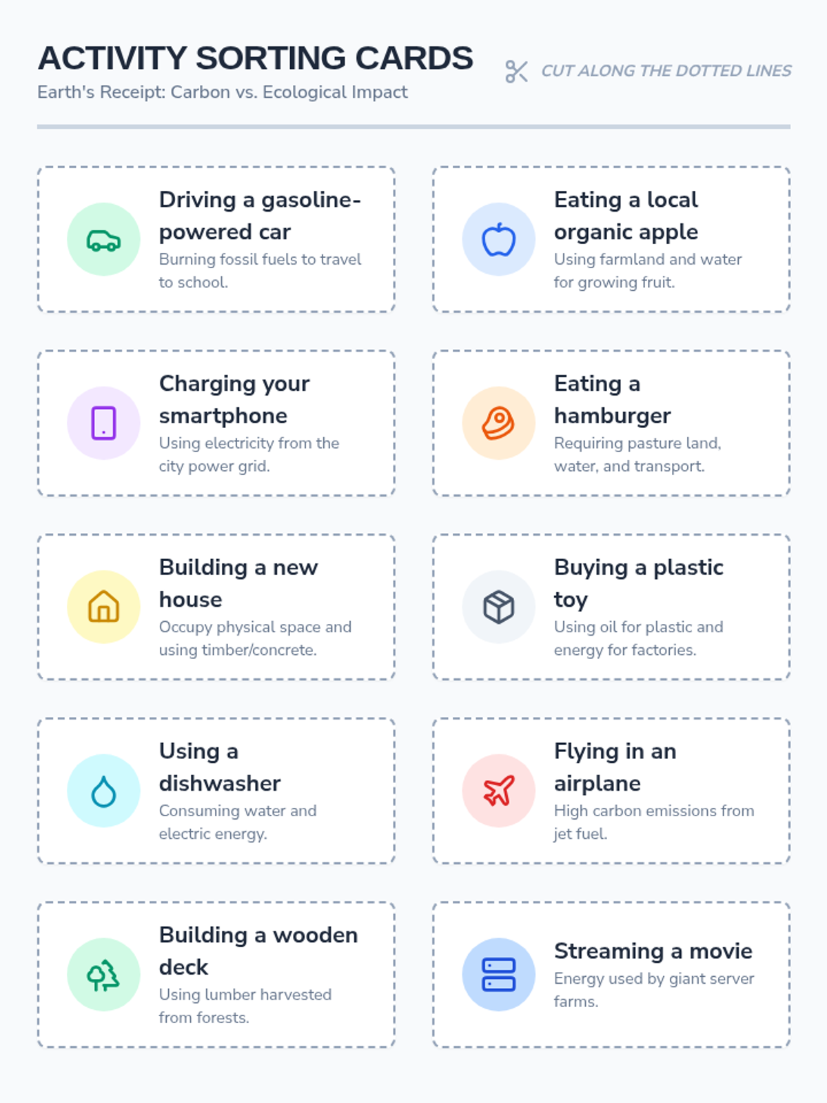 Students will differentiate between Carbon and Ecological footprints, analyze global consumption levels, and sort activities based on their environmental impact using a 'paycheck' analogy for Earth's resources.