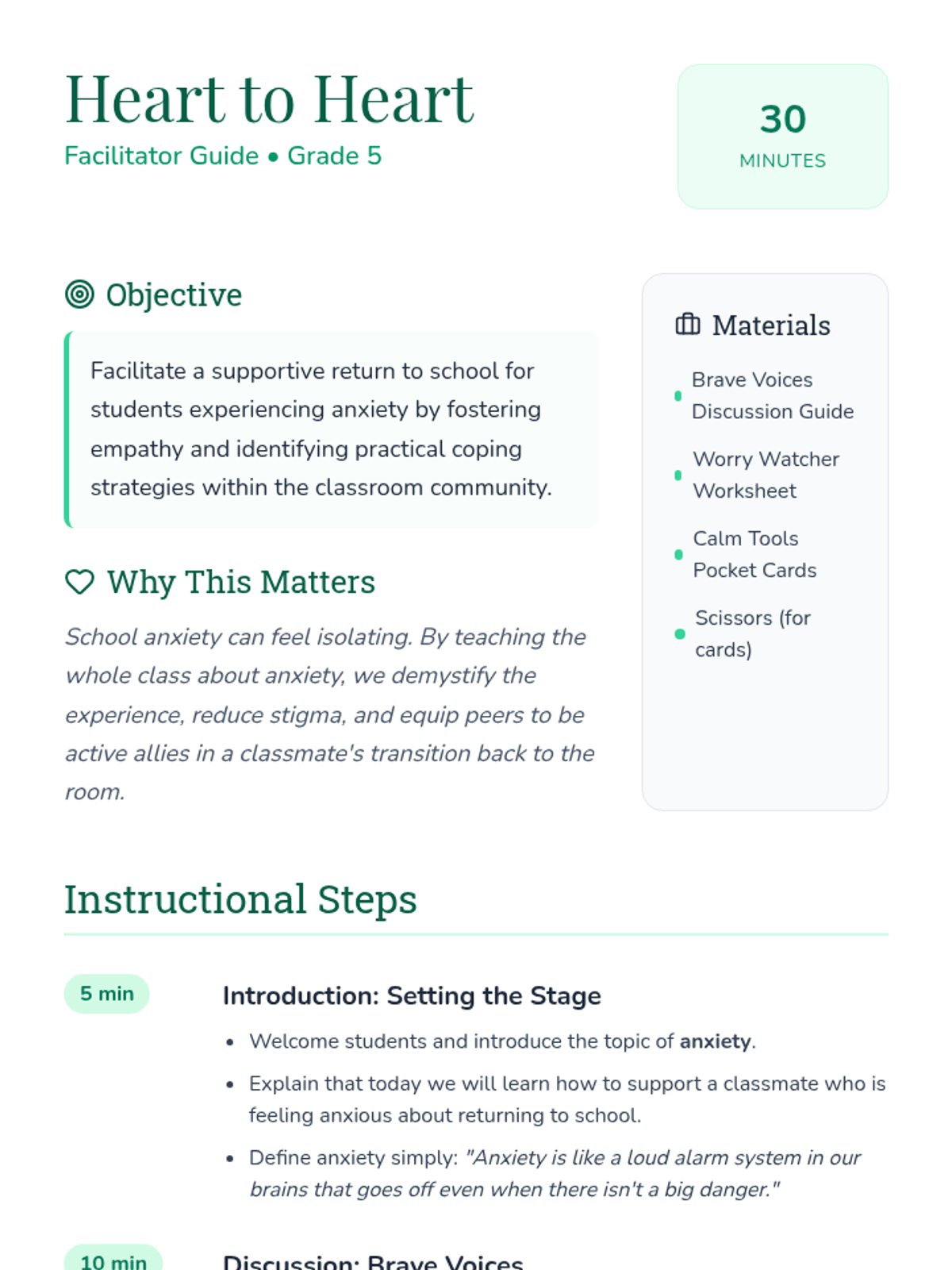 This lesson supports Grade 5 students in welcoming back a peer with school-related anxiety. It focuses on understanding emotions, building empathy, and practicing specific coping strategies to create a supportive classroom community.