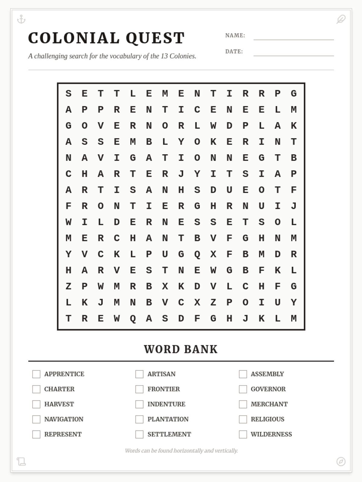 A look into the lives, systems, and vocabulary of the thirteen original American colonies.