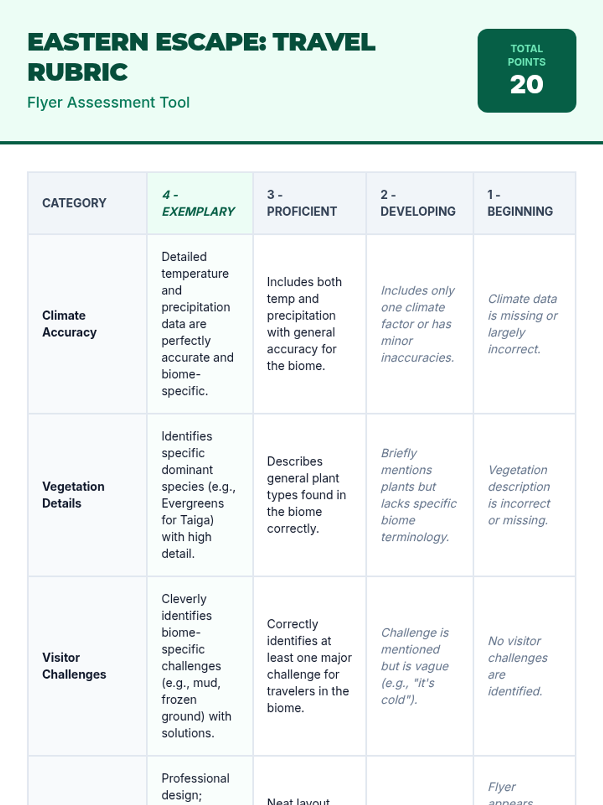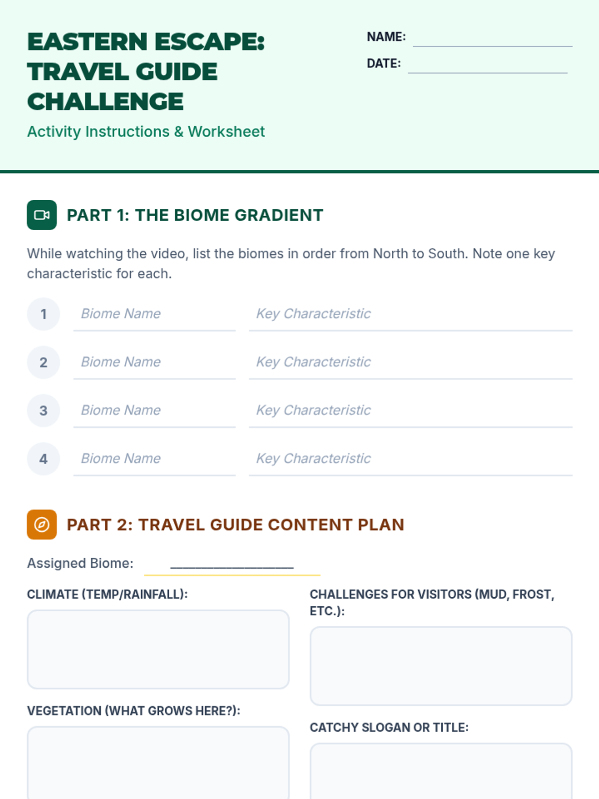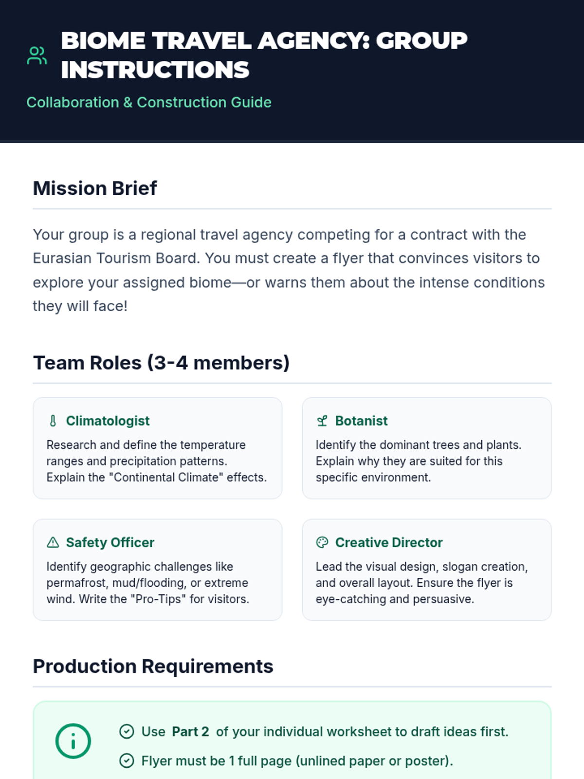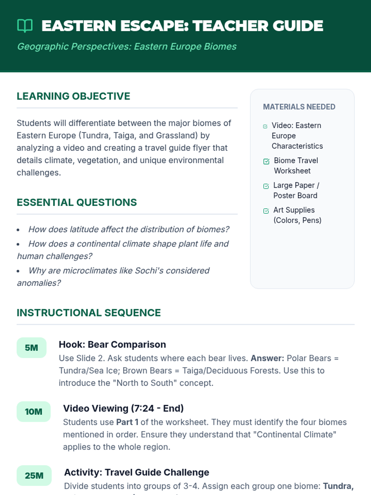 Students will differentiate between the major biomes of Eastern Europe (Tundra, Taiga, and Grassland) by analyzing a video and creating a travel guide flyer that details climate, vegetation, and unique environmental challenges.