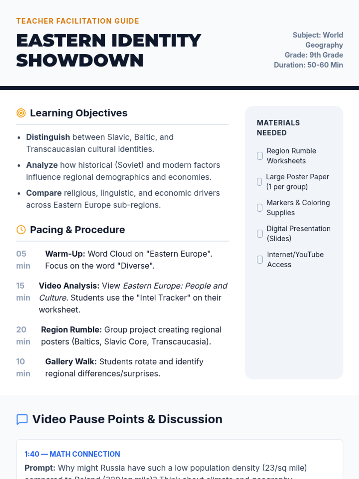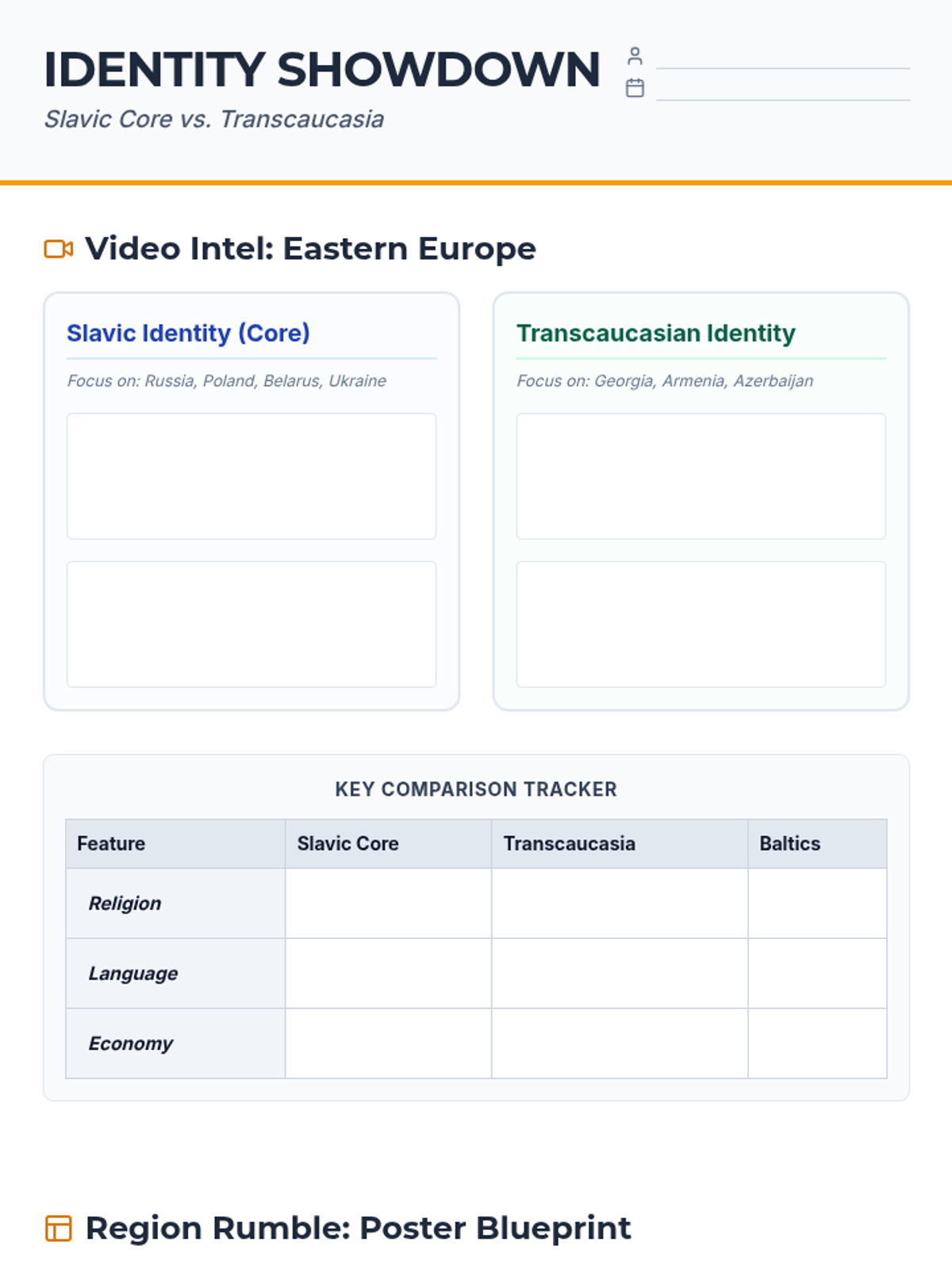 Students investigate the cultural, economic, and political distinctions between Slavic and Transcaucasian identities in Eastern Europe through video analysis and a collaborative poster project.