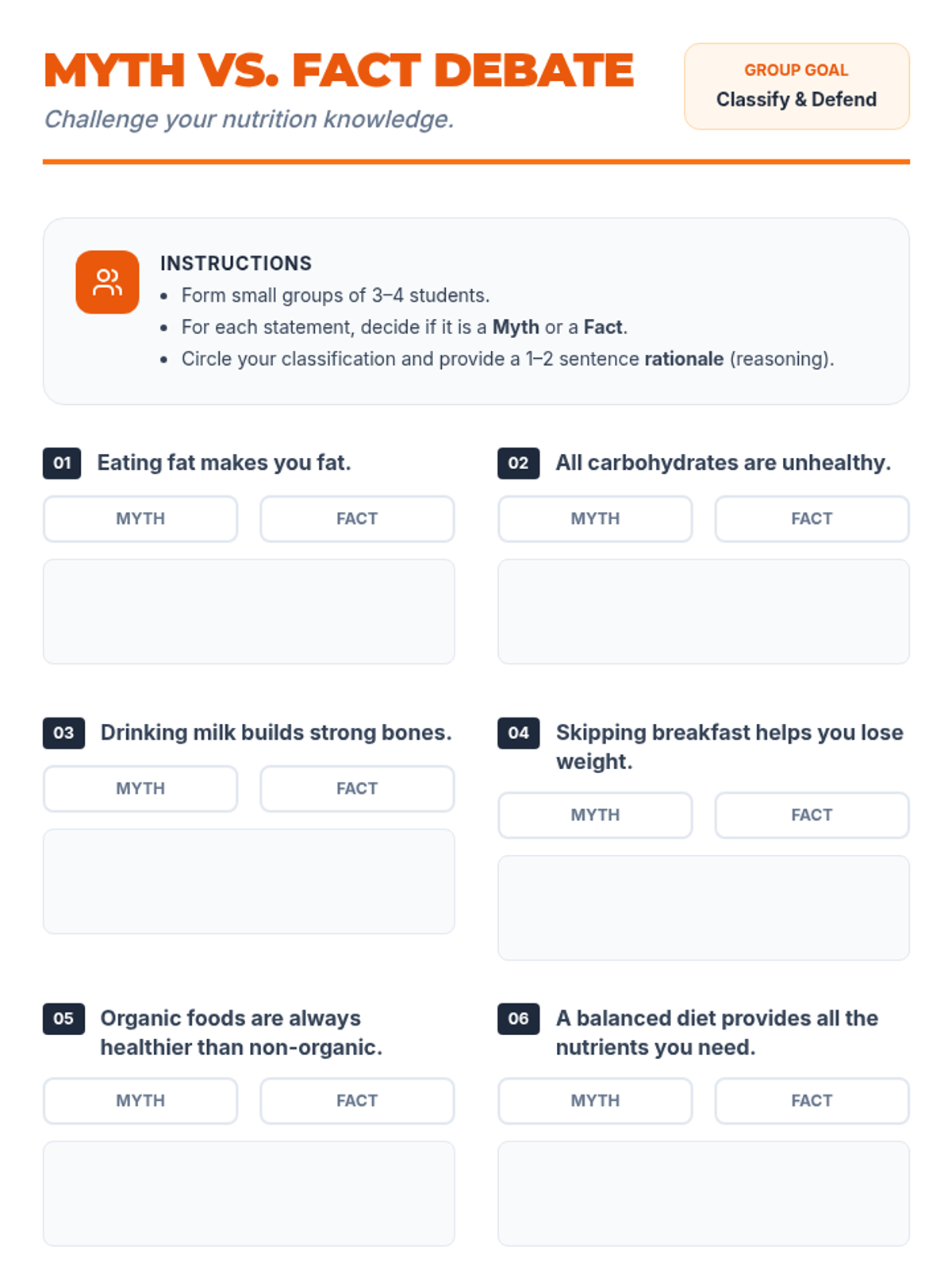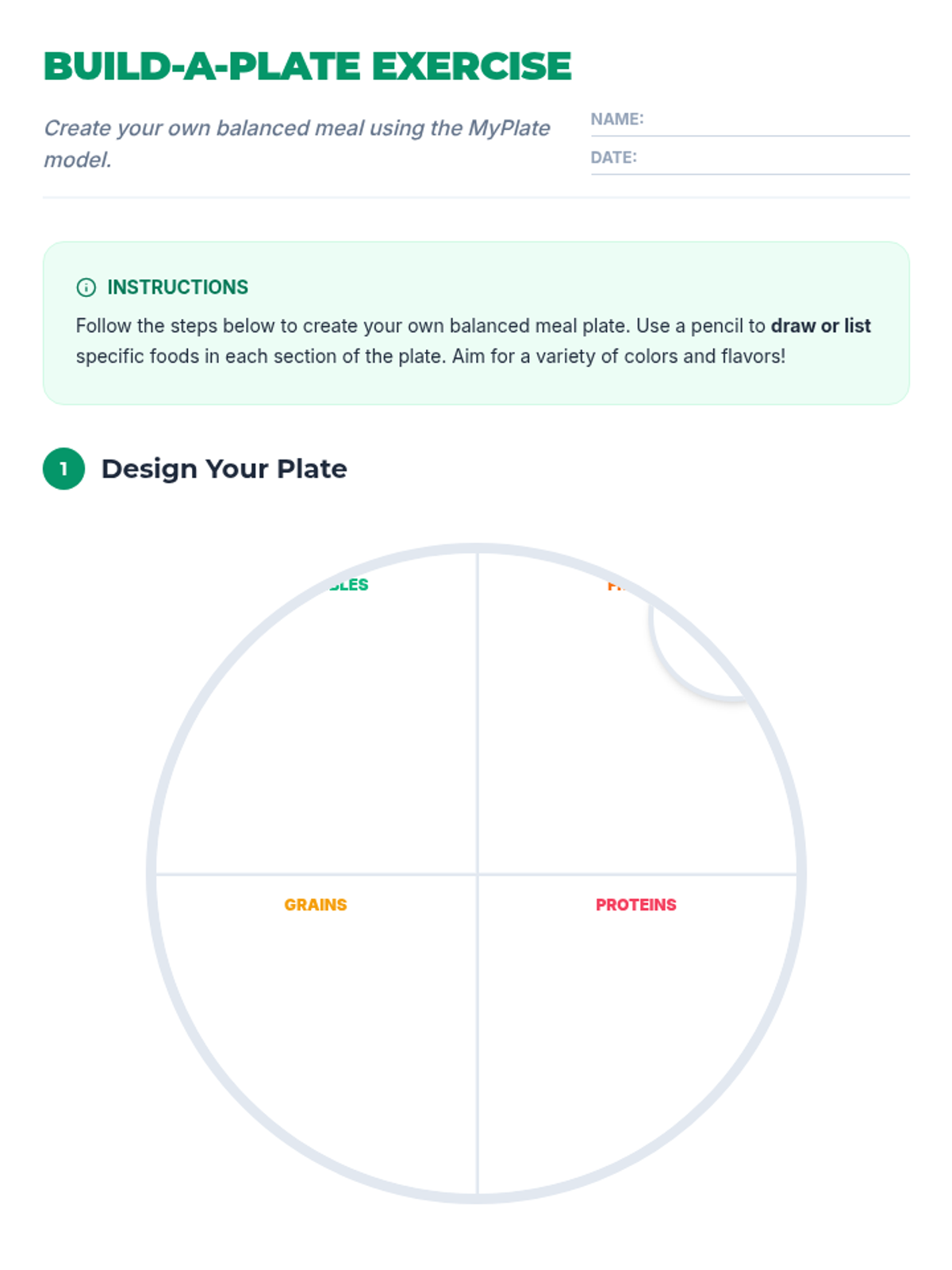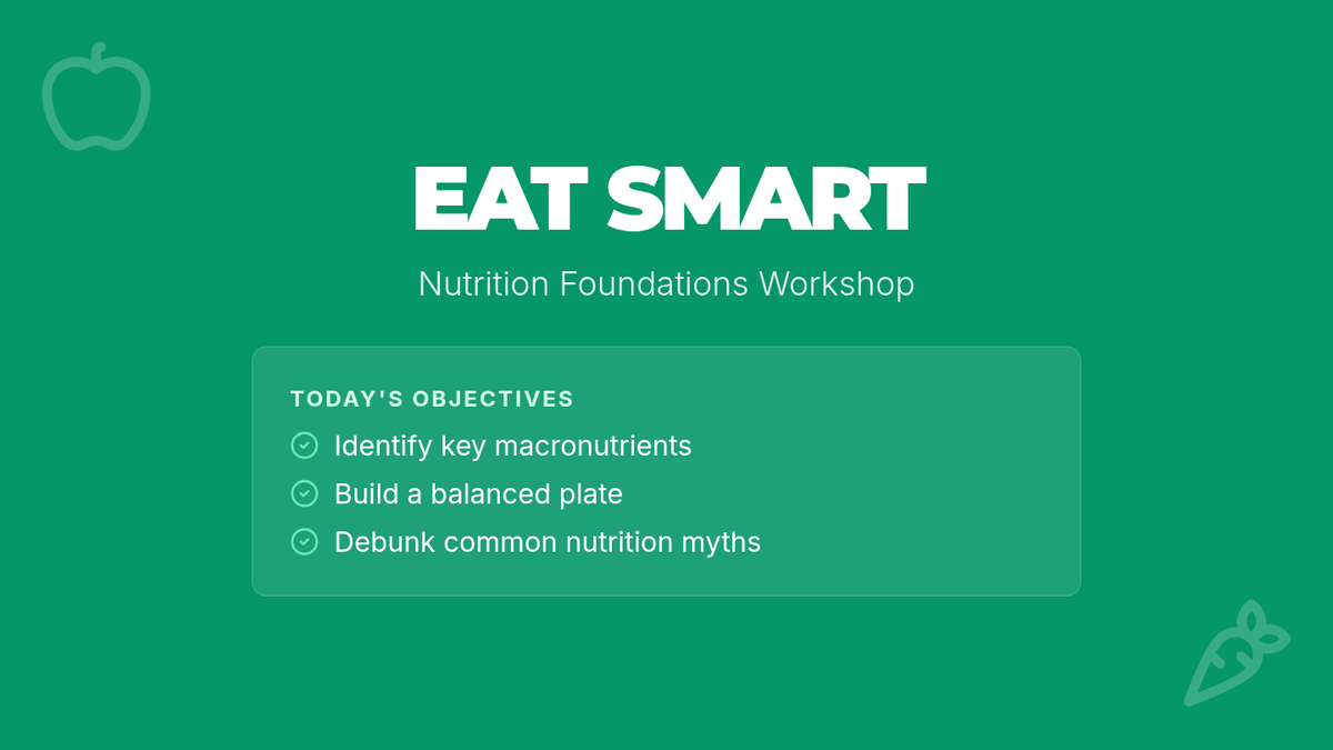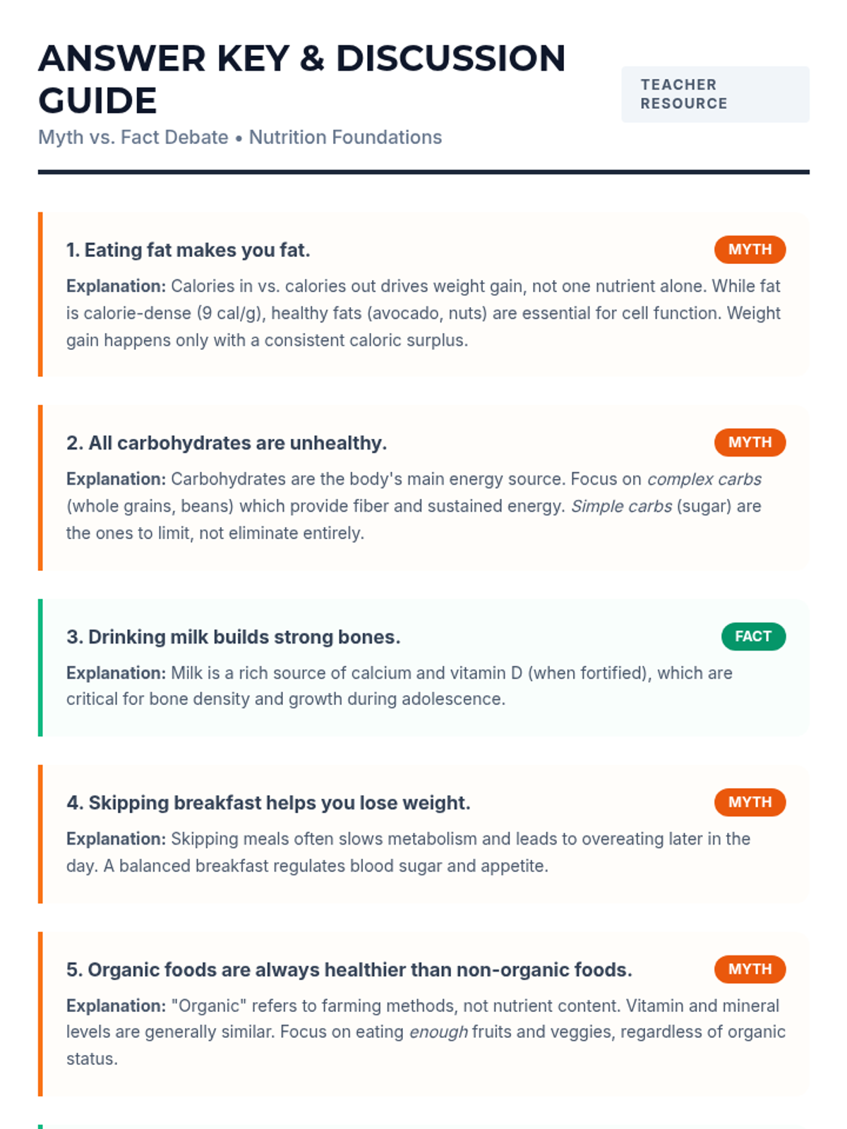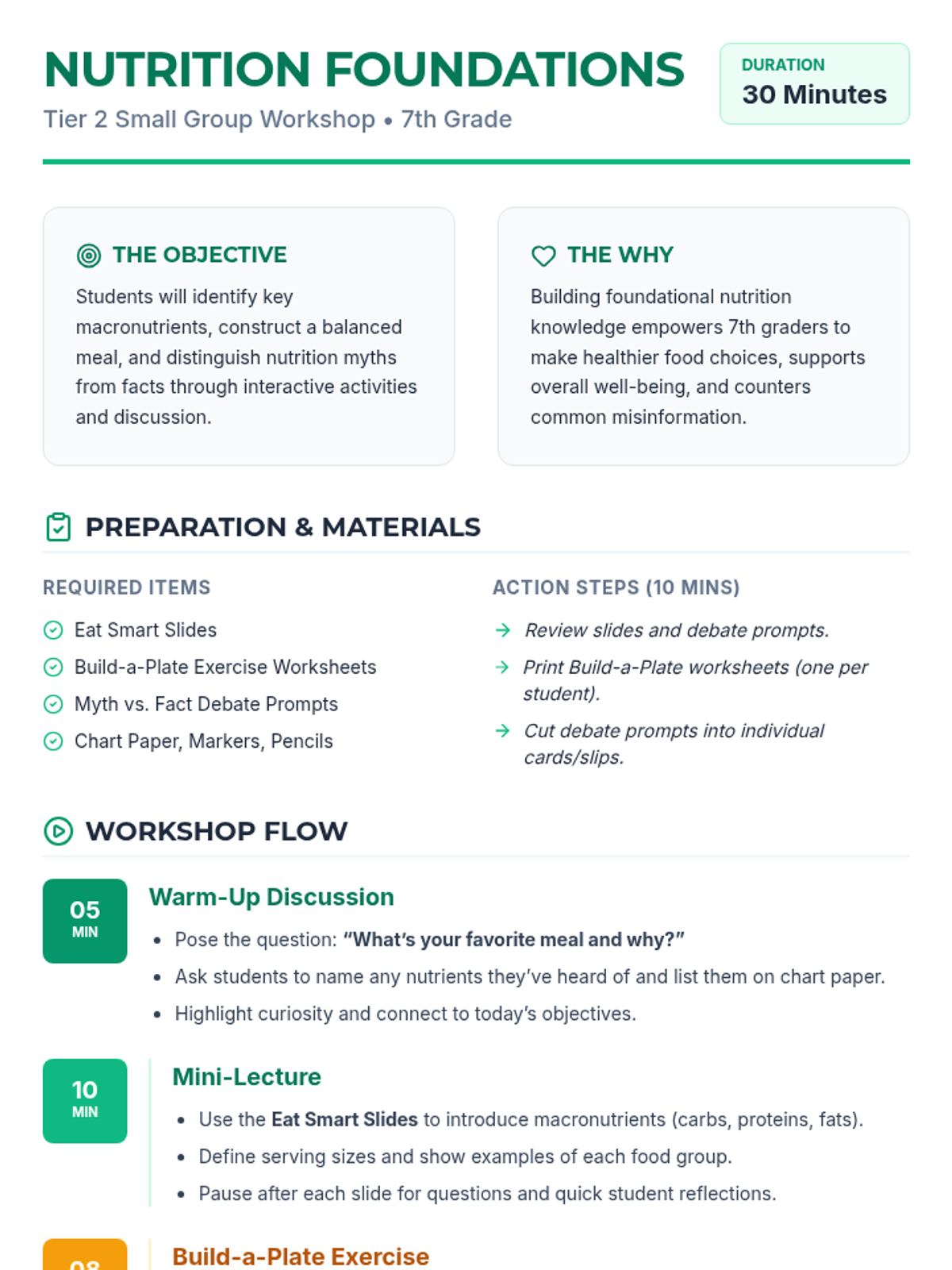 A 30-minute workshop for 7th graders focused on macronutrients, building balanced meals using the MyPlate model, and debunking common nutrition myths.
