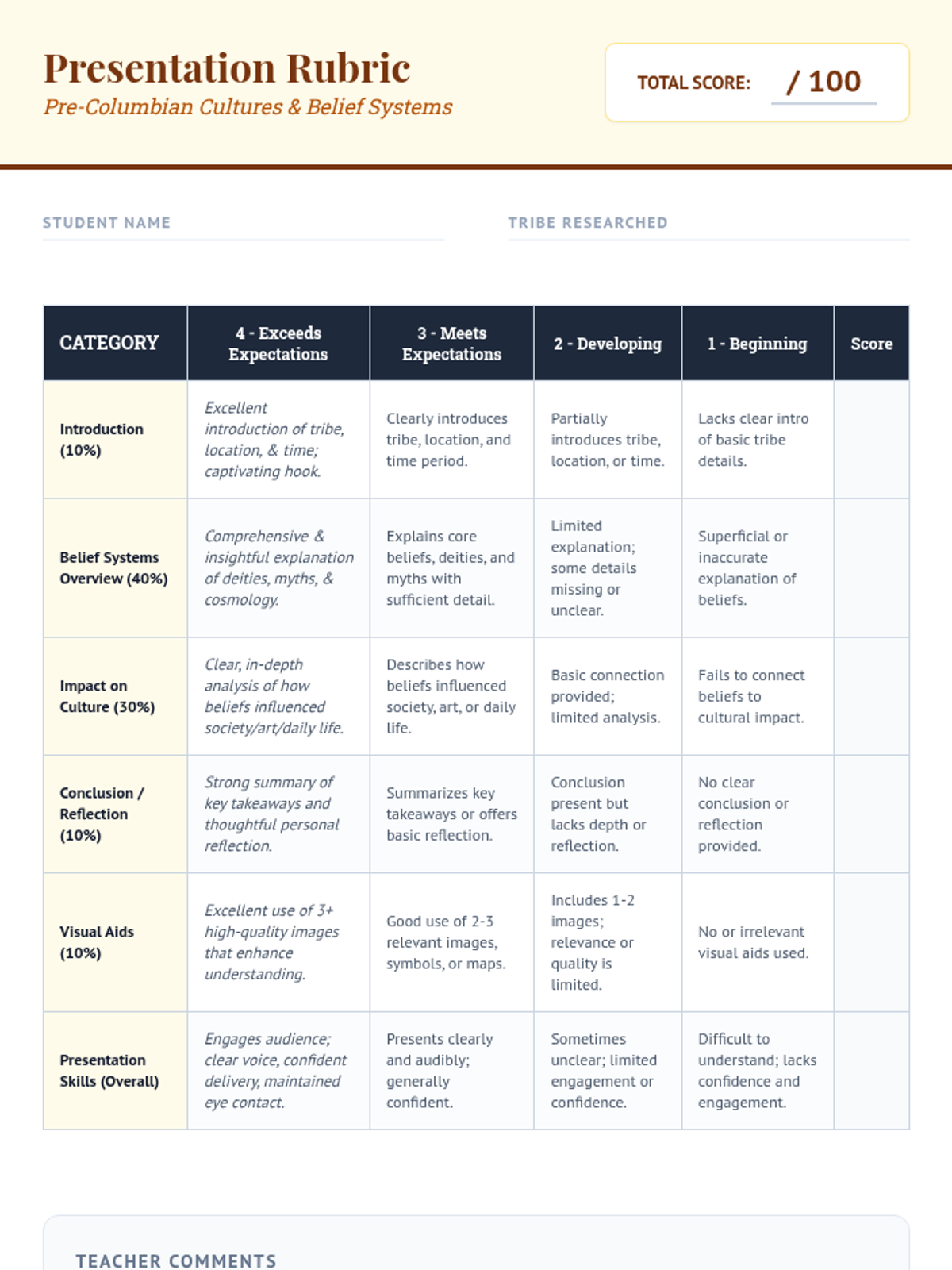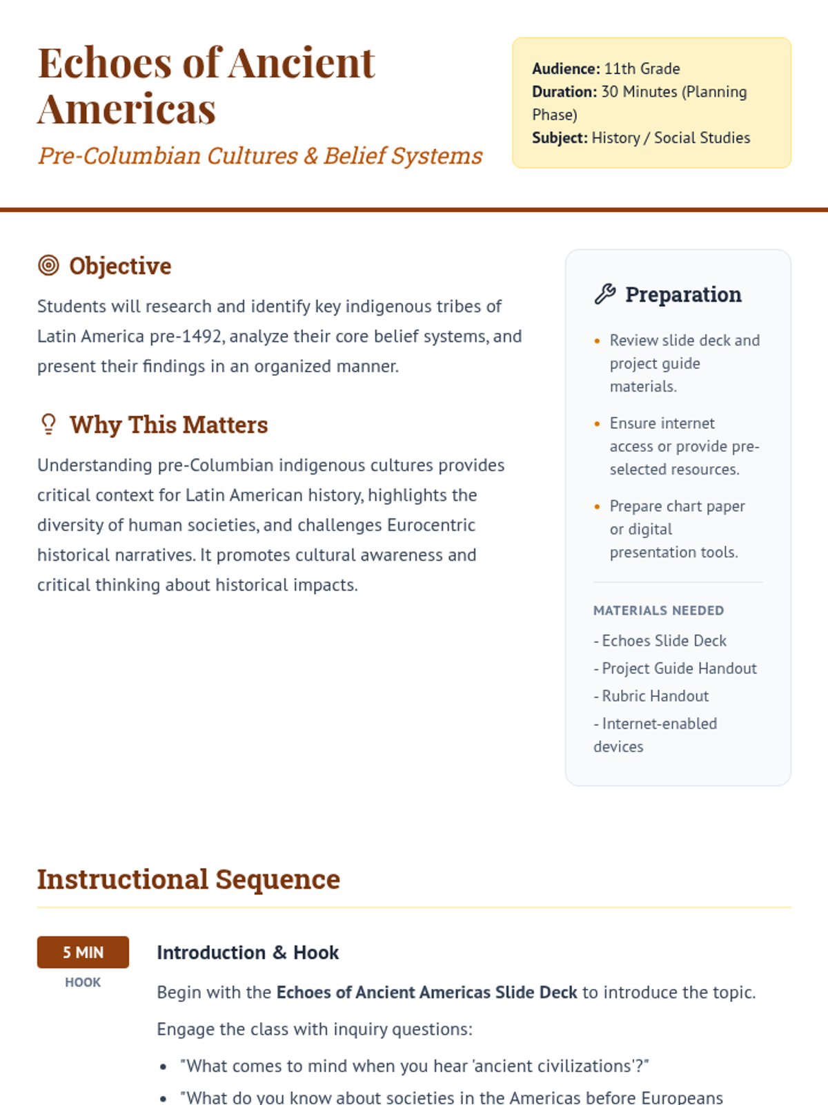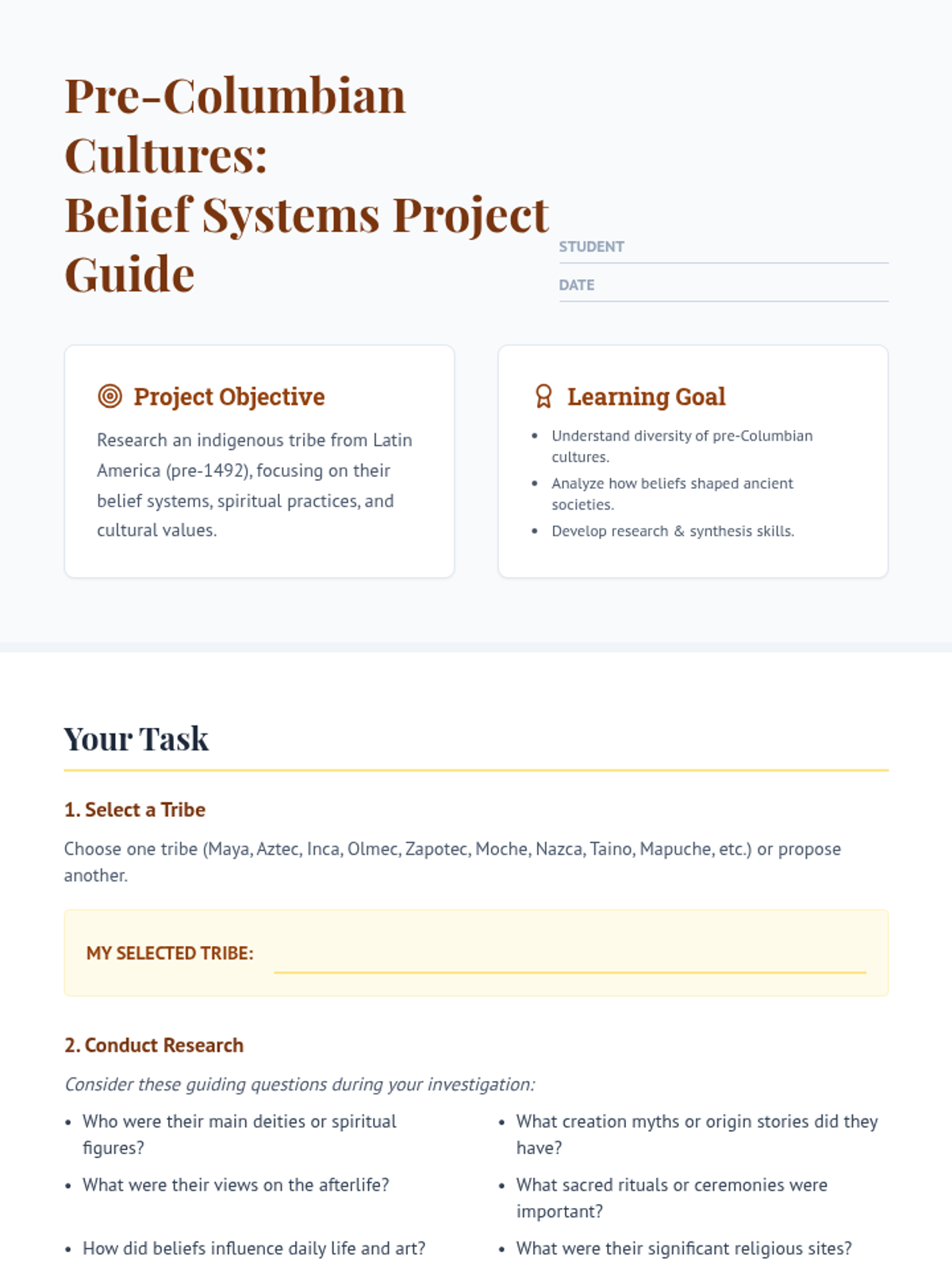 This lesson explores the rich history and diverse belief systems of indigenous tribes in Latin America before the arrival of Columbus. Students will research, synthesize information, and present their findings, fostering an appreciation for pre-Columbian cultures.