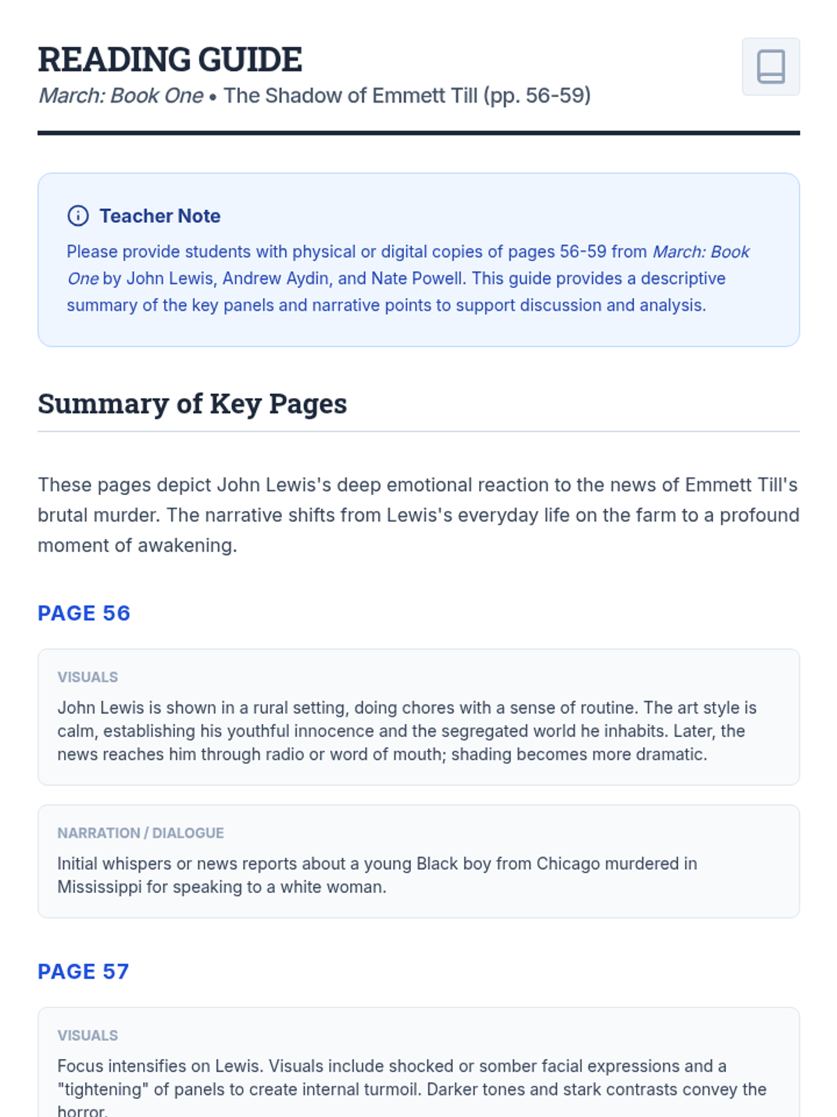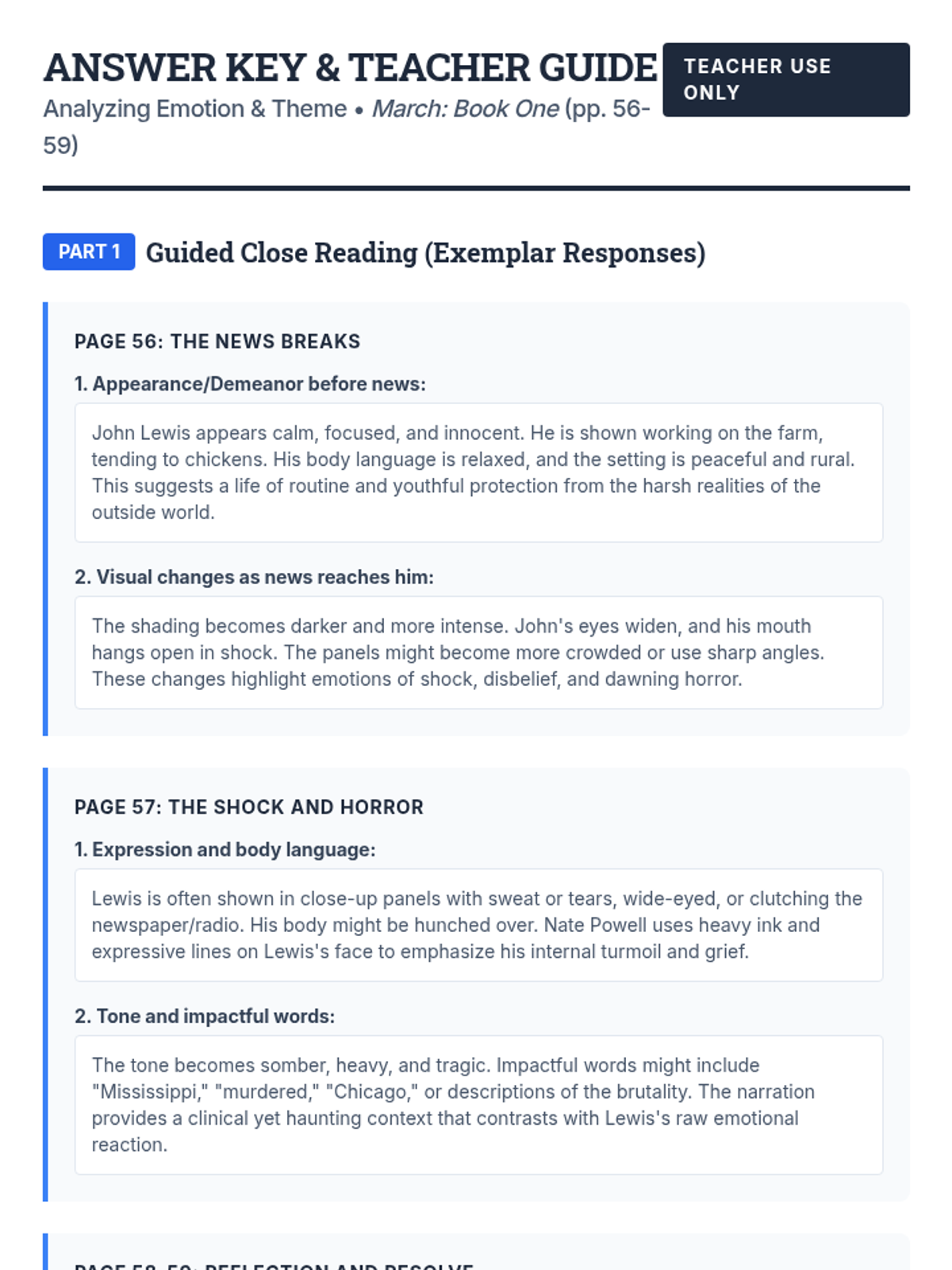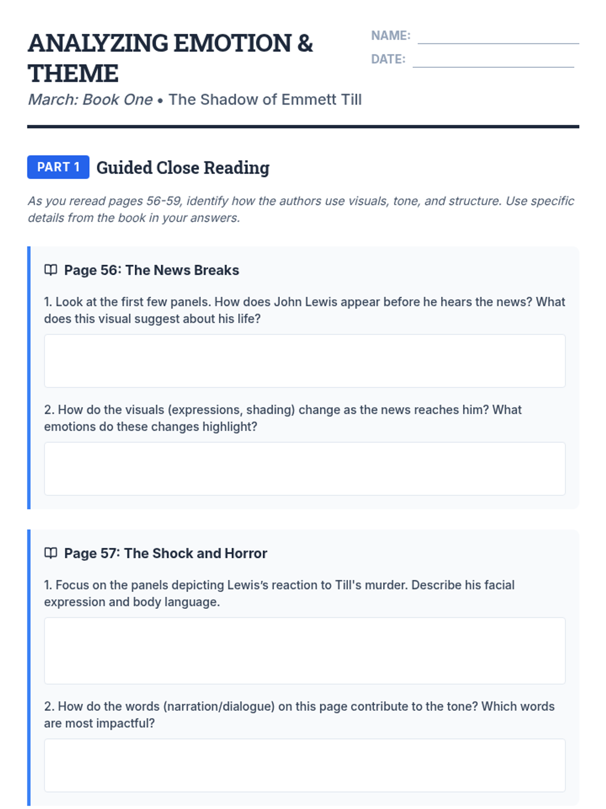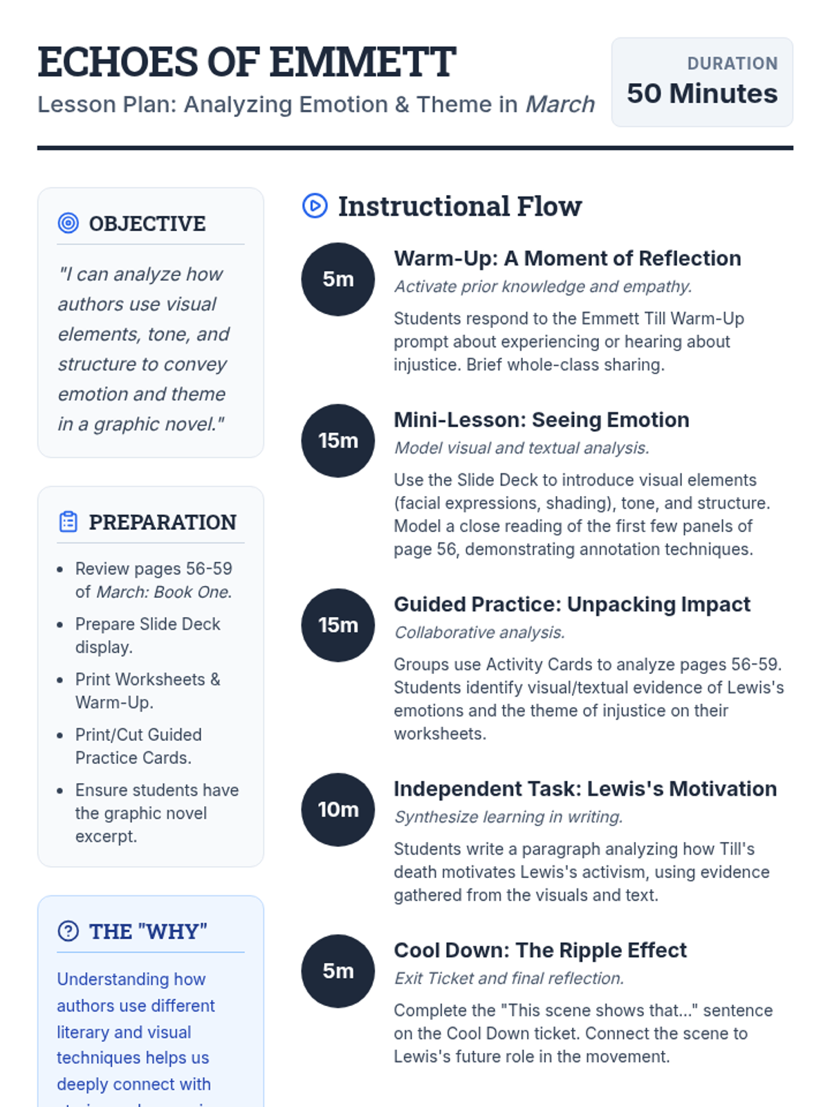 A 50-minute 6th-grade ELA lesson analyzing visual elements, tone, and structure in 'March: Book One', focusing on the profound impact of Emmett Till's death on John Lewis.