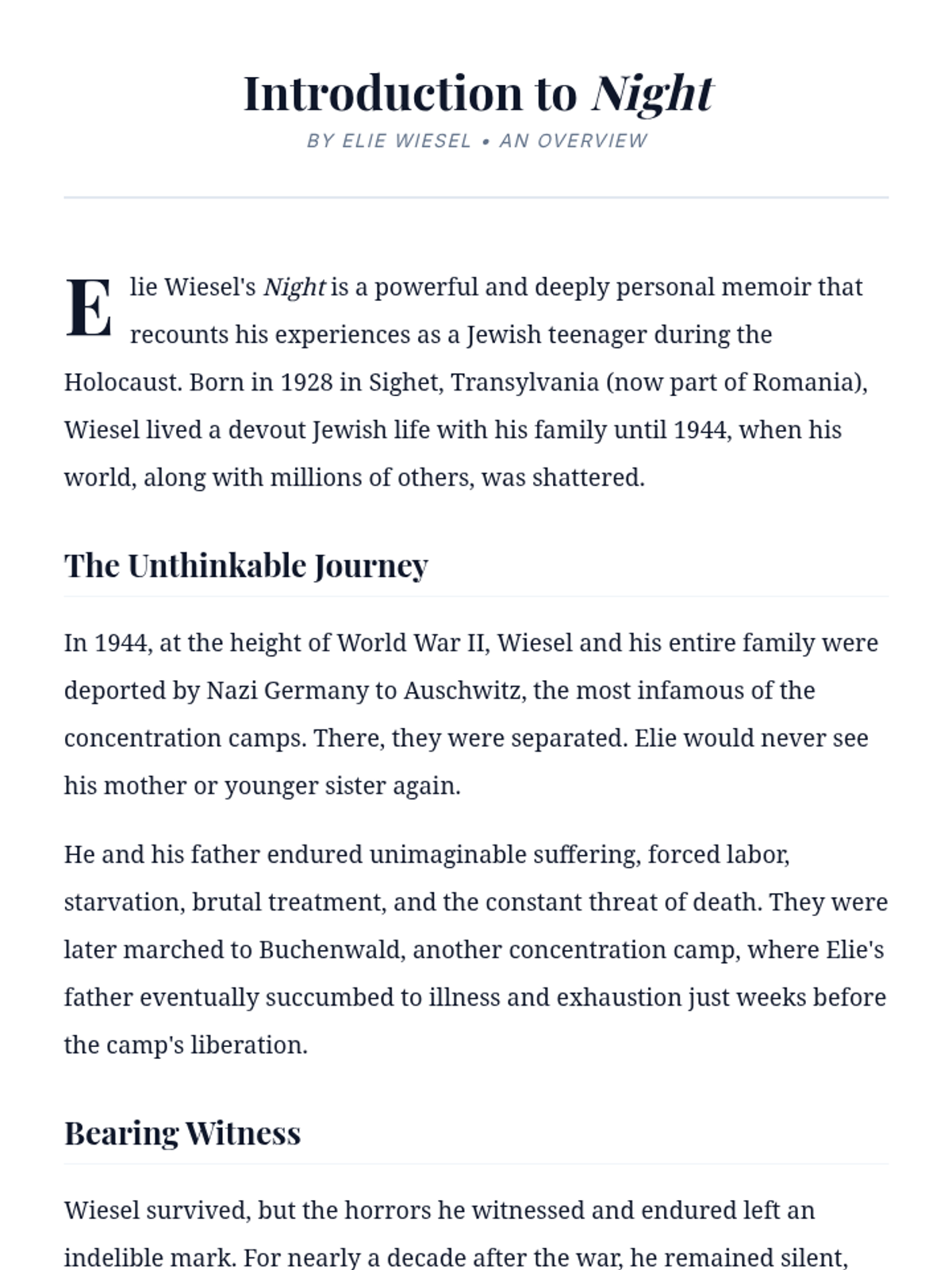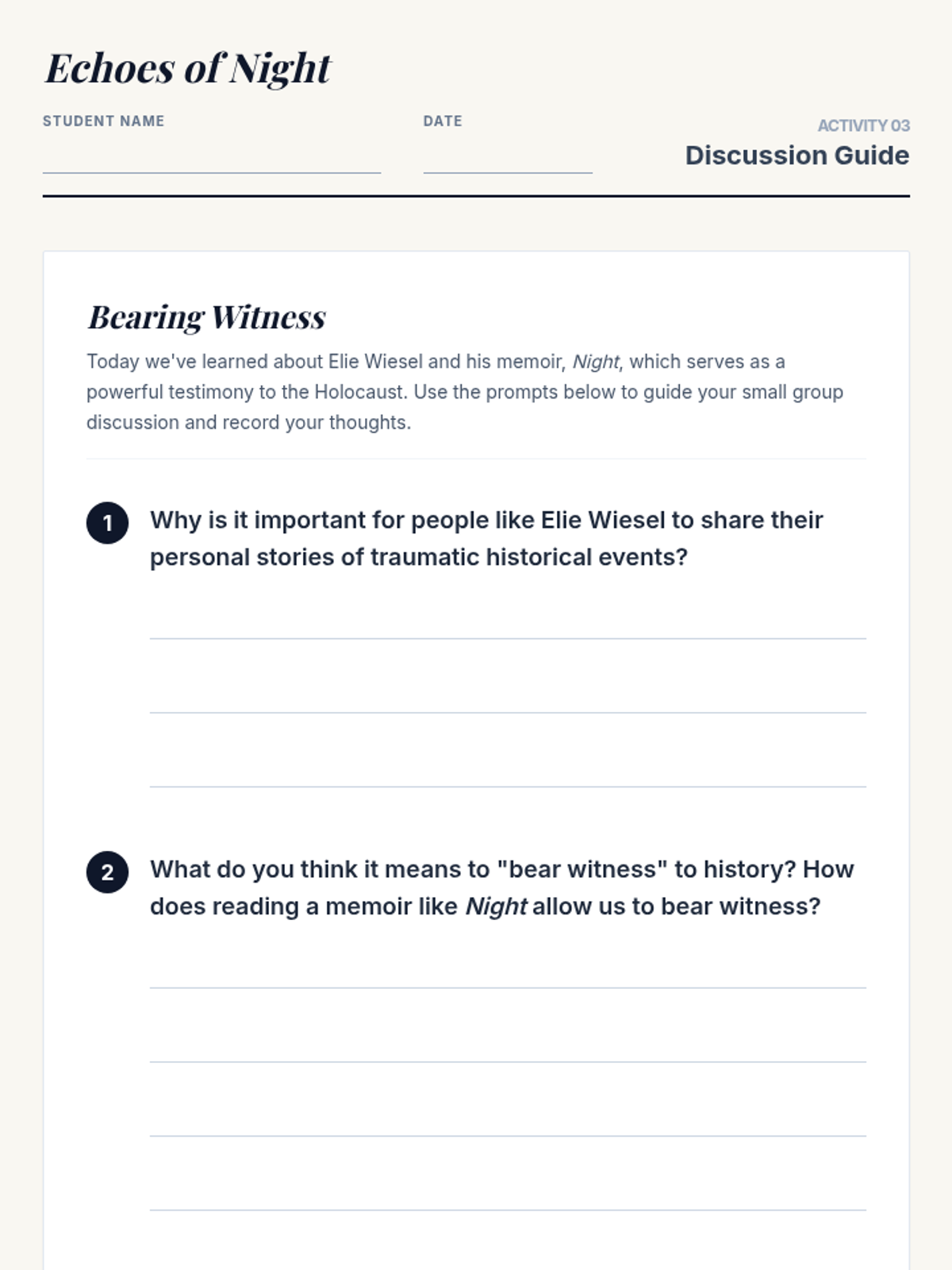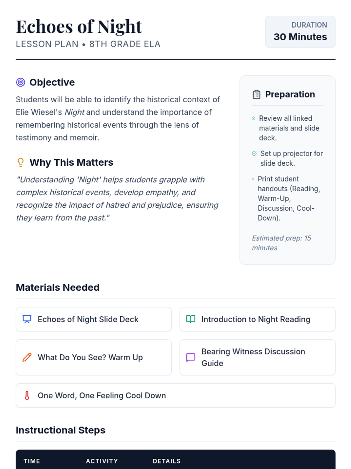 A 30-minute introductory lesson for 8th-grade students exploring Elie Wiesel's 'Night,' focusing on the themes of memory, testimony, and the historical context of the Holocaust.