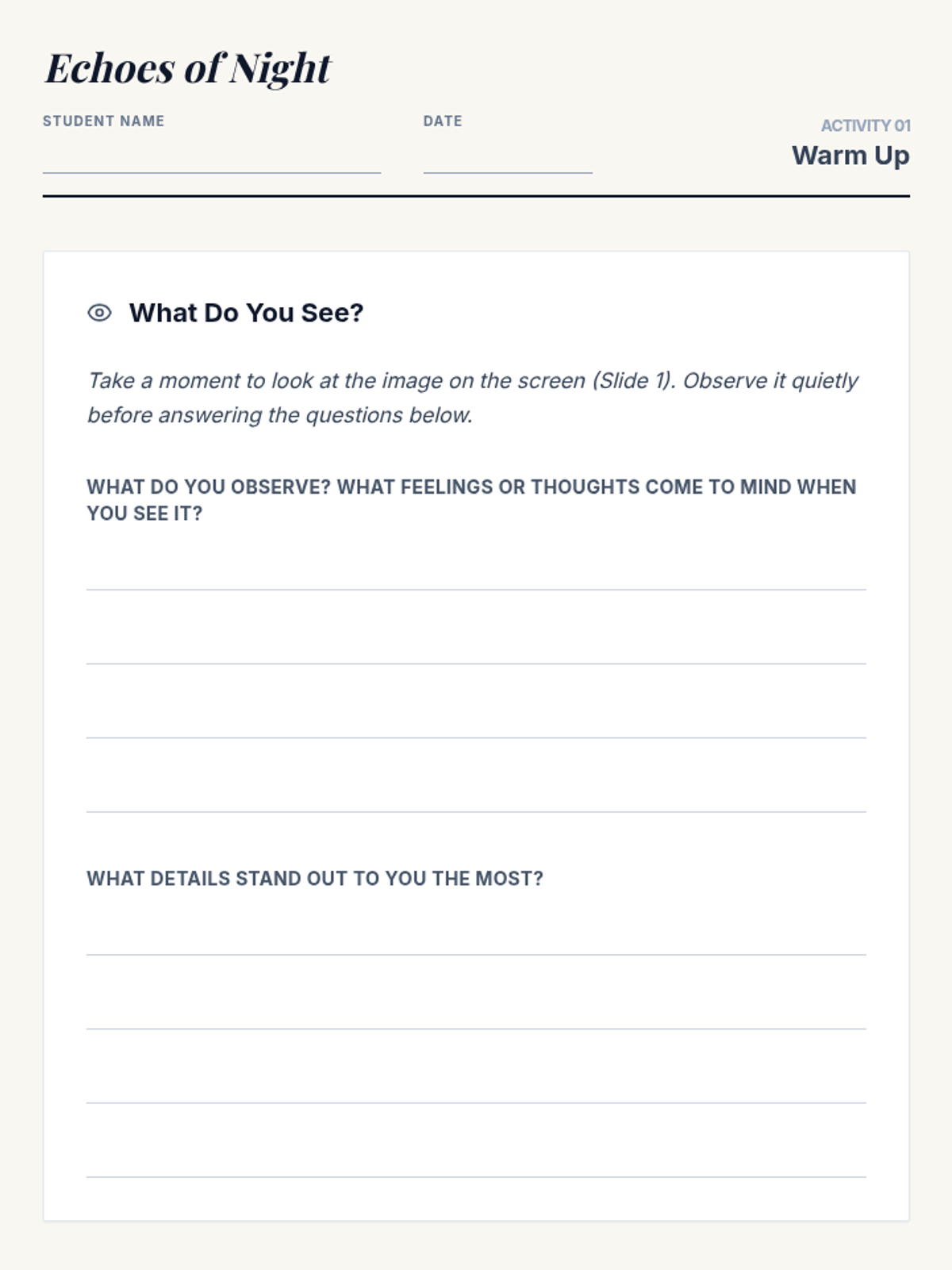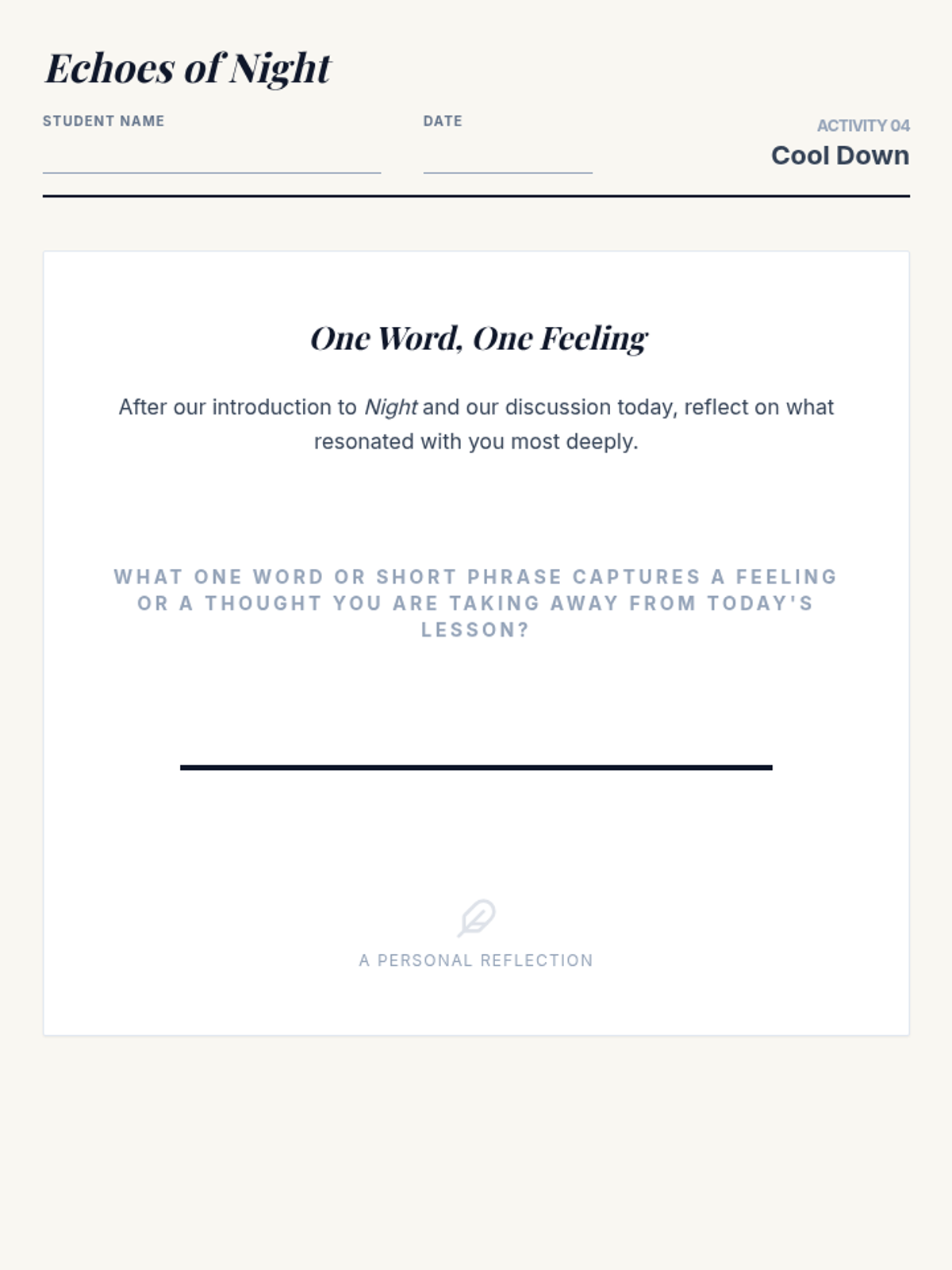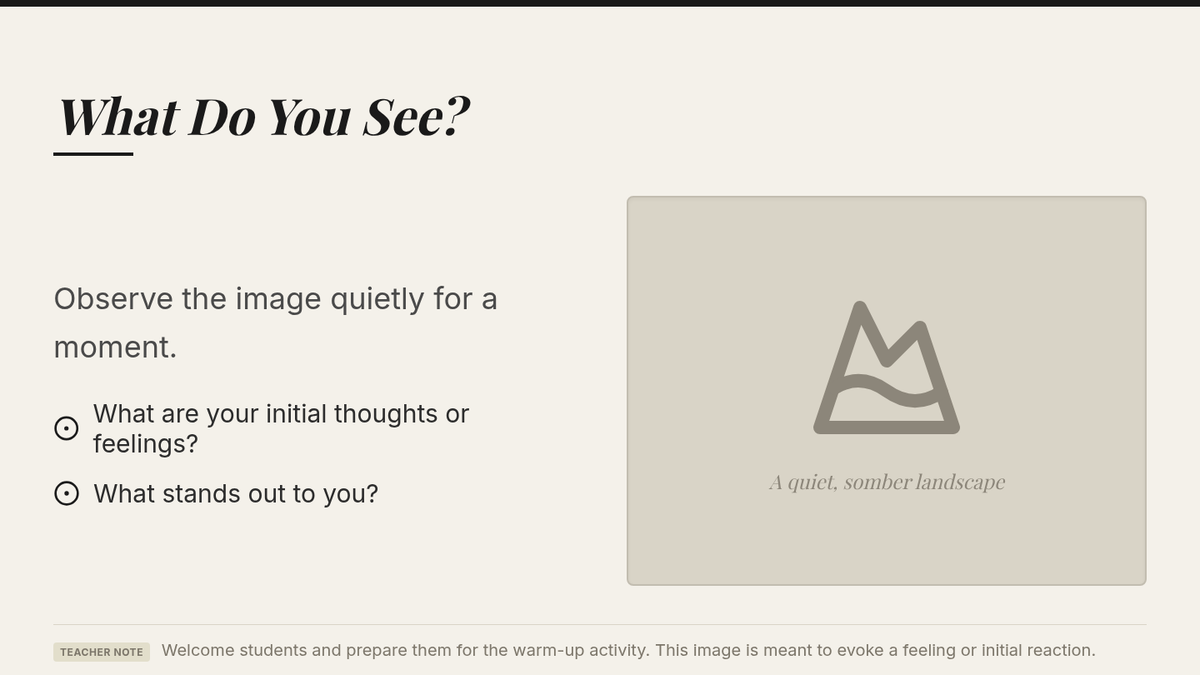 A 30-minute introductory lesson for 8th-grade students exploring Elie Wiesel's 'Night,' focusing on the themes of memory, testimony, and the historical context of the Holocaust.