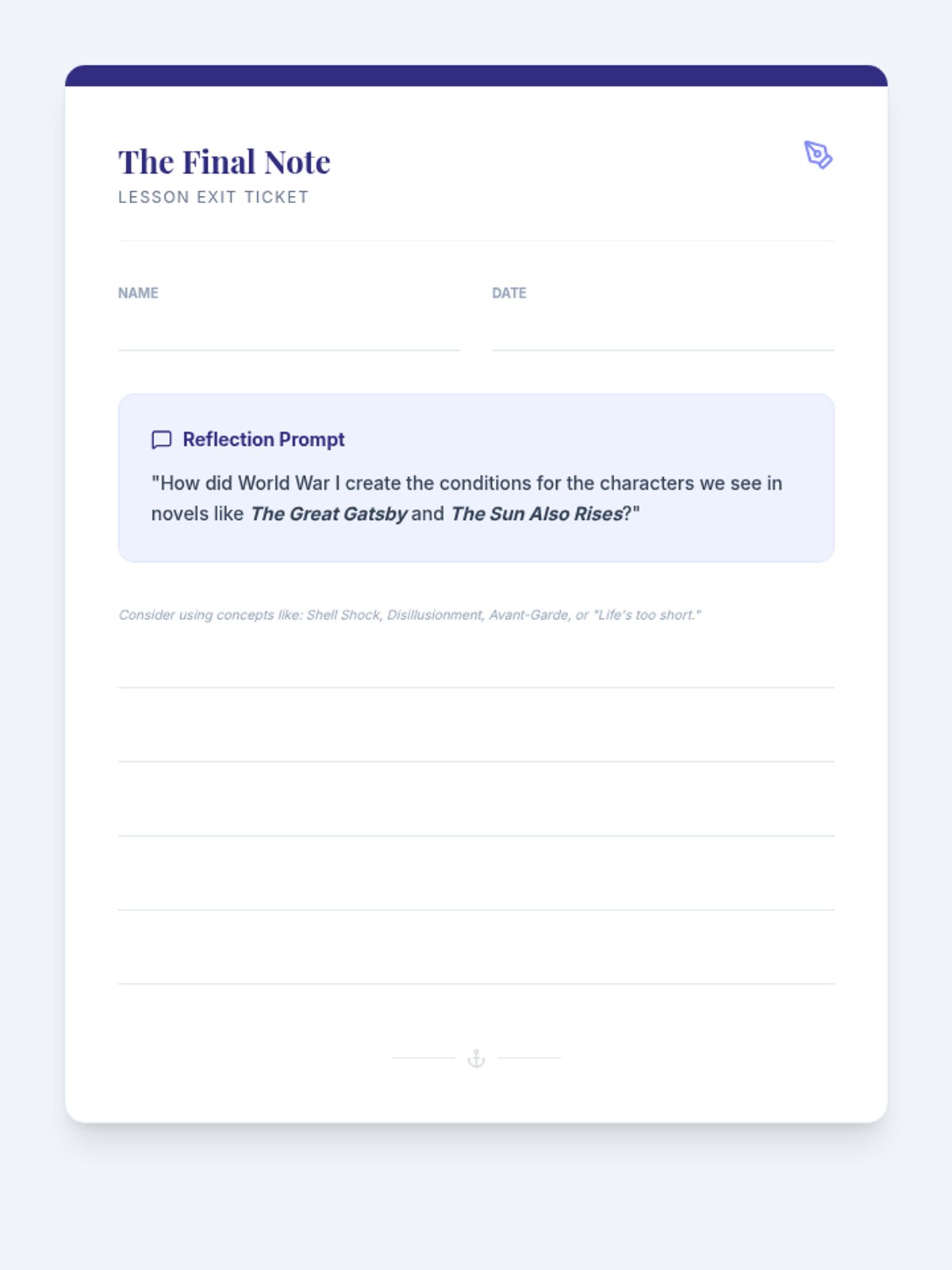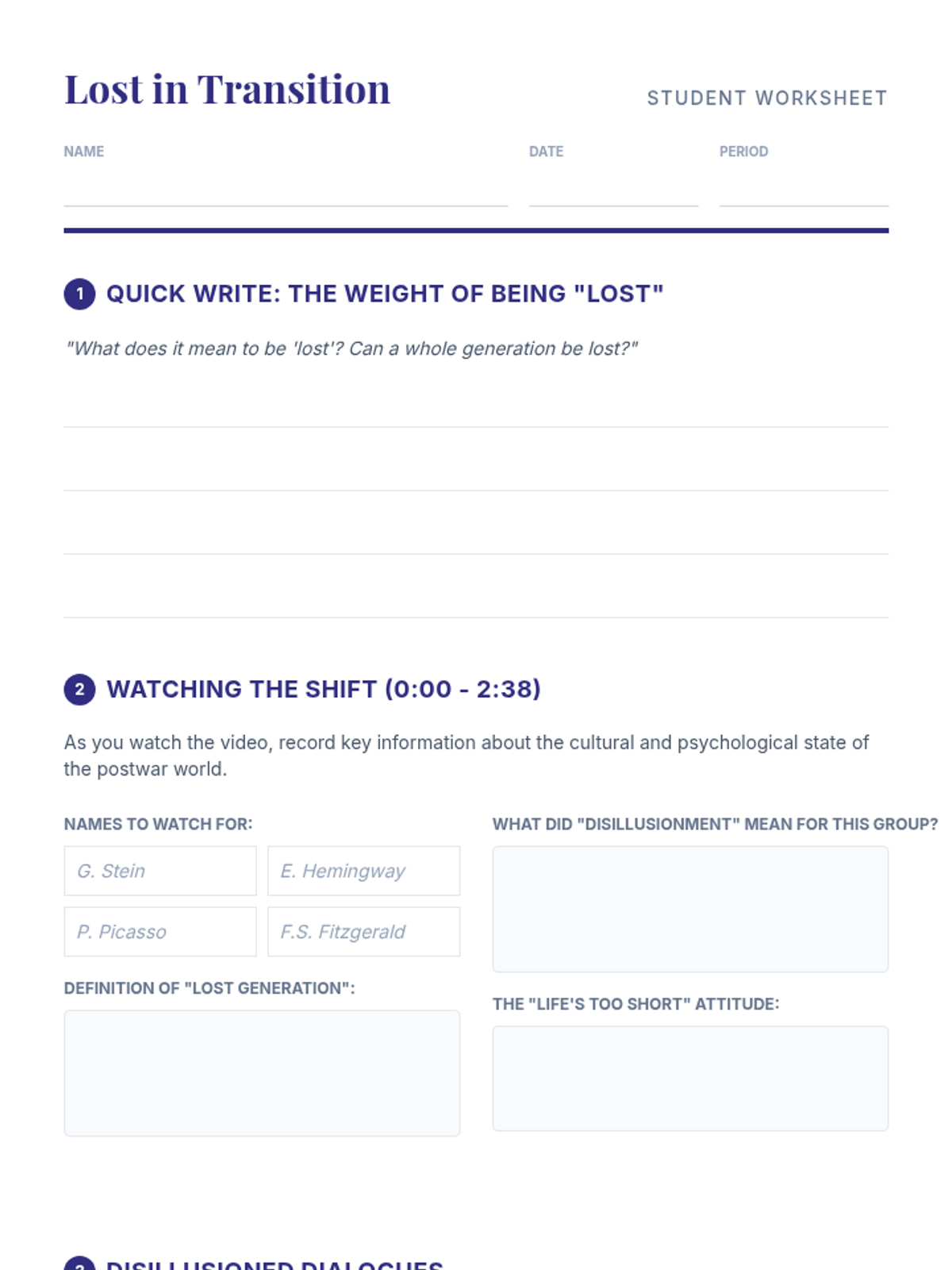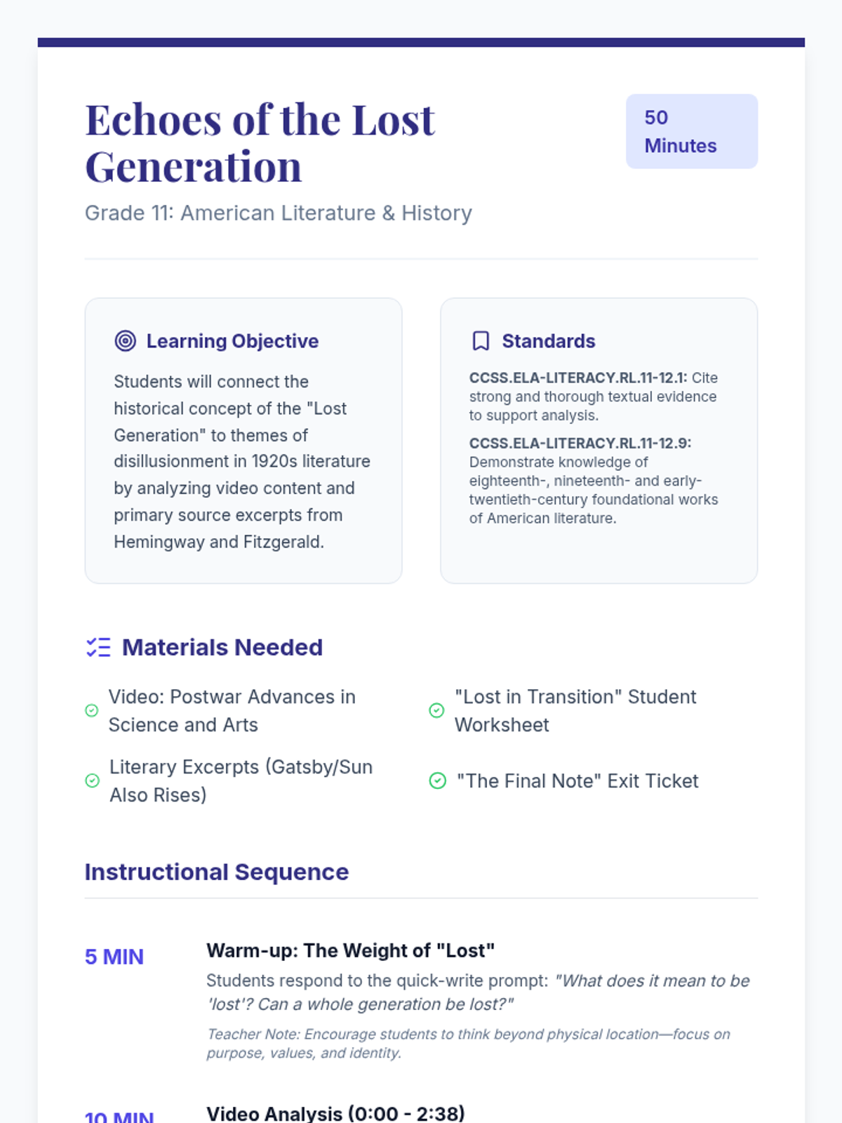 This lesson explores the 'Lost Generation' of the 1920s, connecting the trauma of World War I to the literary themes of disillusionment and hedonism found in the works of Hemingway and Fitzgerald. Students will analyze video content alongside primary literary excerpts to understand the psychological shift of a generation 'rattled' by war.