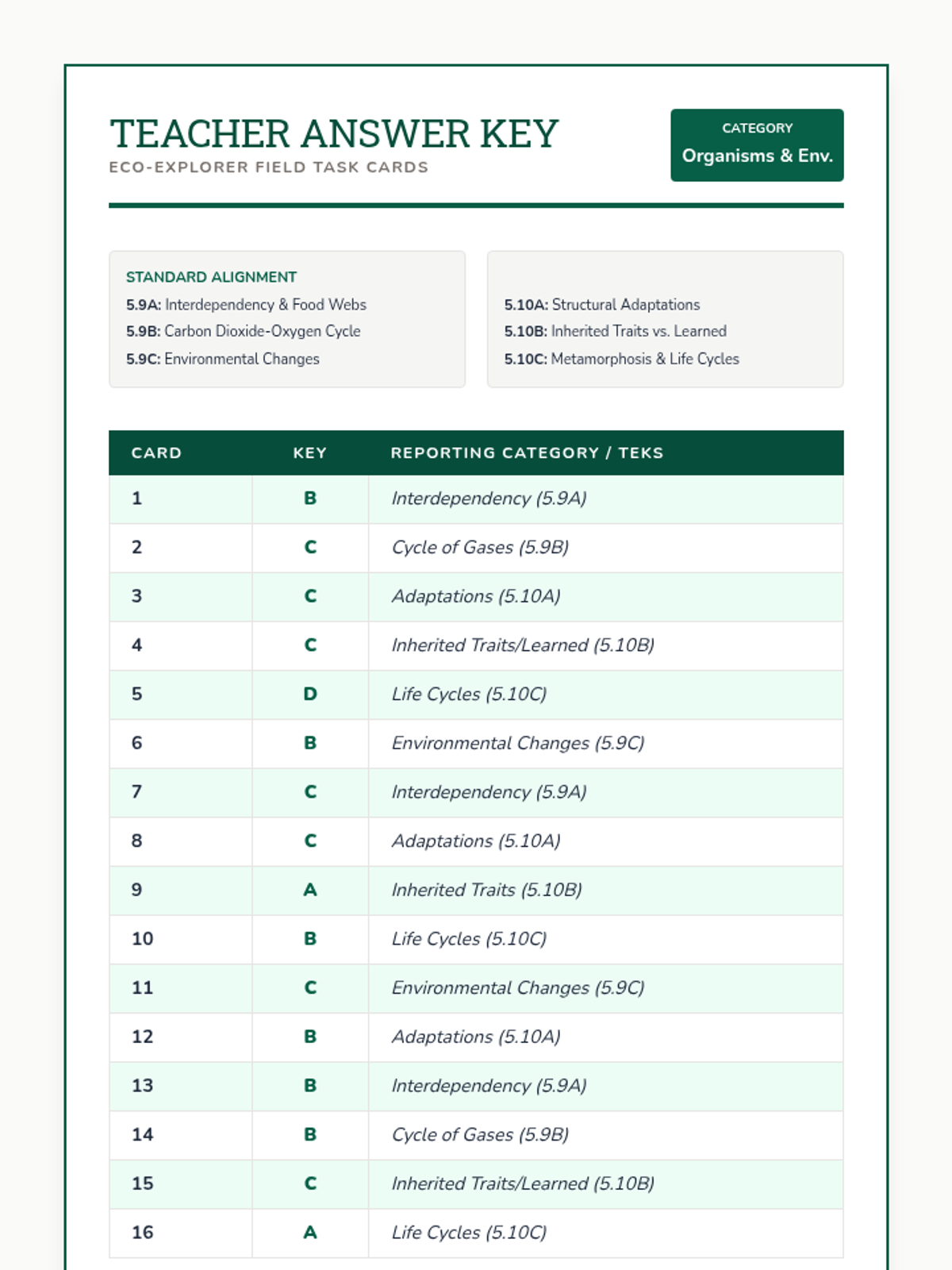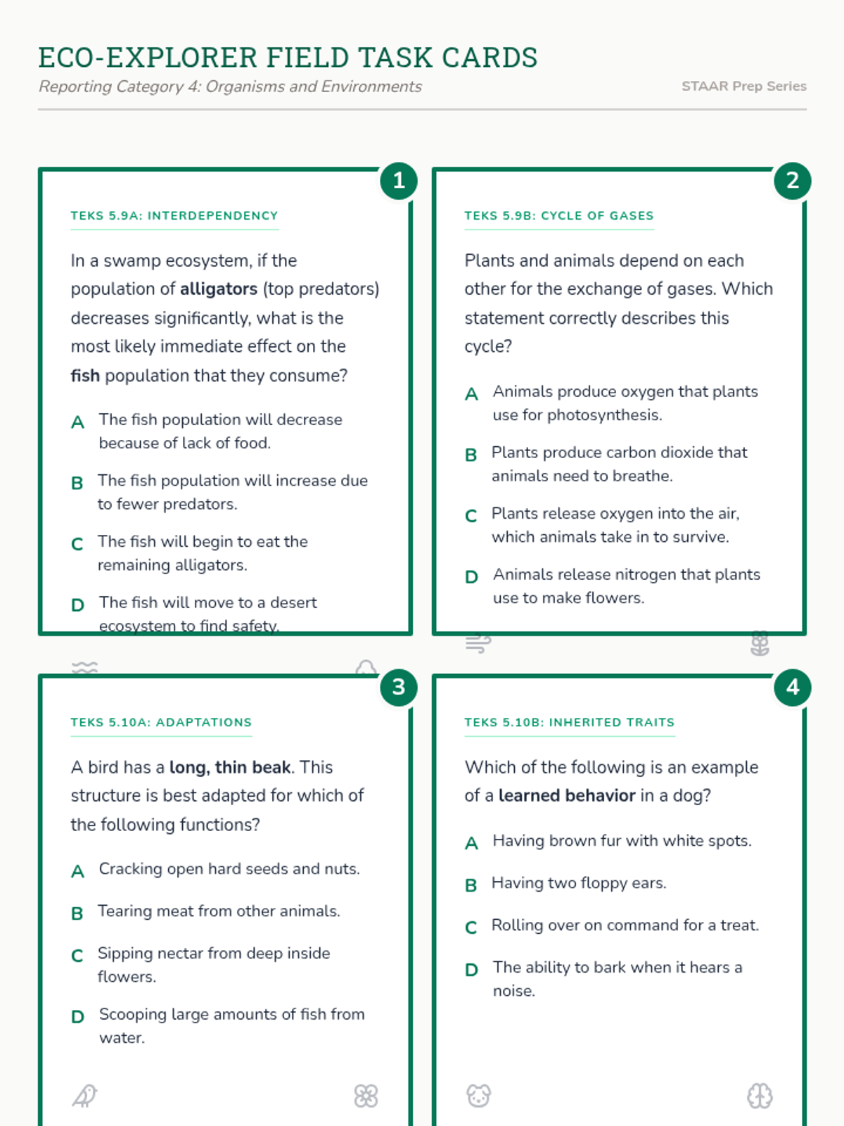 A comprehensive STAAR review set for 5th Grade Science Reporting Category 4 (Organisms and Environments), featuring task cards, recording sheets, and answer keys themed as naturalist field notes.