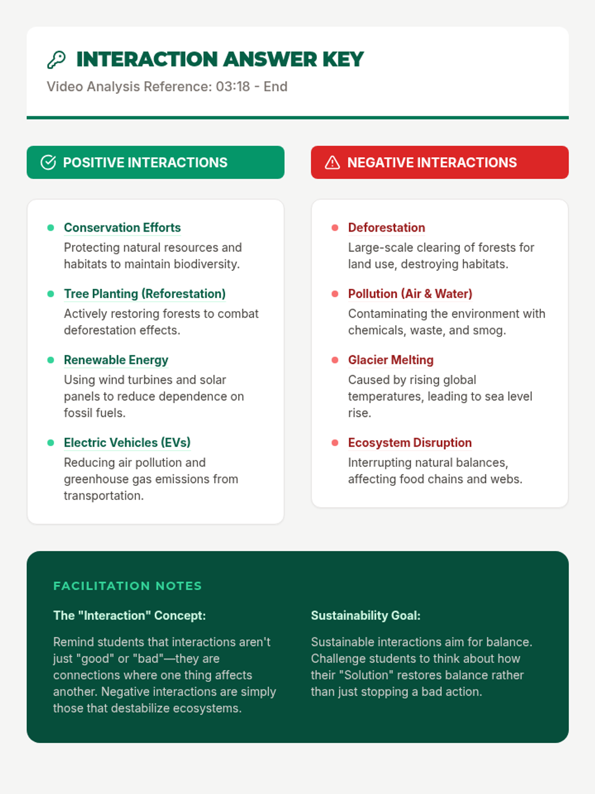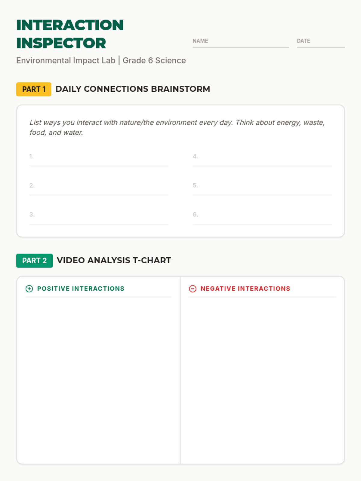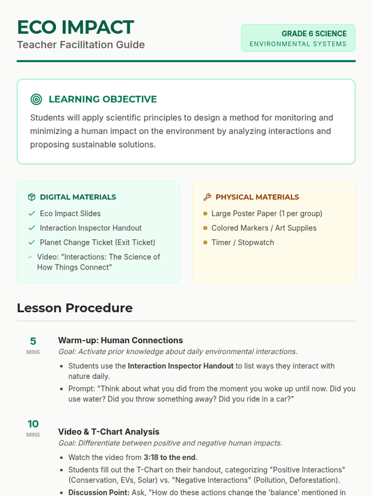 Students explore how human interactions affect the environment, analyze positive and negative impacts through video, and design creative solutions to minimize environmental harm.