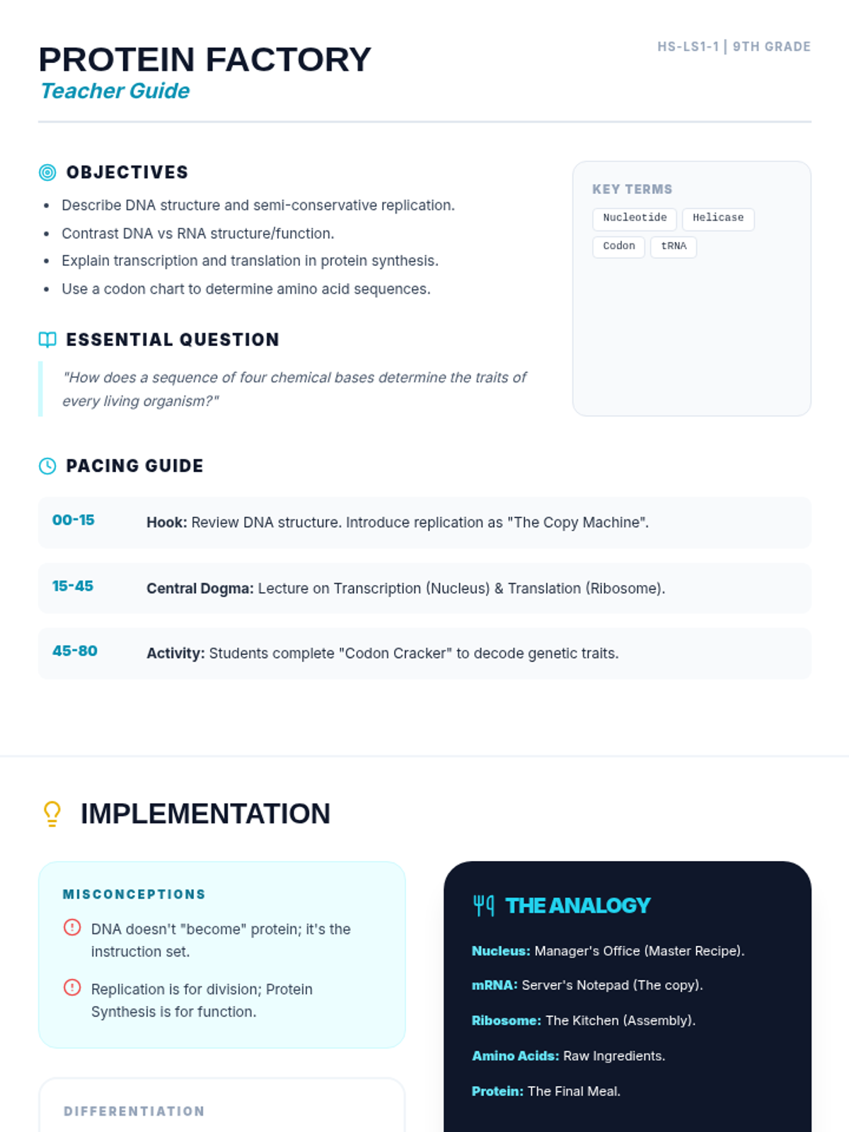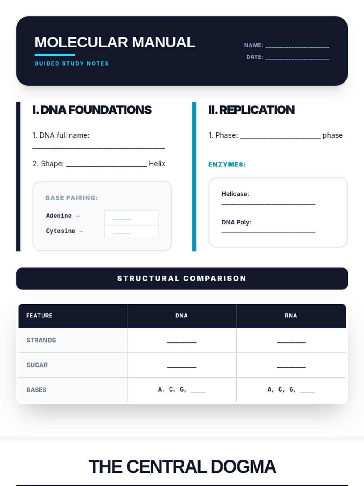 A comprehensive lesson covering the Central Dogma of biology, from the structure of DNA and its replication to the process of protein synthesis through transcription and translation.