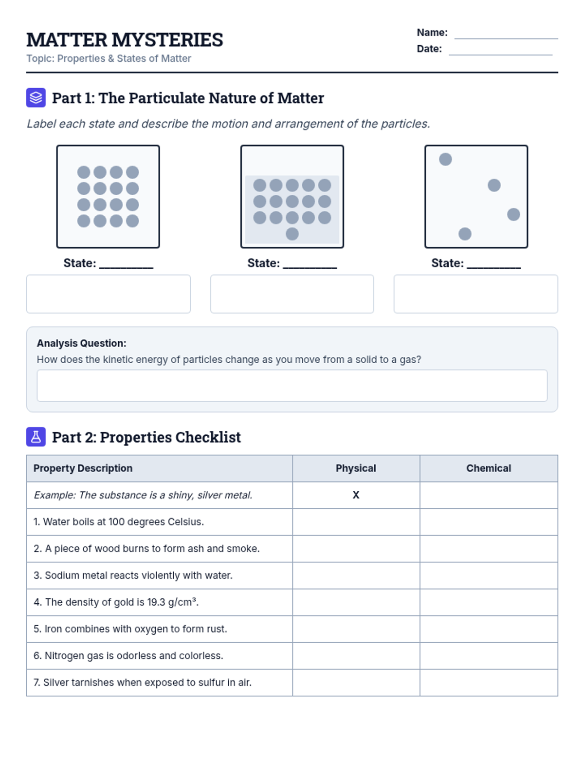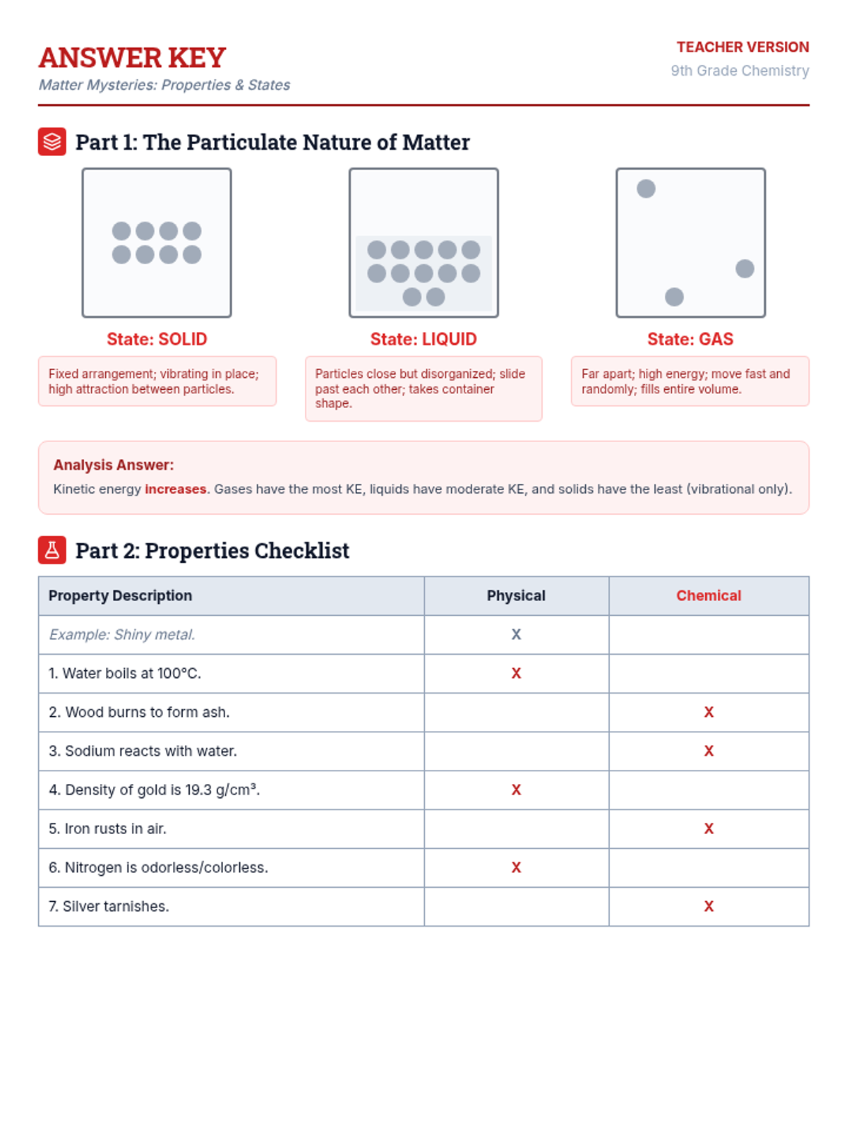 A comprehensive introduction to the properties and states of matter for 9th-grade chemistry, focusing on physical vs. chemical properties and particle behavior in solids, liquids, and gases.