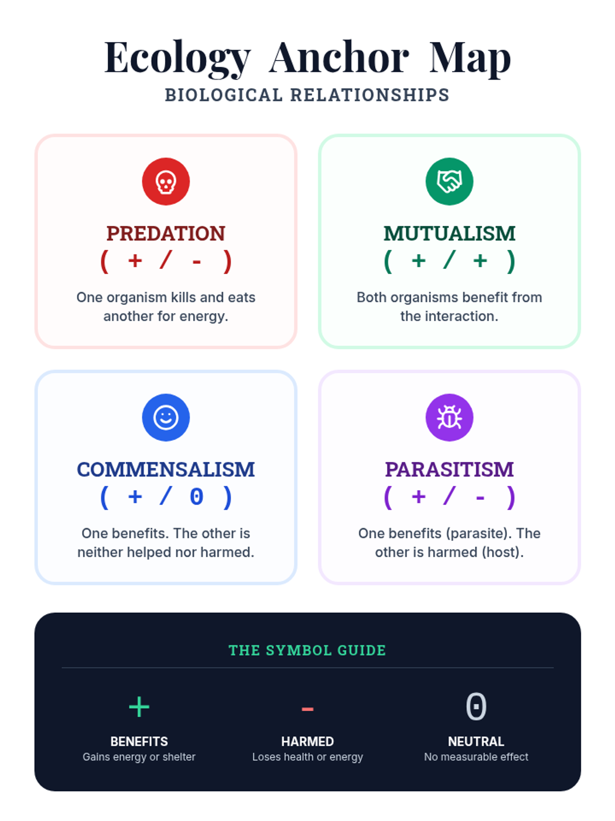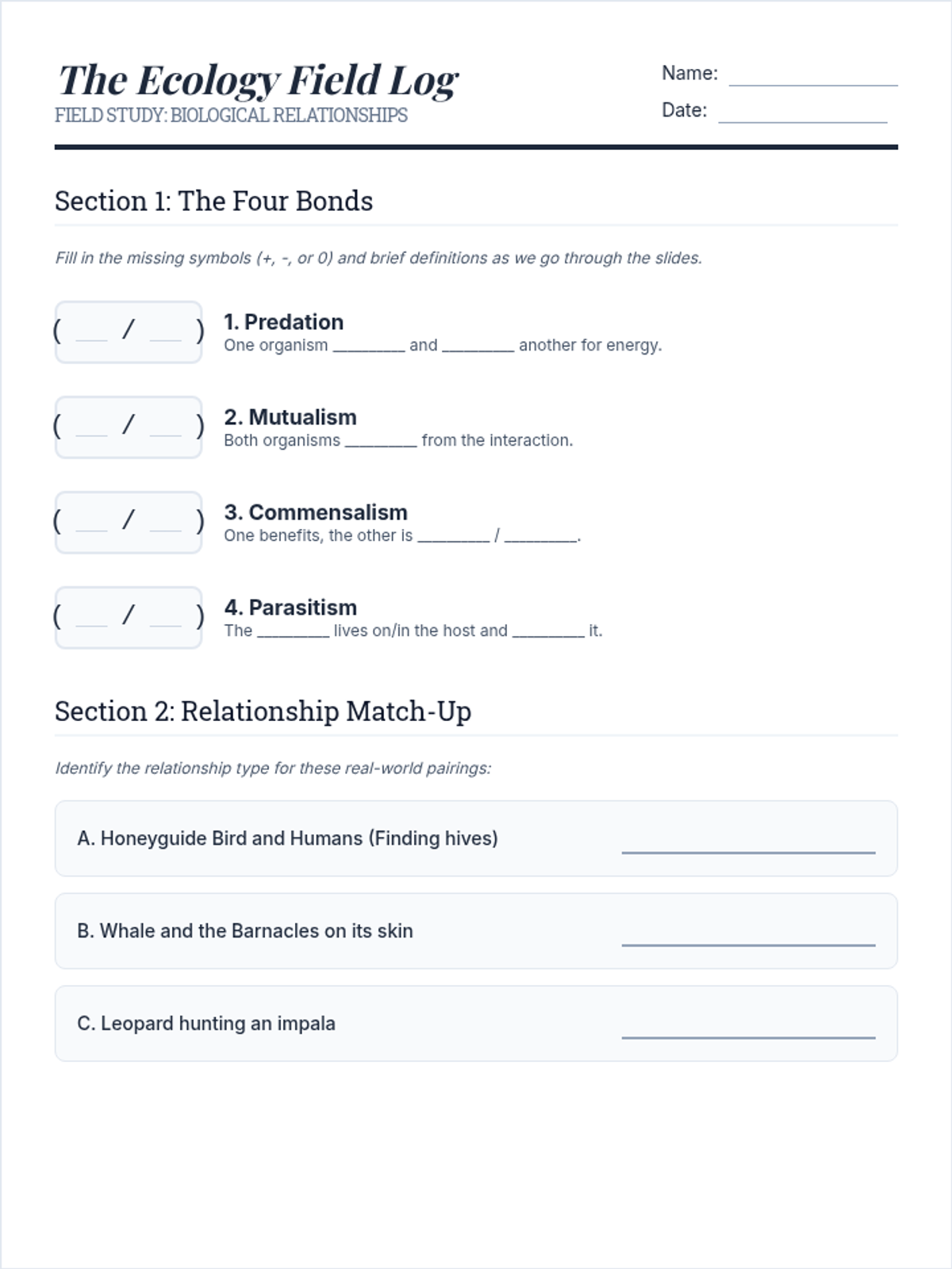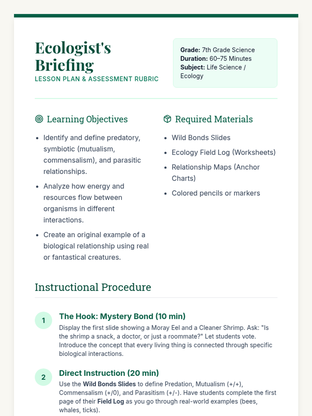 In this lesson, 7th-grade students explore biological relationships—predation, mutualism, commensalism, and parasitism—through real-world biological examples. Students apply their knowledge by designing a relationship between either real or fantastical creatures.
