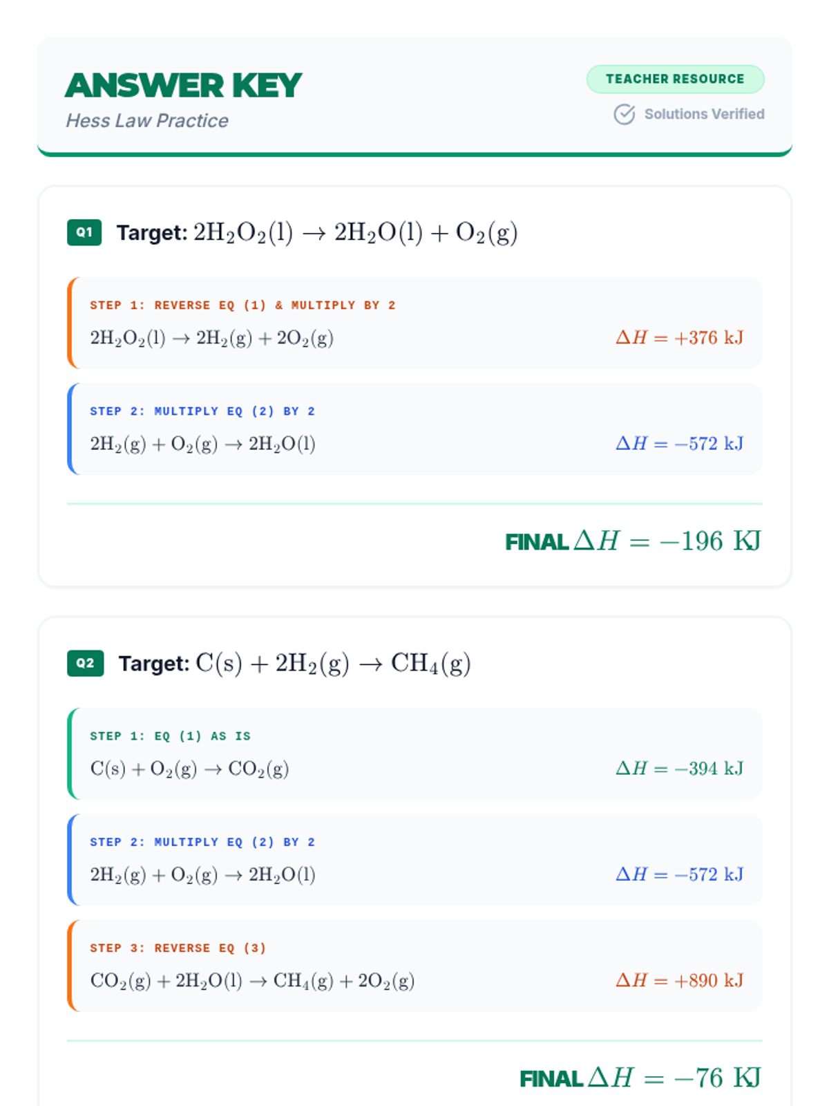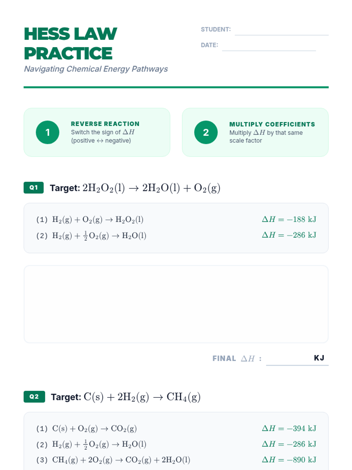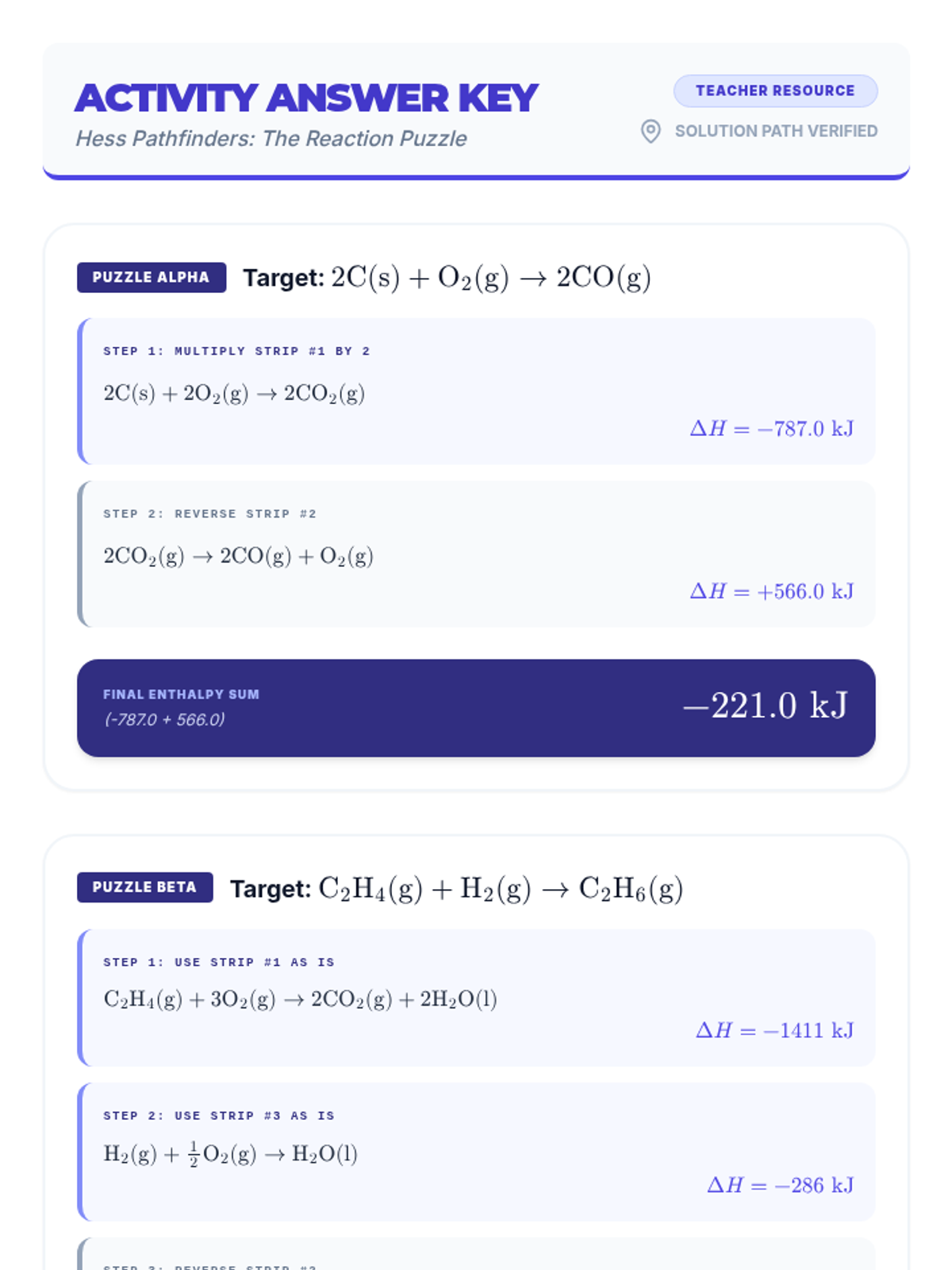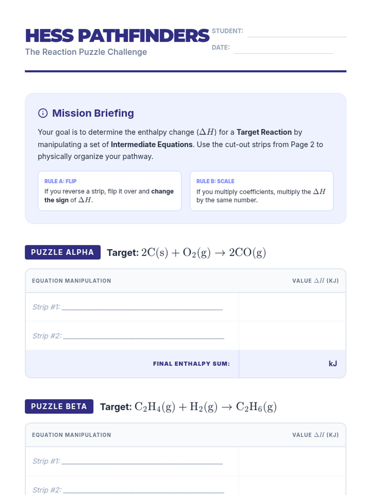 Students discover the additive nature of enthalpy through a hands-on chemical puzzle, using Hess's Law to calculate enthalpy changes for complex reactions using multiple intermediate steps.