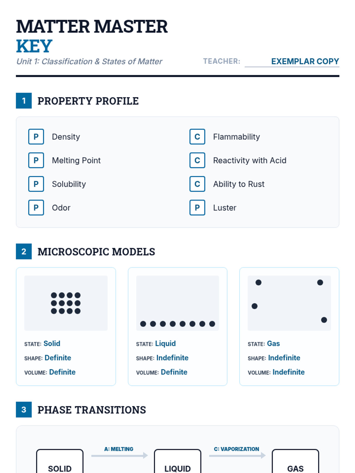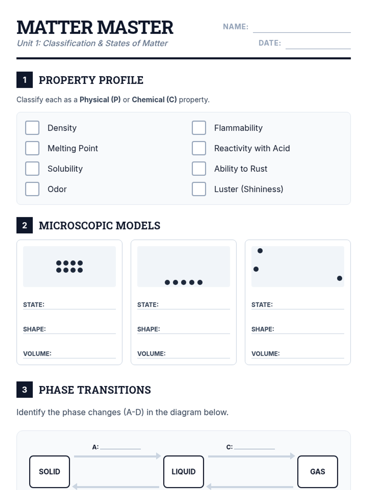 A comprehensive review of physical and chemical properties, as well as the behavior and characteristics of solids, liquids, and gases.