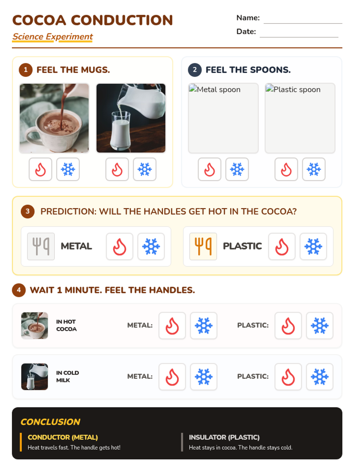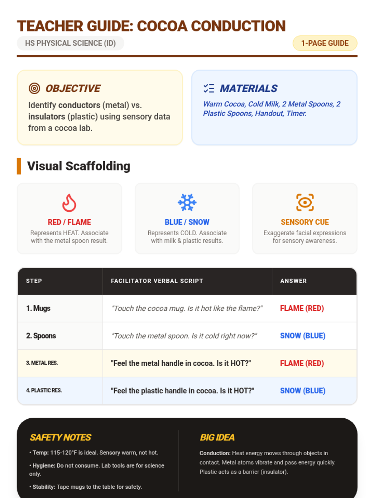 A hands-on science experiment exploring heat conduction using hot and cold chocolate milk with metal and plastic spoons. Designed specifically for high school students with intellectual disabilities with visual supports and simplified response formats.