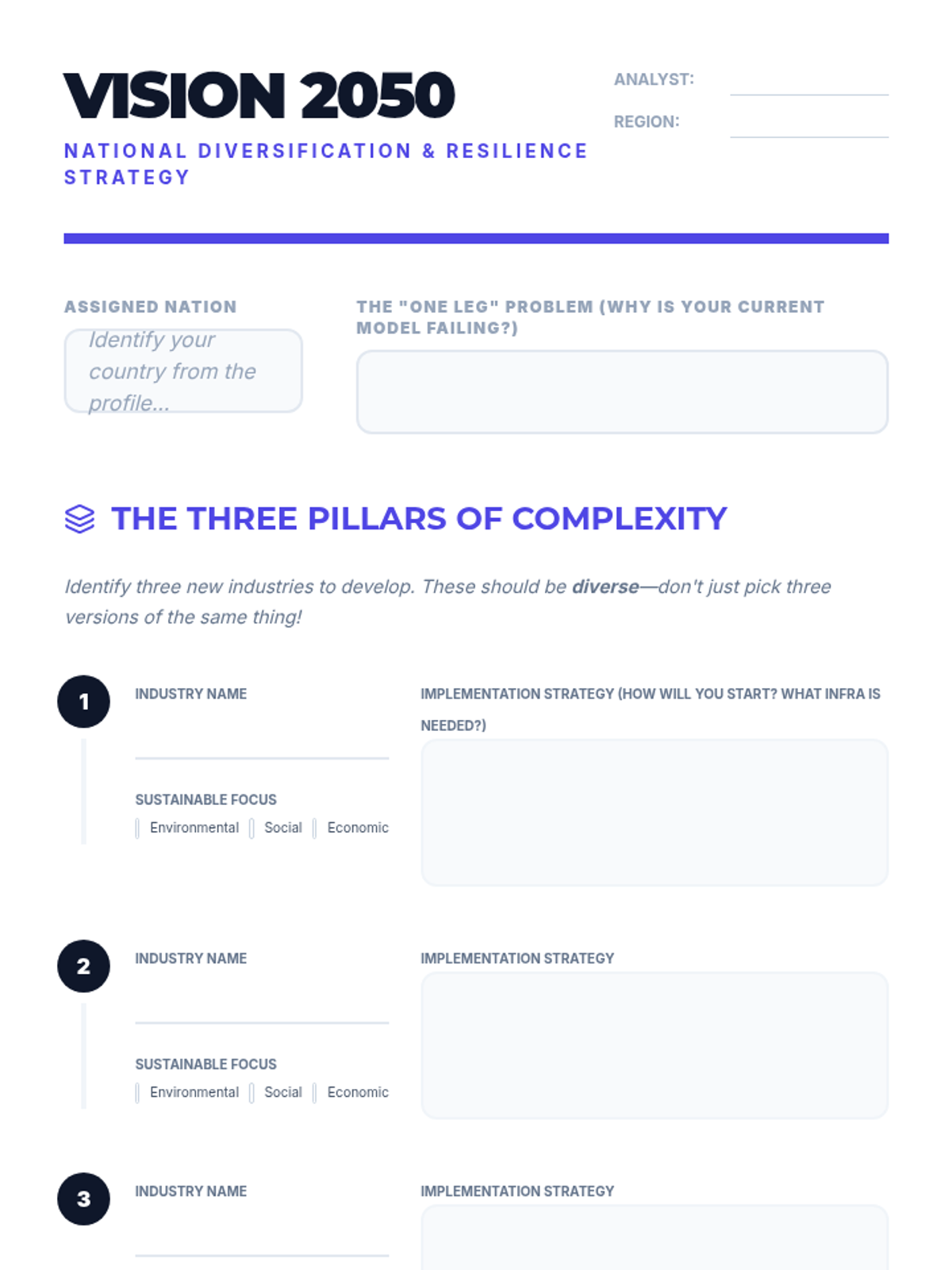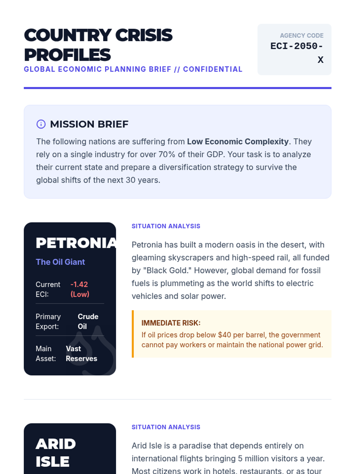 Students analyze the Economic Complexity Index (ECI) and the risks of single-industry reliance, culminating in a 'Vision 2050' diversification strategy for a fictional economy.