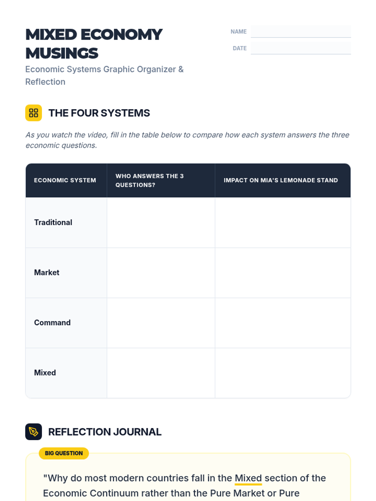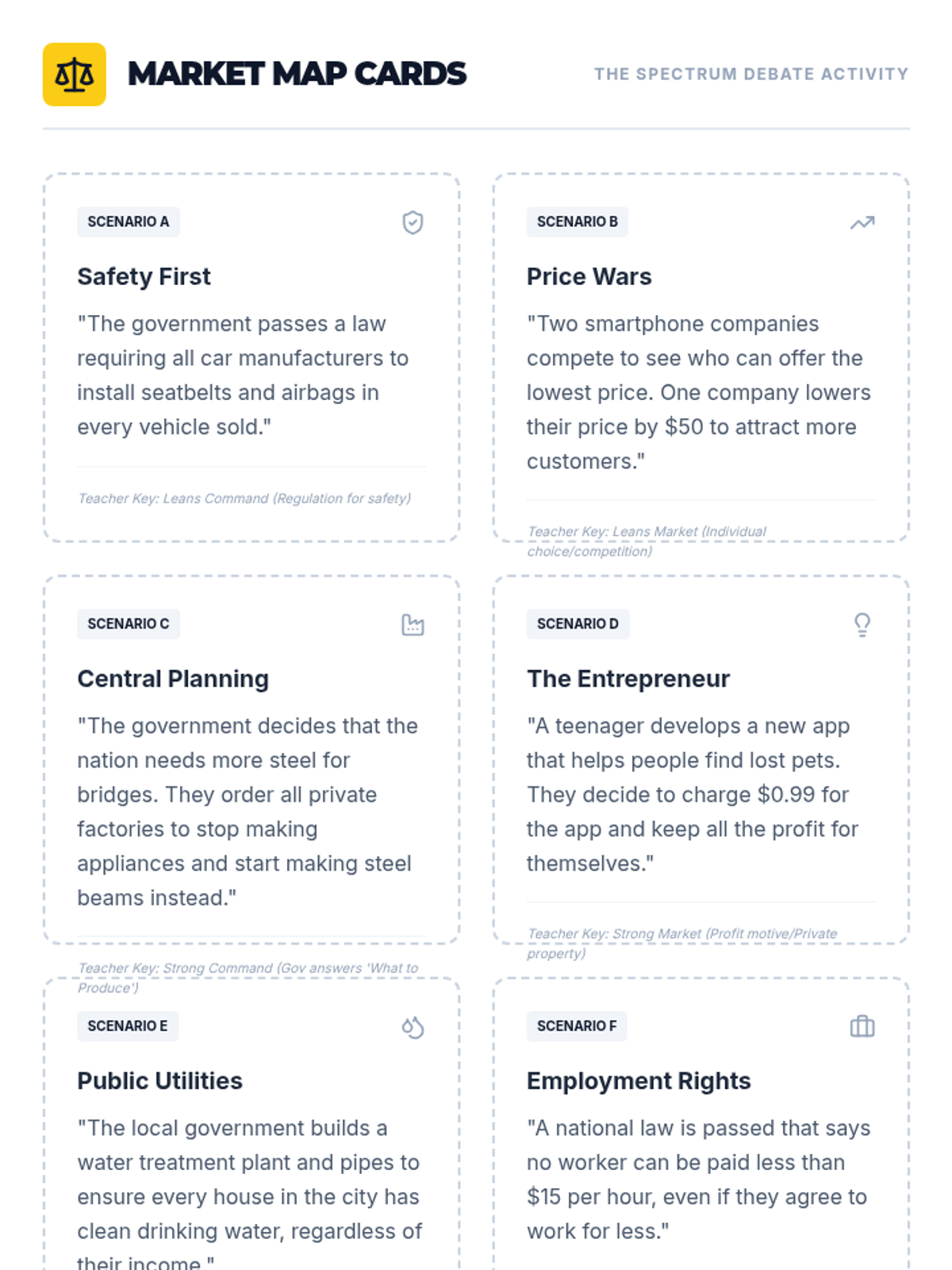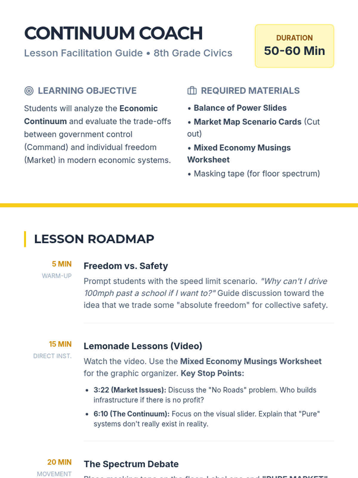 An 8th Grade Civics lesson exploring the economic continuum through the lens of a lemonade stand business. Students examine the trade-offs between government regulation and individual economic freedom, culminating in a movement-based 'Spectrum Debate' activity.