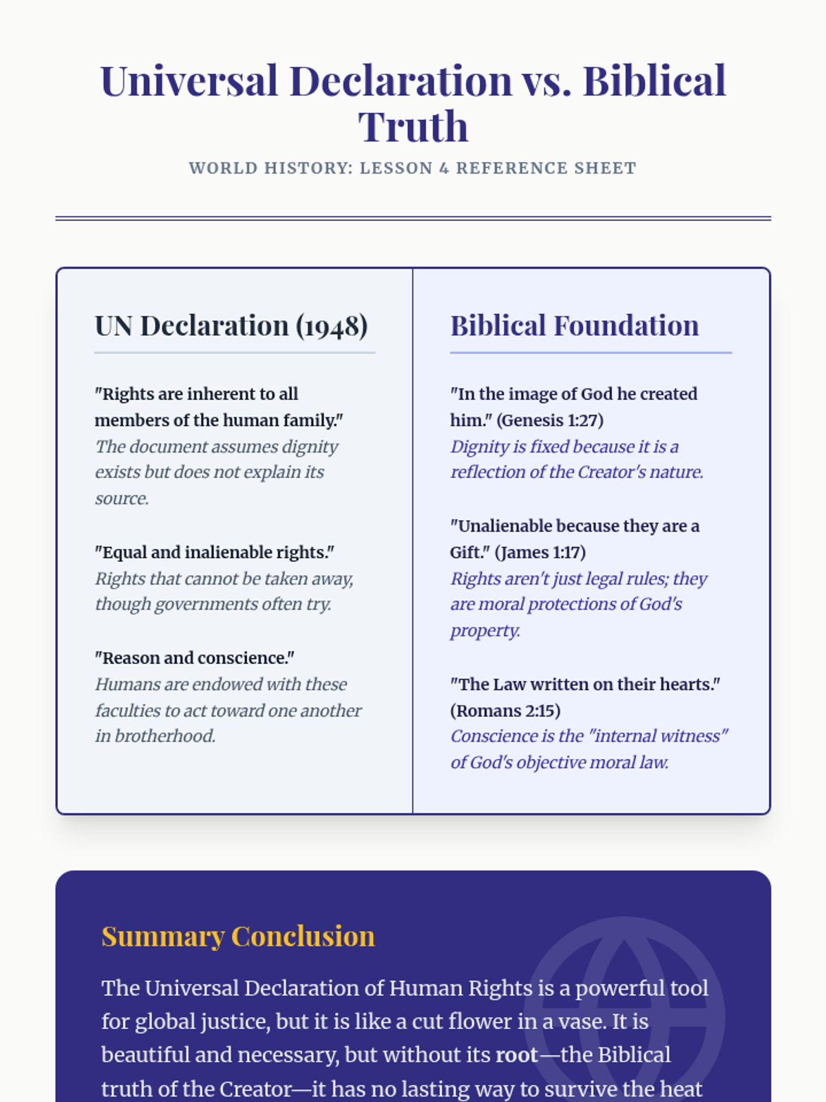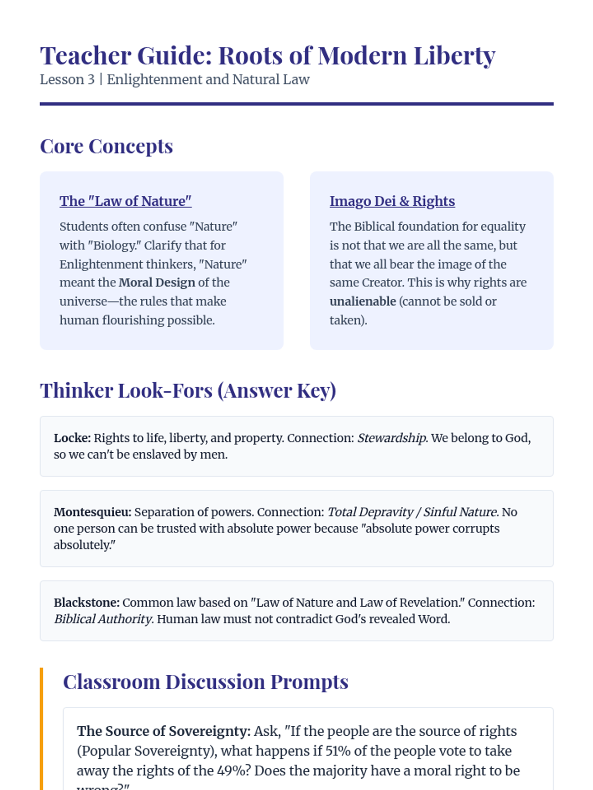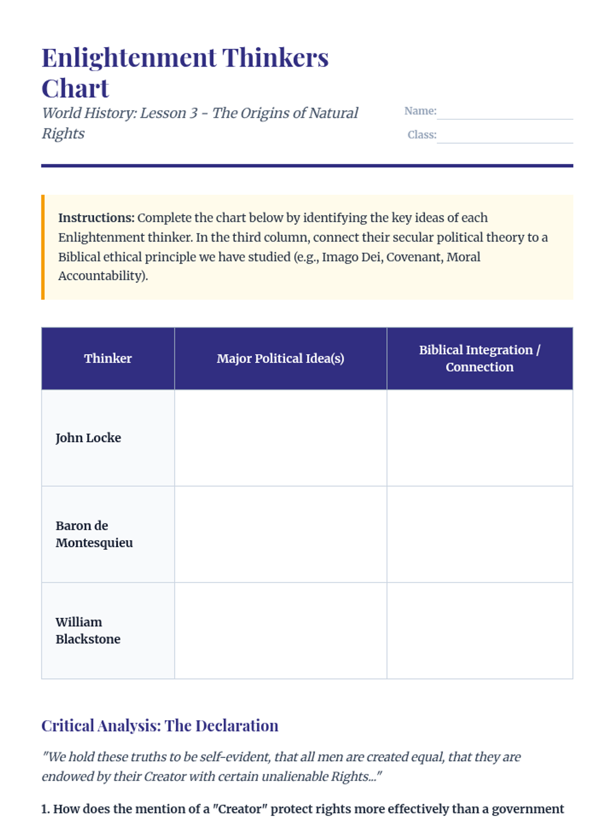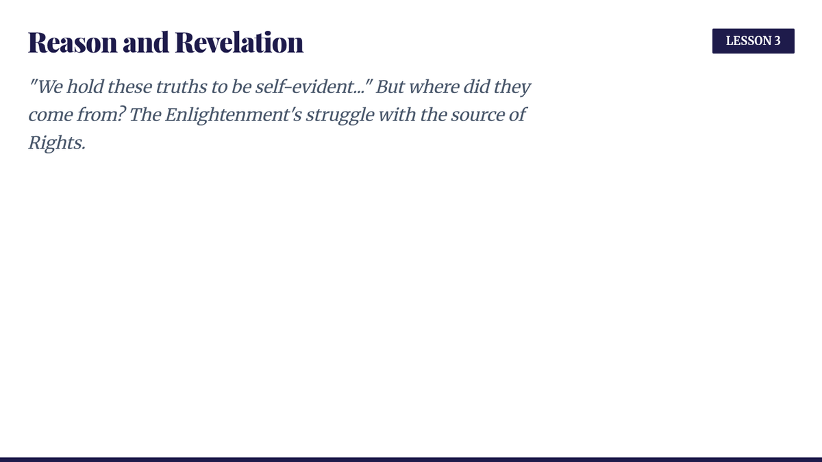 Analyzes the Enlightenment's emphasis on reason and natural rights, contrasting secular humanism with the Biblical foundation of "unalienable rights" derived from being made in the image of God.