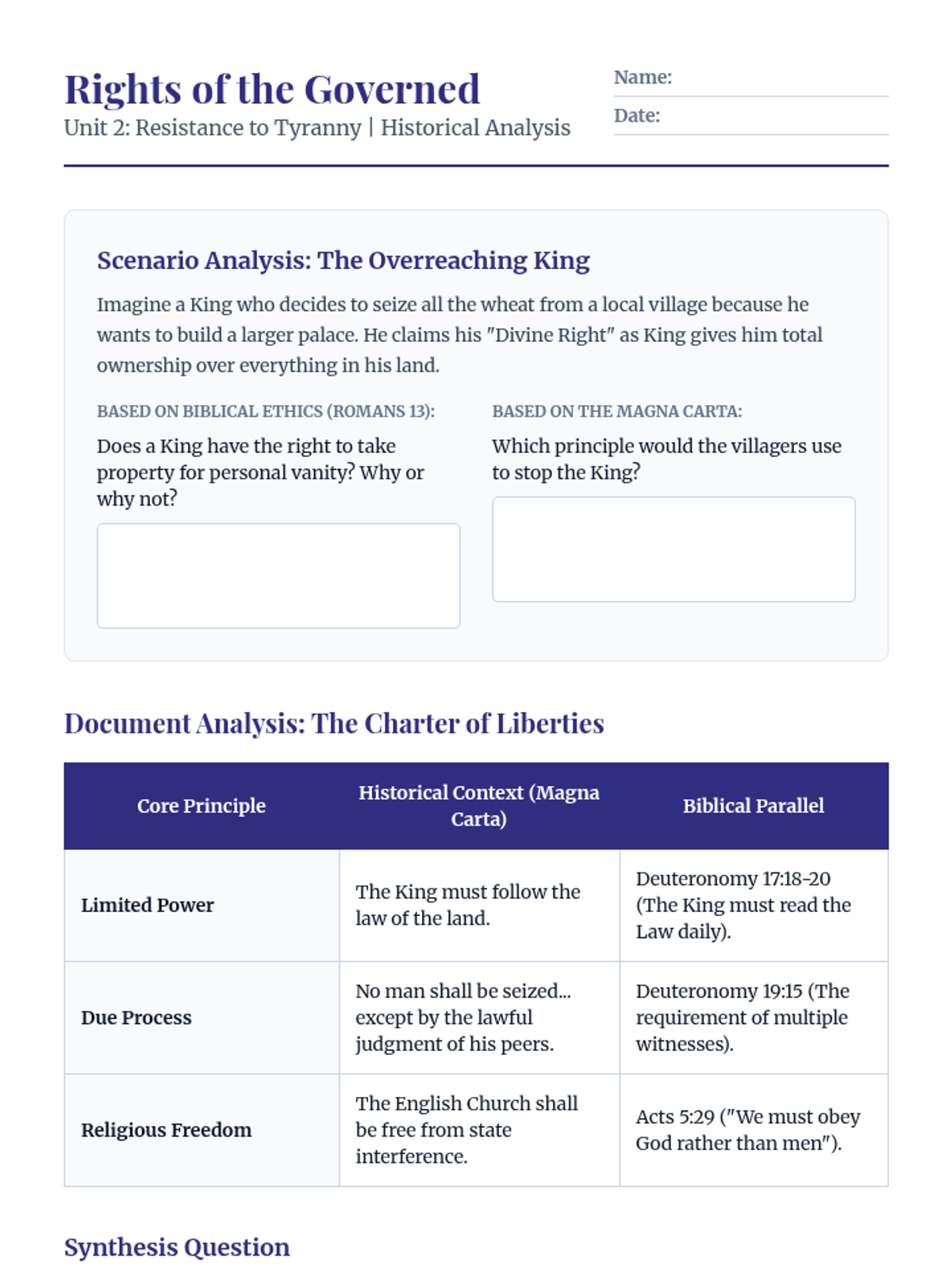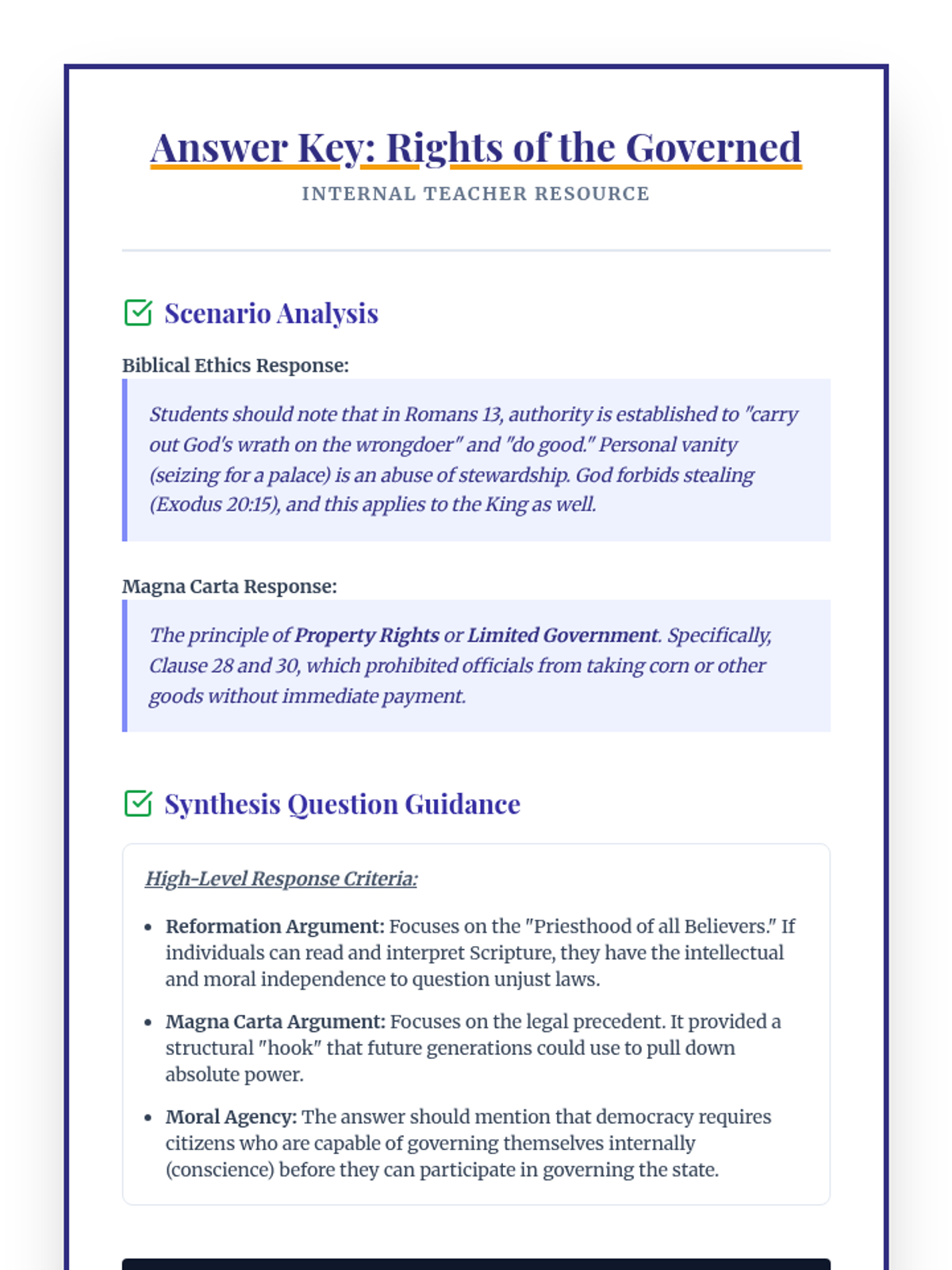 Examines the shift from absolute monarchy to constitutional law through the Magna Carta and the Protestant Reformation. Focuses on the Biblical concept of the priesthood of all believers and its impact on individual liberty and accountability.
