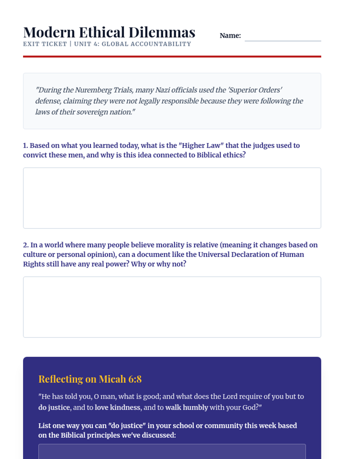 Investigates the ethical crises of the 20th century (World Wars and the Holocaust) and the subsequent development of international law. Students evaluate the necessity of a moral anchor in a postmodern world.
