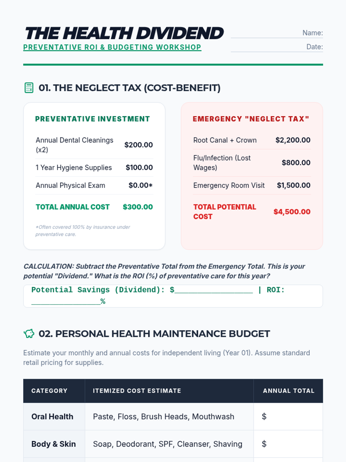 Students conduct a cost-benefit analysis of preventative hygiene and develop a personal health maintenance budget for their first year of independence.