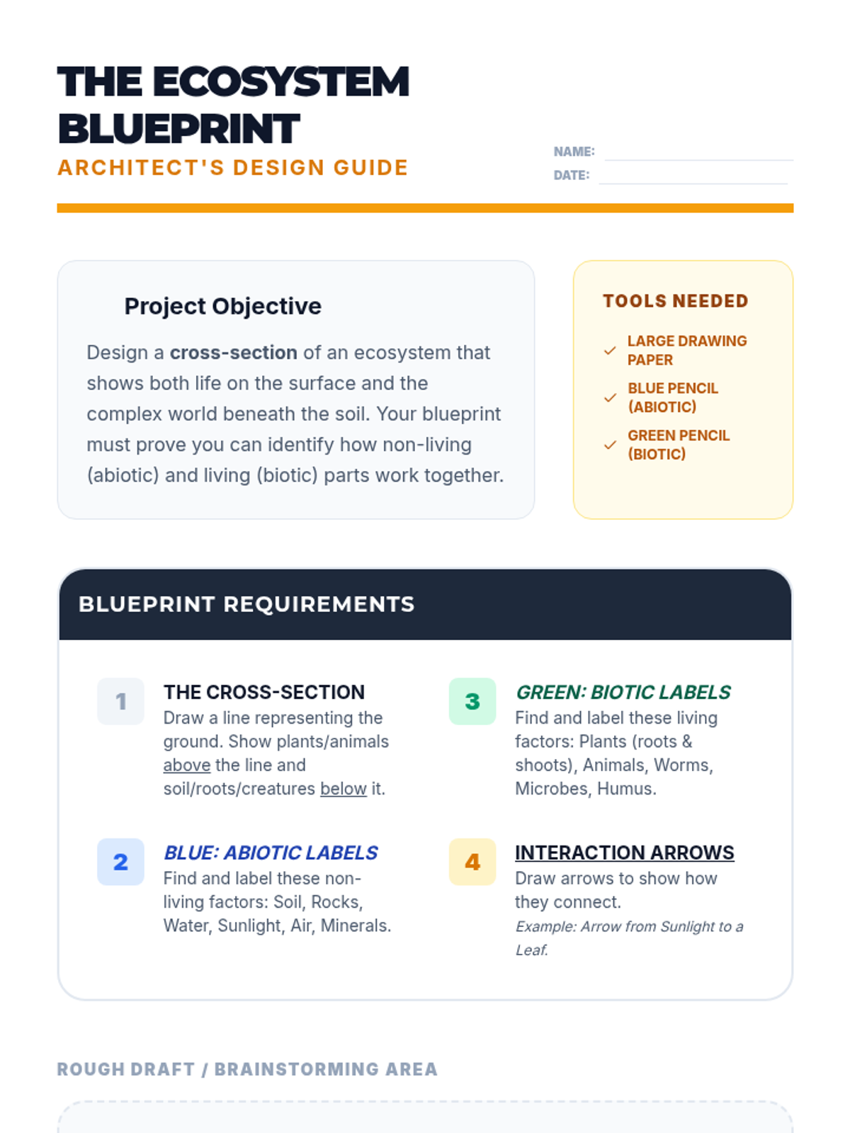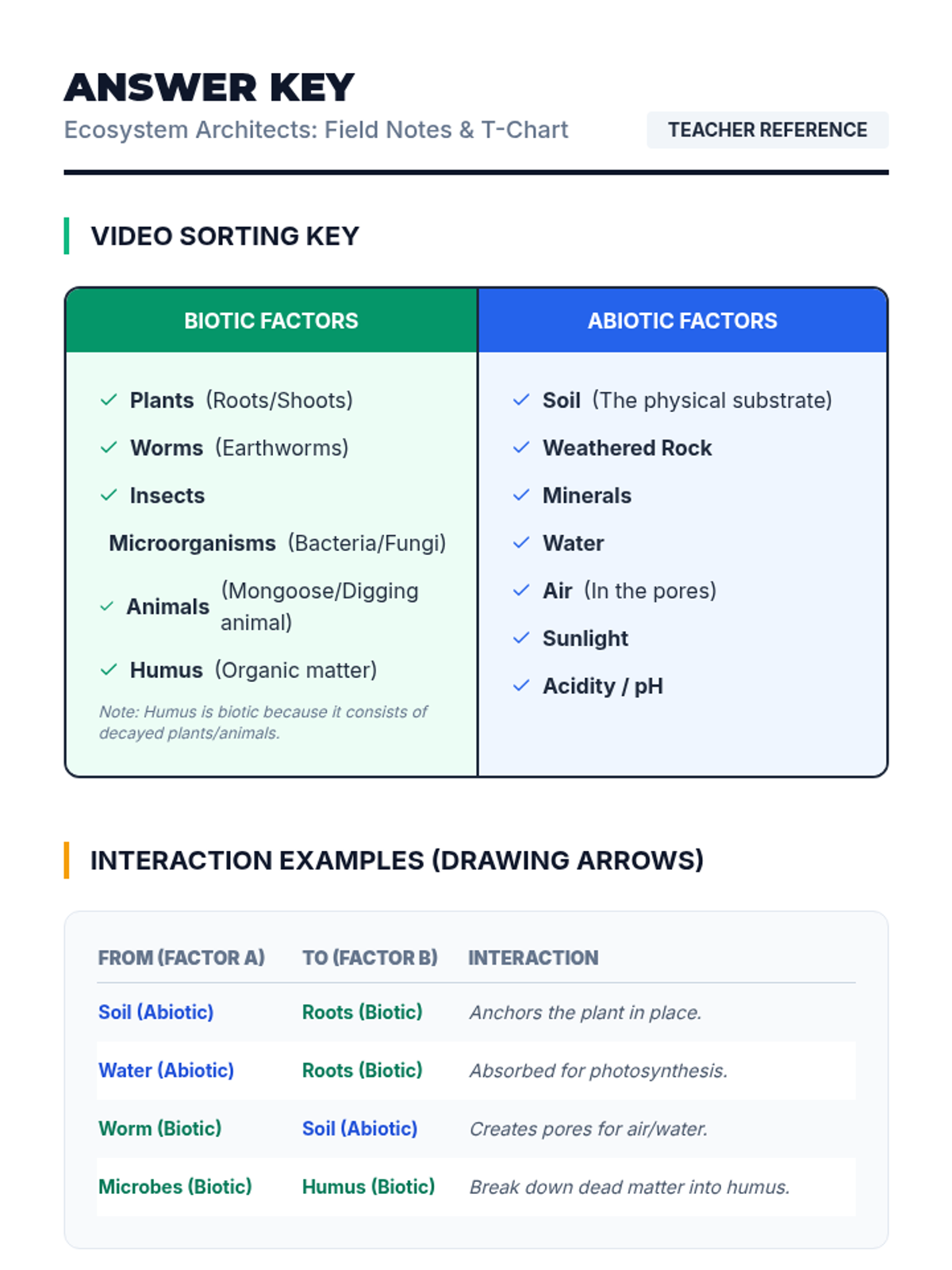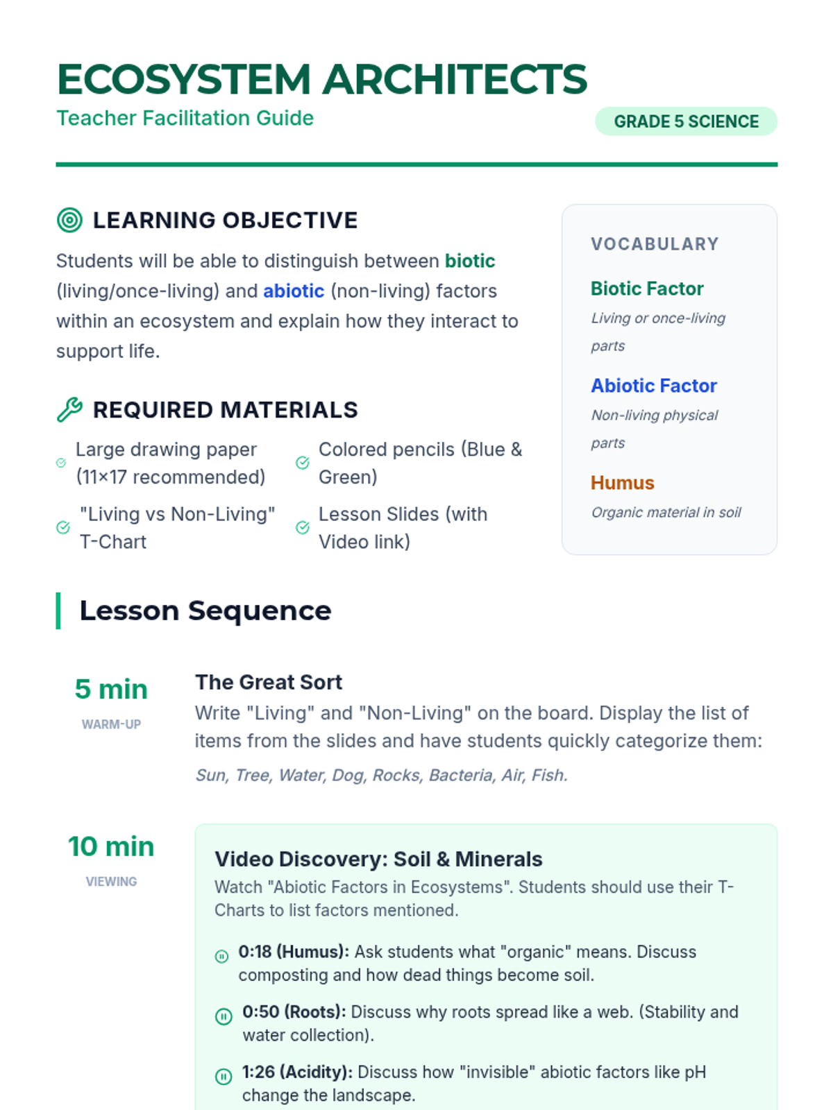 A comprehensive lesson where students explore the differences between biotic and abiotic factors, specifically focusing on soil as a complex ecosystem component. Students will watch a video, complete a T-chart, and then design an ecosystem cross-section.