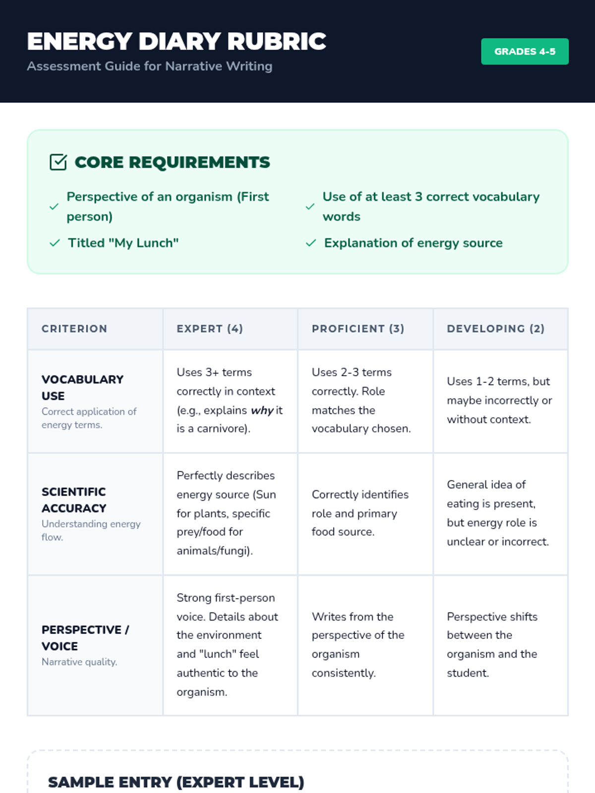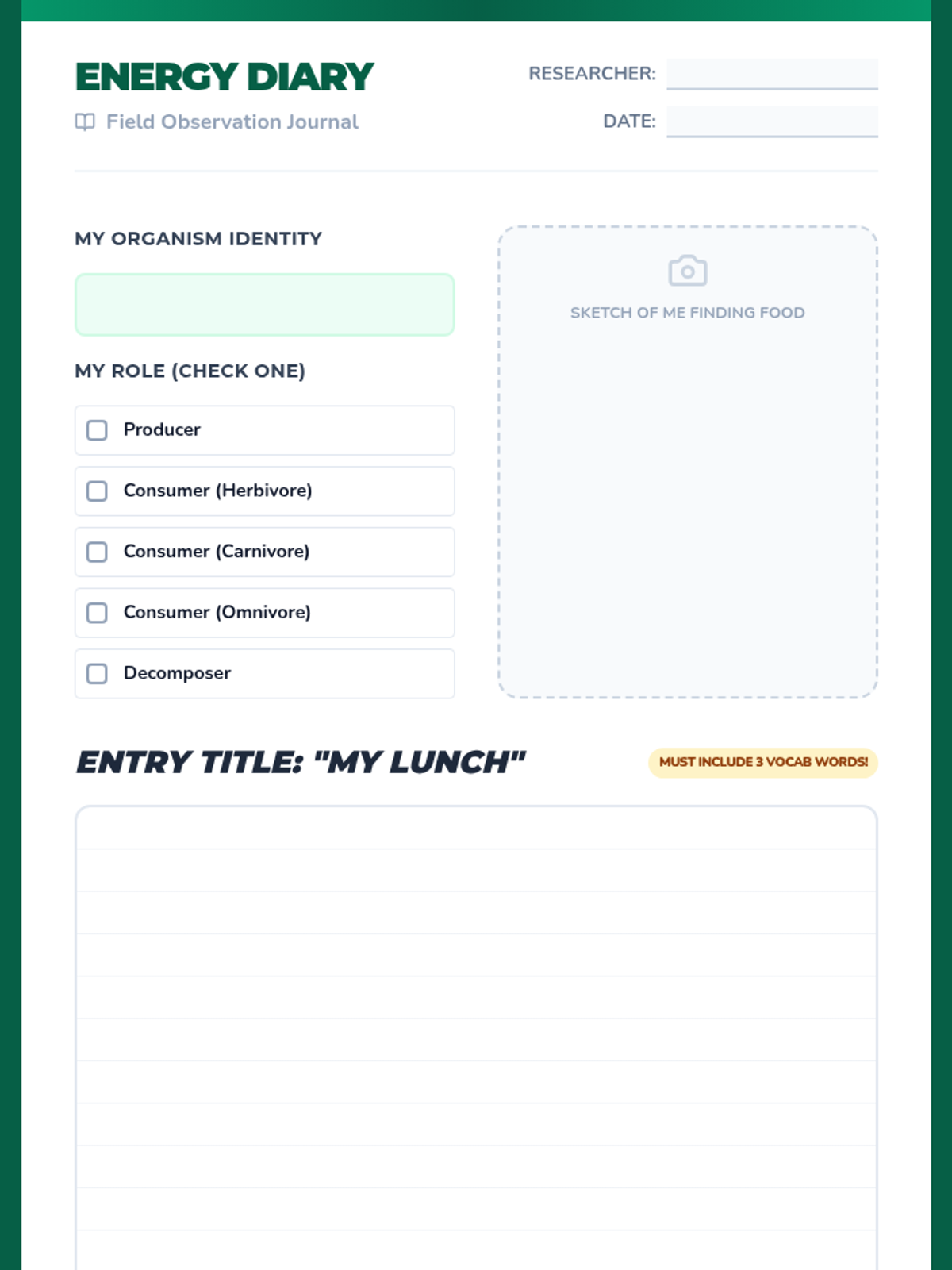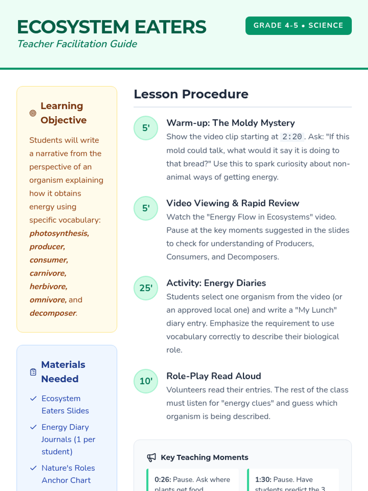 A life science lesson where students explore energy roles in ecosystems through video analysis and creative narrative writing from an organism's perspective.