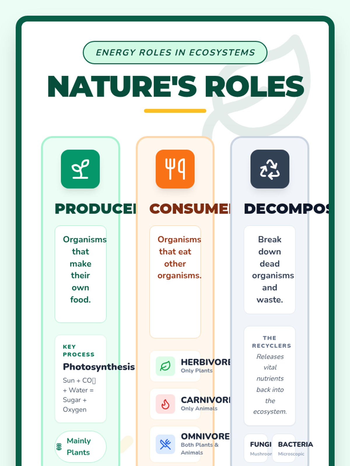 A foundational lesson exploring how energy moves through ecosystems, focusing on trophic levels, the 10% rule, and the complex connections in terrestrial and aquatic food webs.