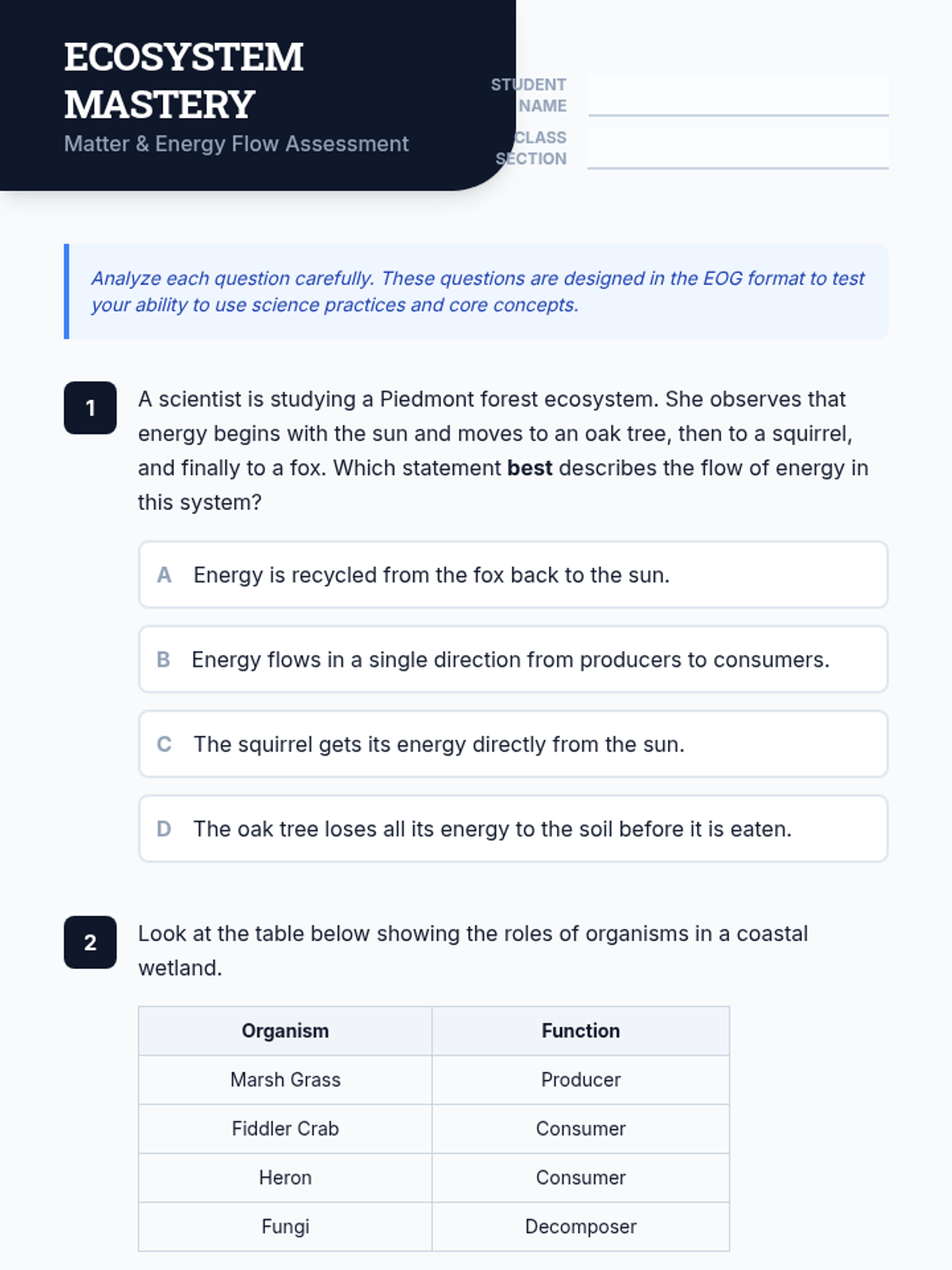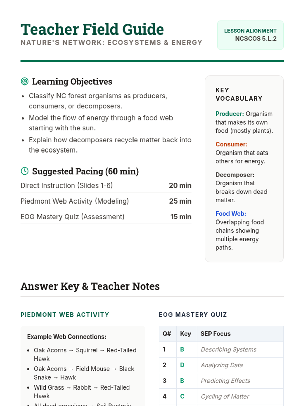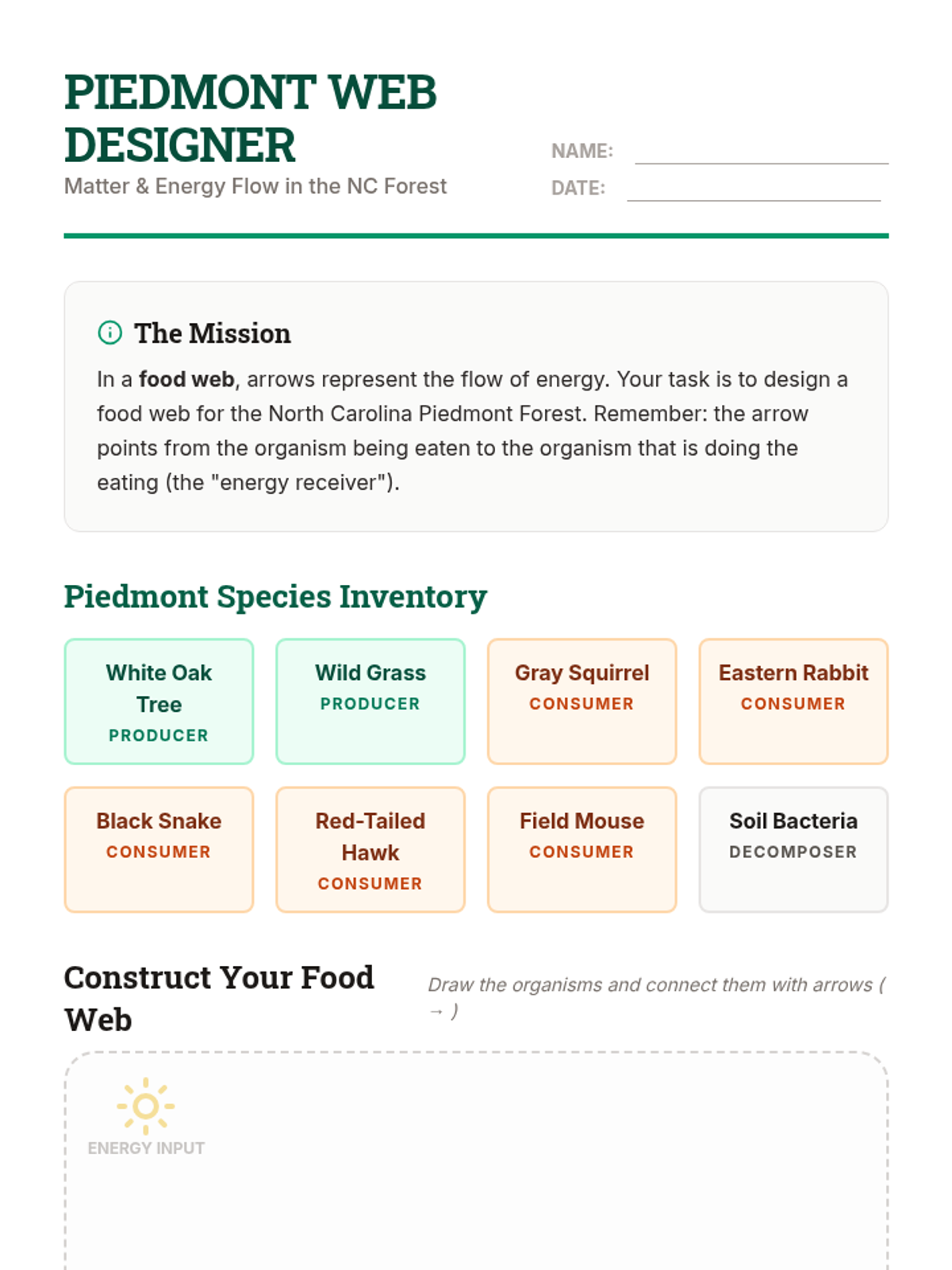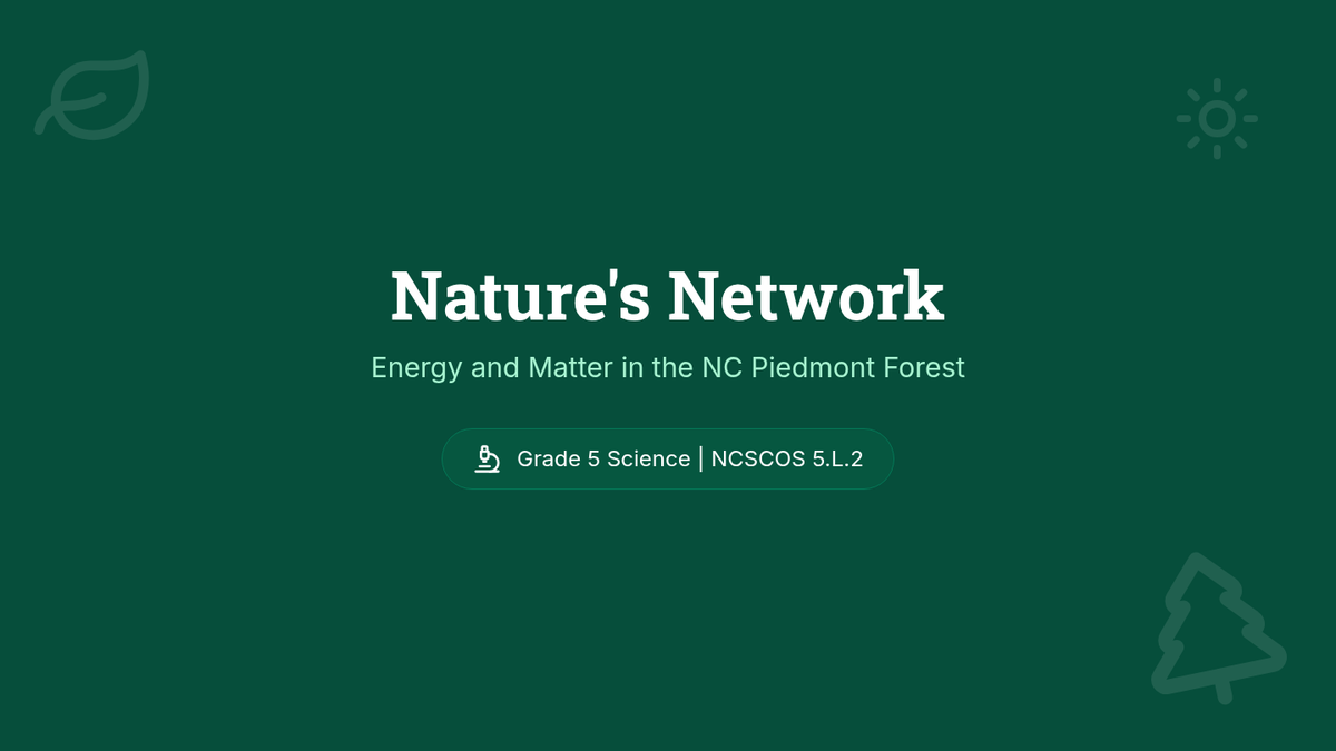 A Grade 5 science lesson exploring energy flow and matter cycling within North Carolina's Piedmont forest ecosystem. Students will classify organisms, build food webs, and analyze how energy moves from the sun through the food chain.