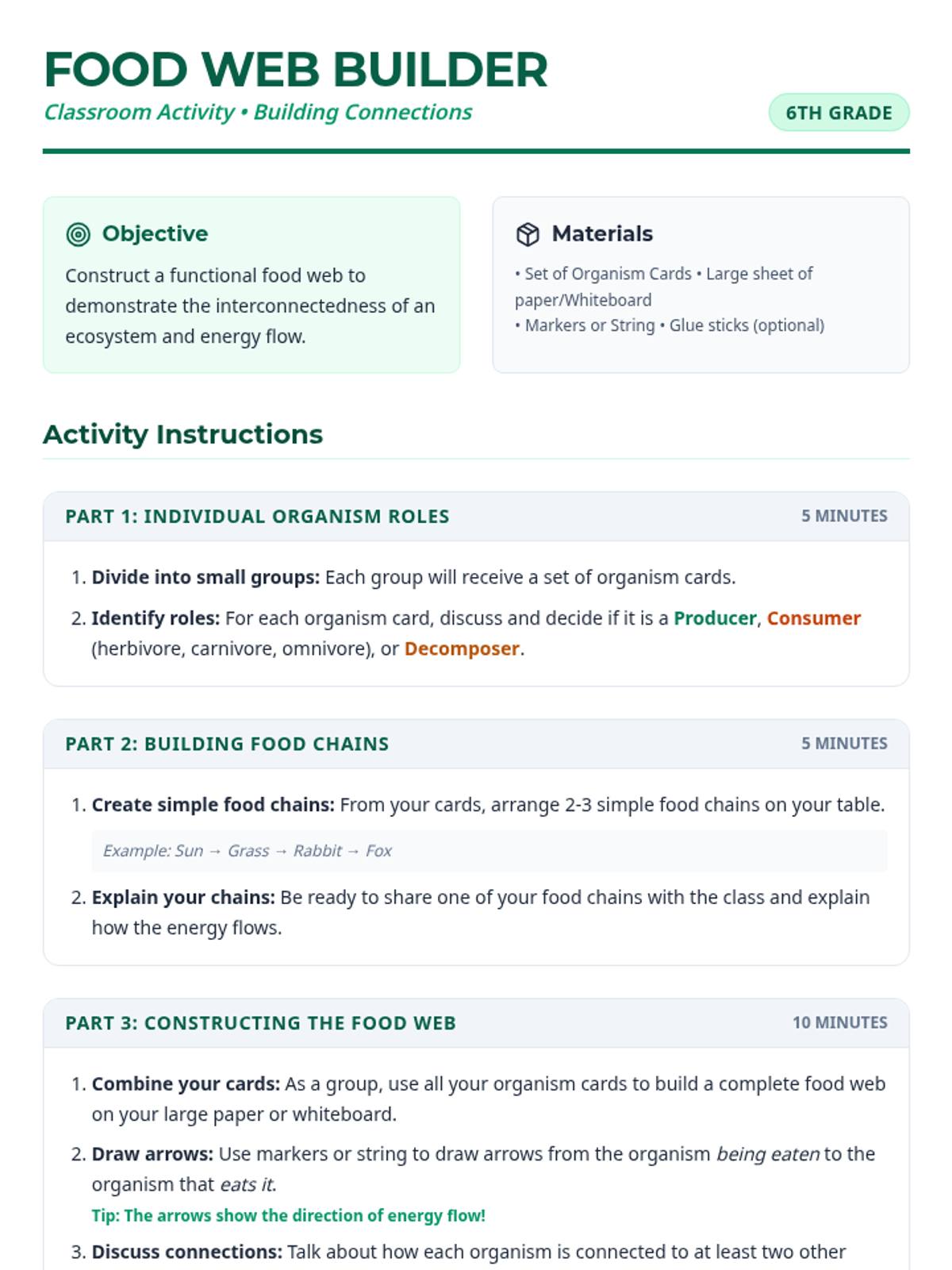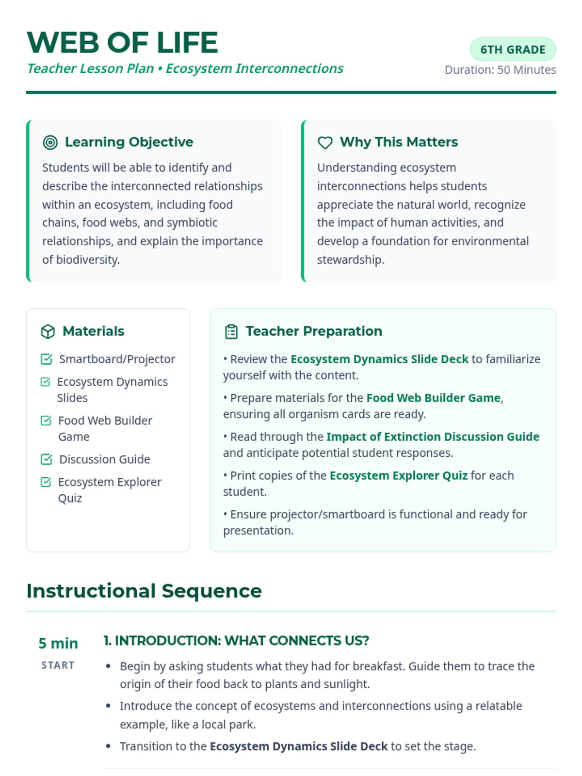 Discover the intricate web of relationships within ecosystems, from food chains to symbiotic partnerships, and understand how organisms depend on each other. This resource promotes ecological literacy and an appreciation for biodiversity. Audience: 6th Grade, 1 session, 50 minutes.