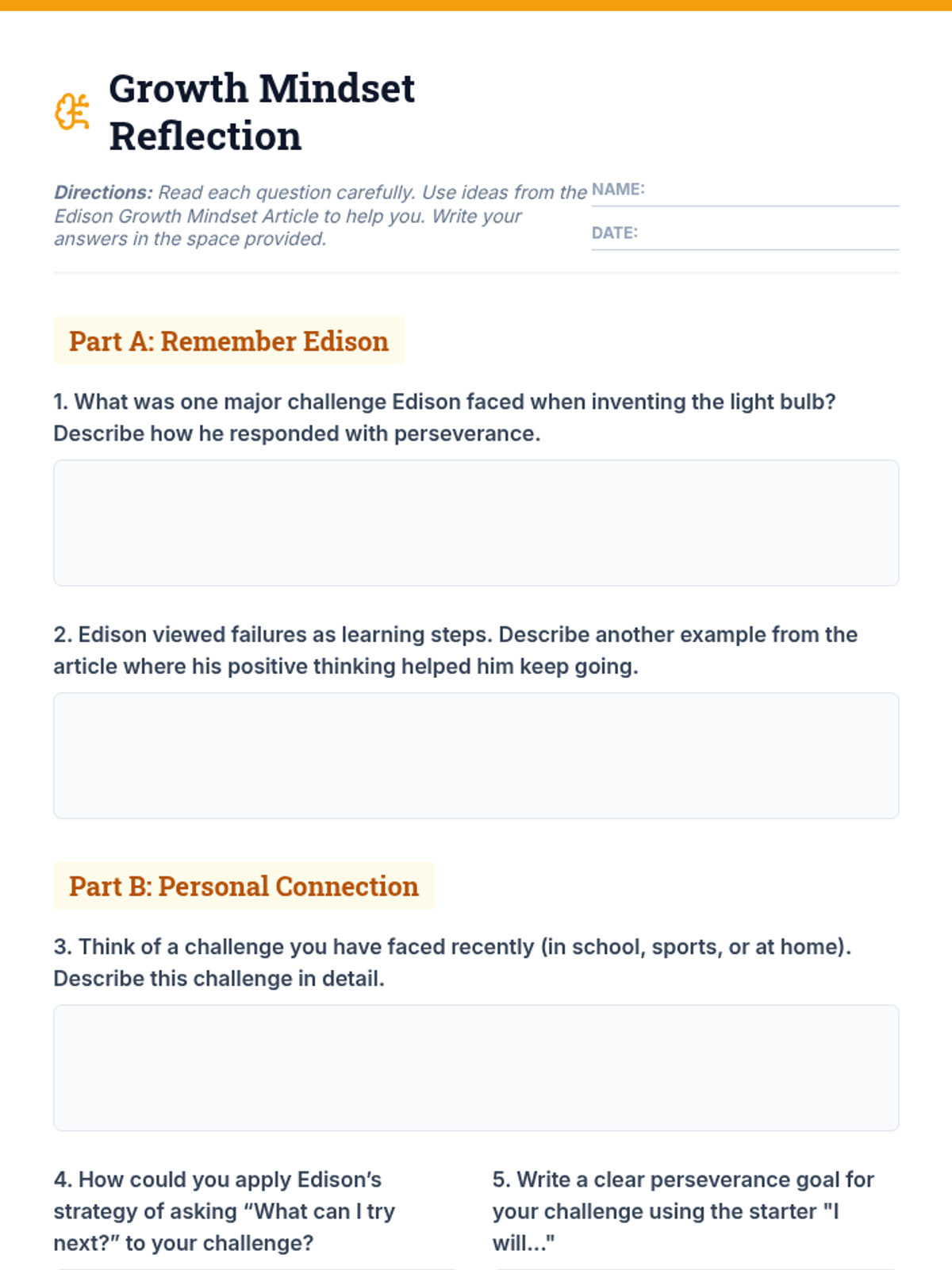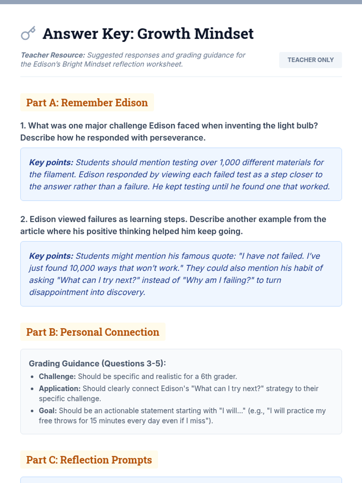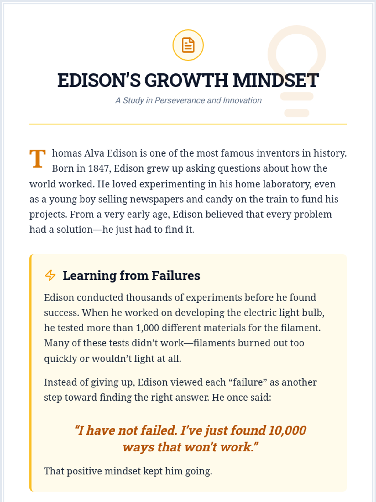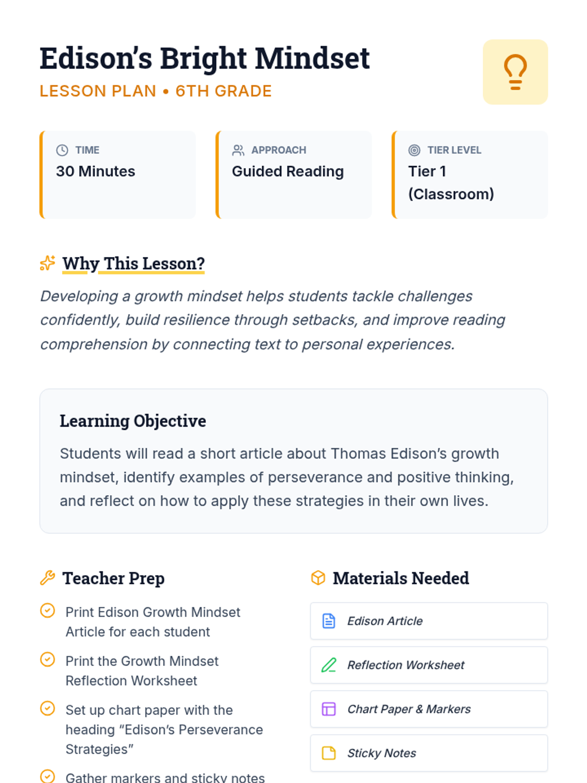 A 30-minute Tier 1 lesson for 6th graders exploring Thomas Edison's growth mindset through reading and personal reflection to build resilience.