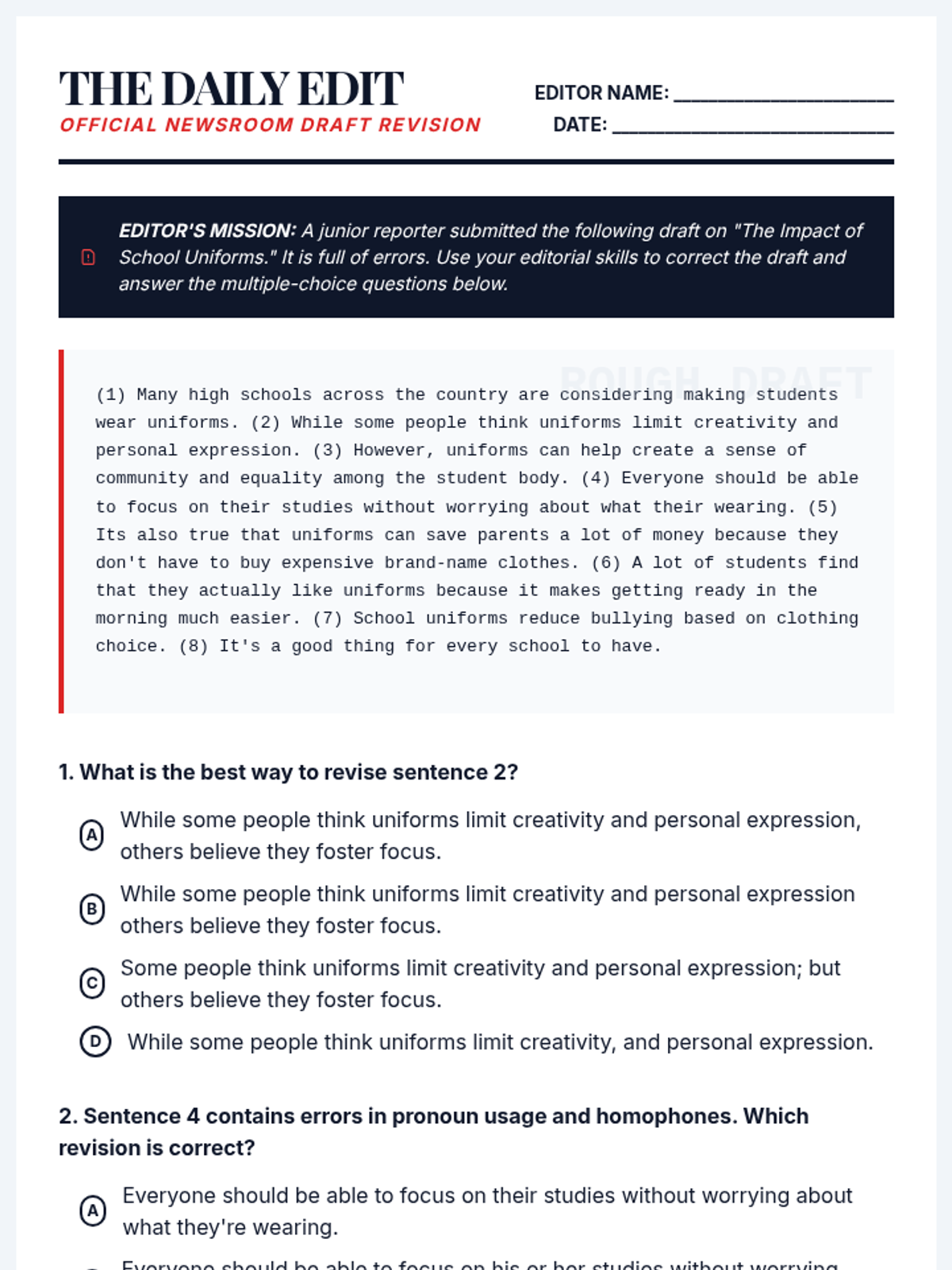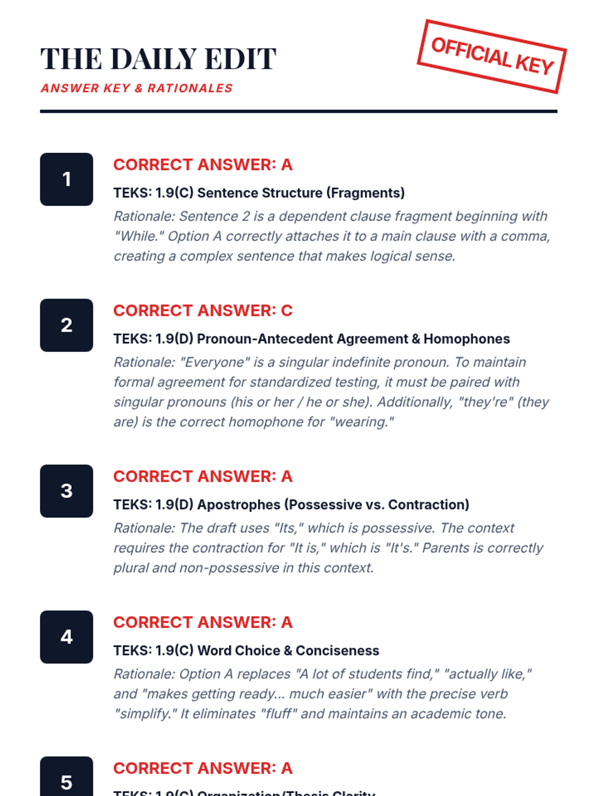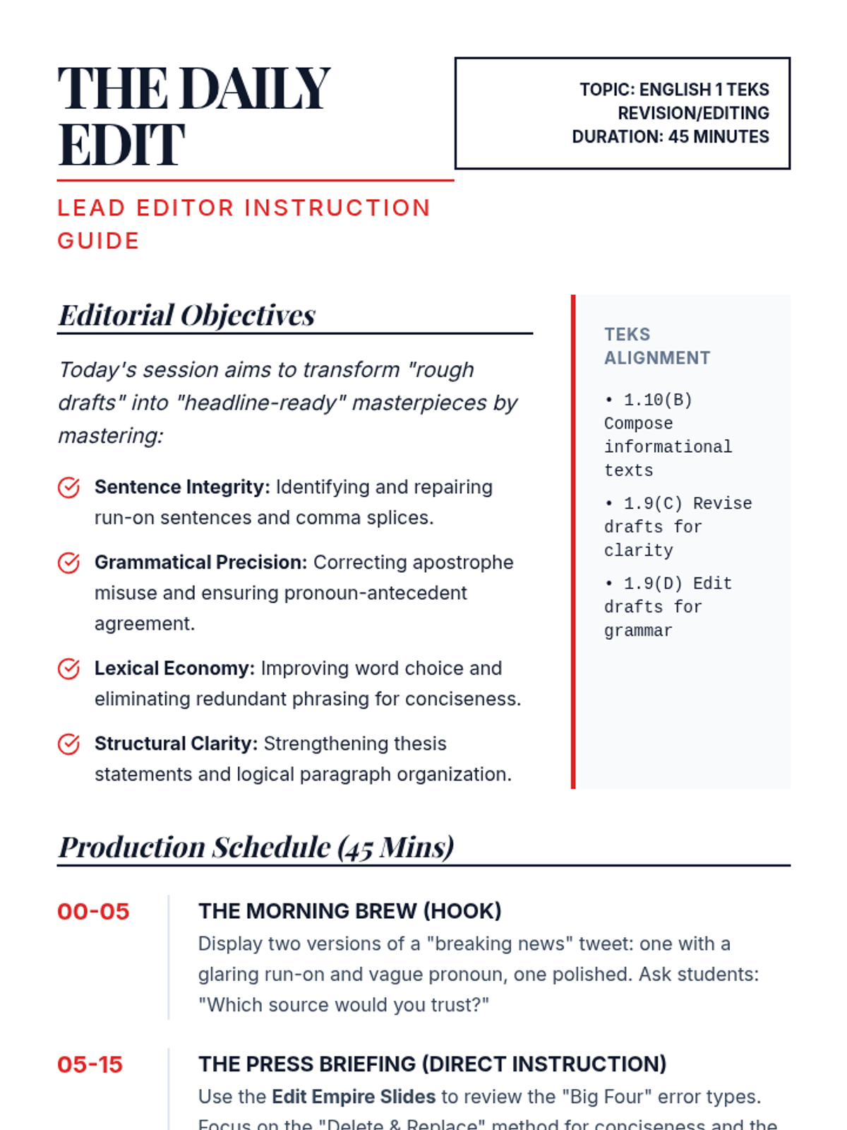 A 45-minute intensive session on high-stakes revision and editing skills for English 1 TEKS, focusing on sentence structure, agreement, word choice, and organization.
