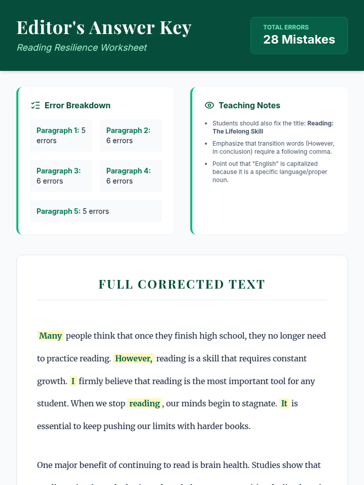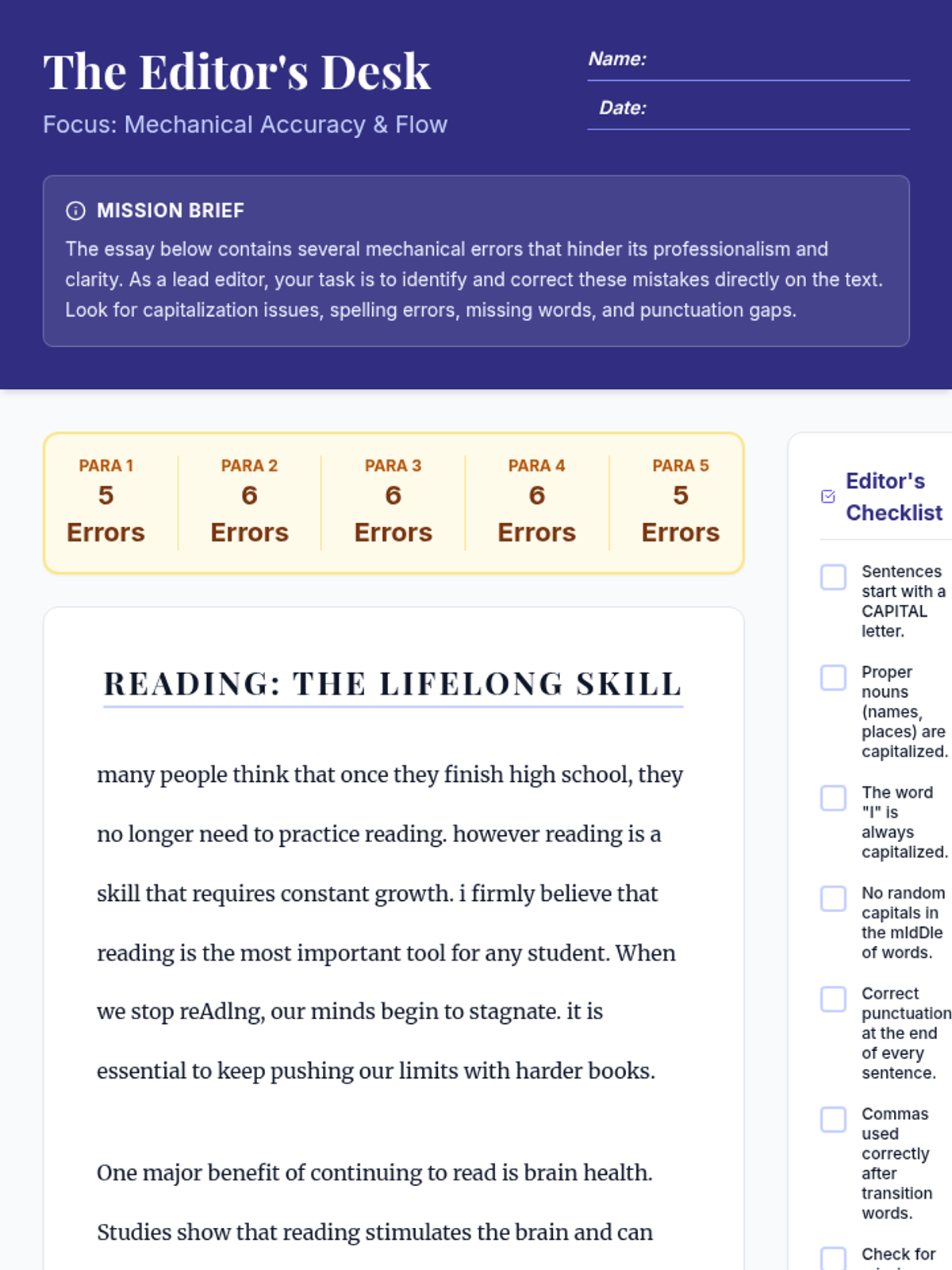 A lesson focused on identifying and correcting common mechanical errors in academic writing, using a five-paragraph essay about the lifelong benefits of reading.