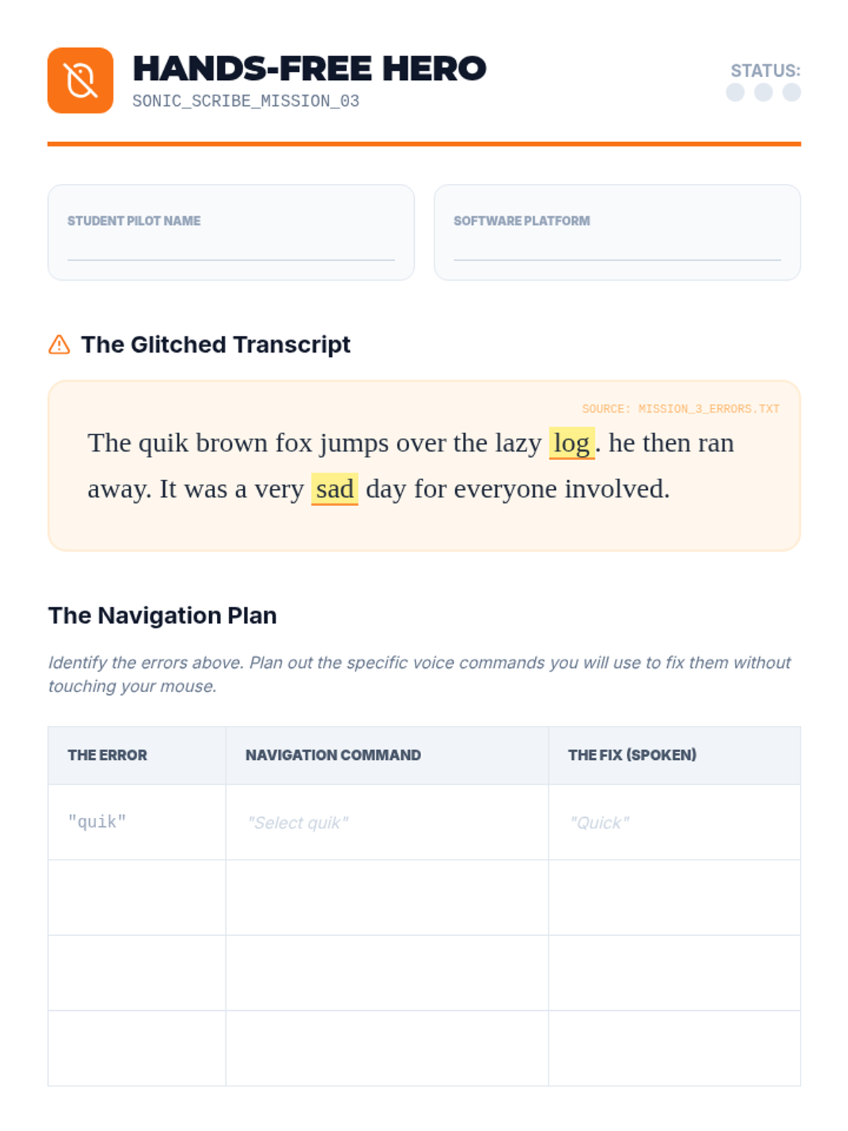 Students learn to navigate and fix errors using only their voice, practicing hands-free editing and cursor control.