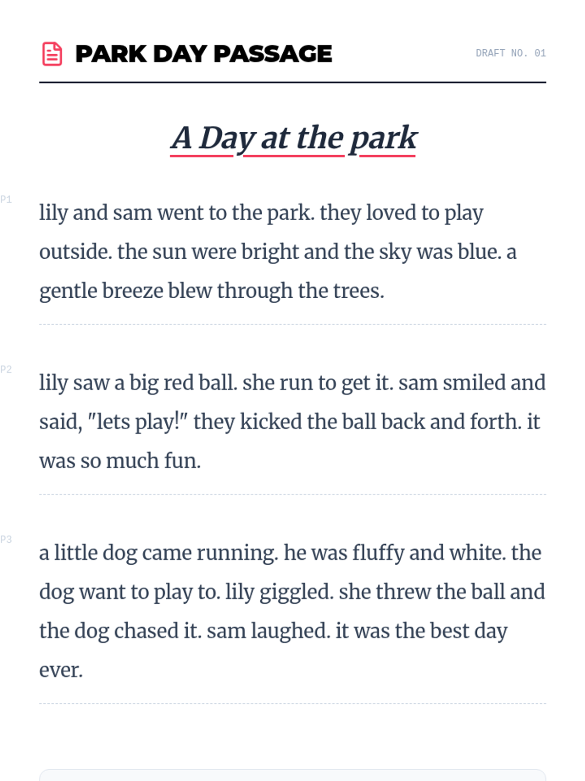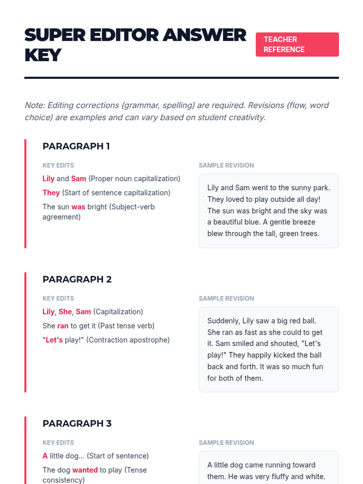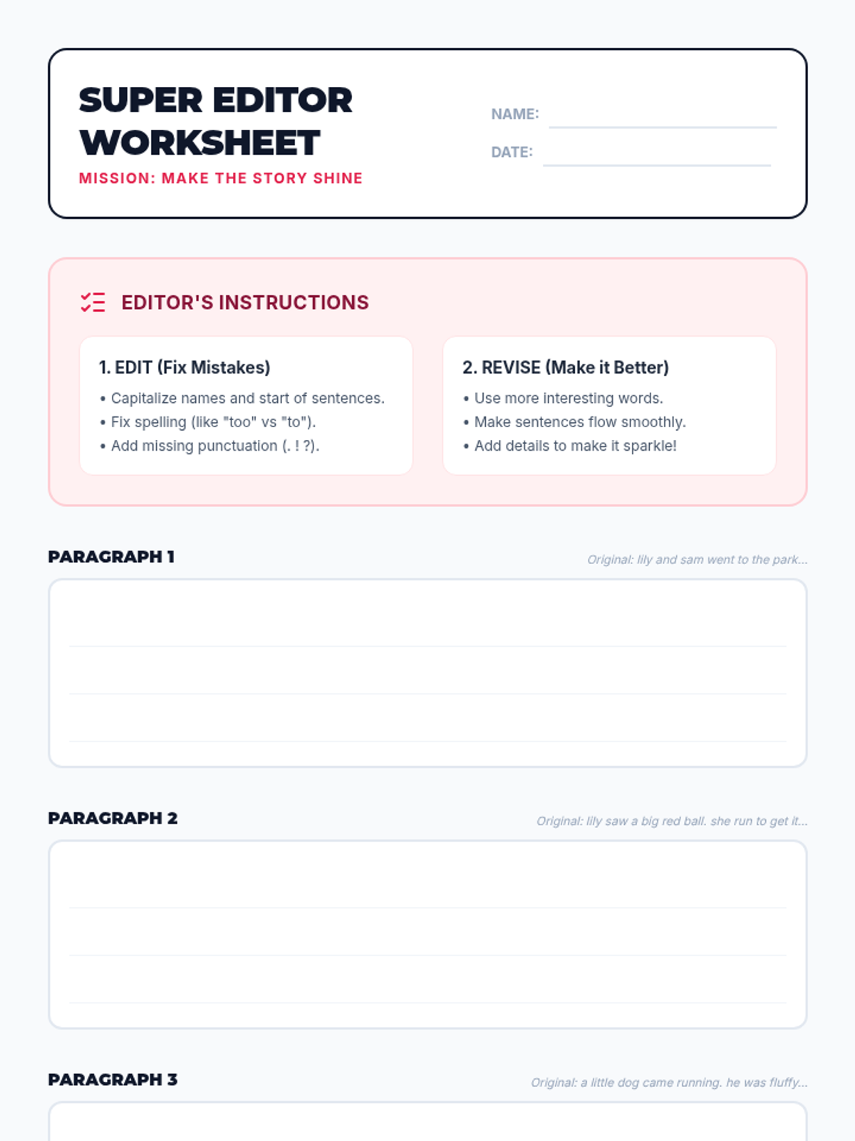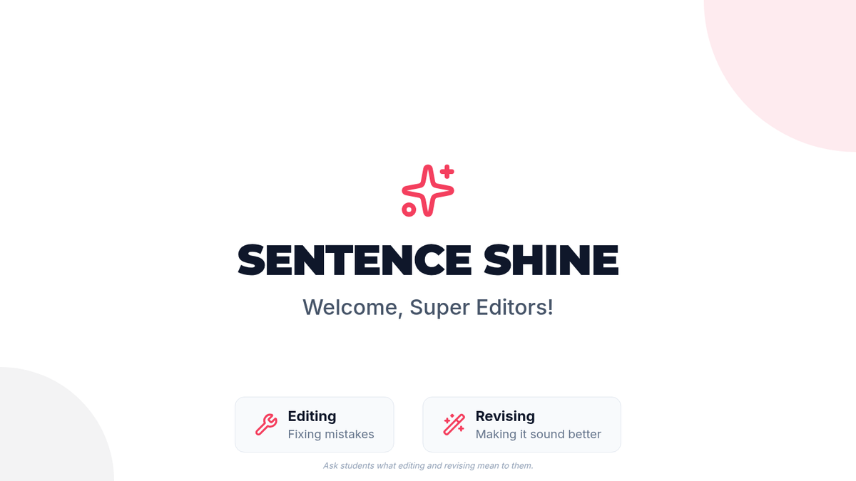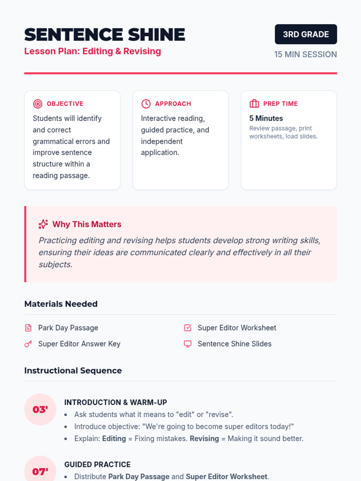 A fast-paced 15-minute lesson for 3rd graders to master basic editing and revising skills. Students will use a short reading passage to practice fixing grammar, spelling, and sentence flow to make their writing 'shine'.