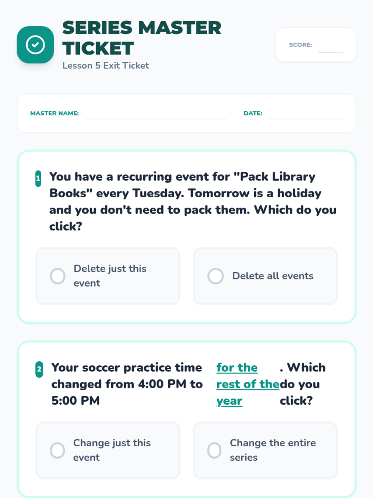 Students learn the critical skill of editing a single instance of a recurring event (like a holiday or sick day) without deleting the entire series.