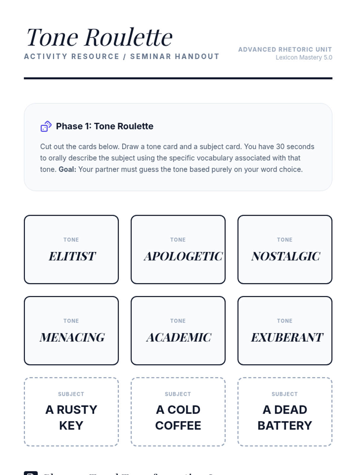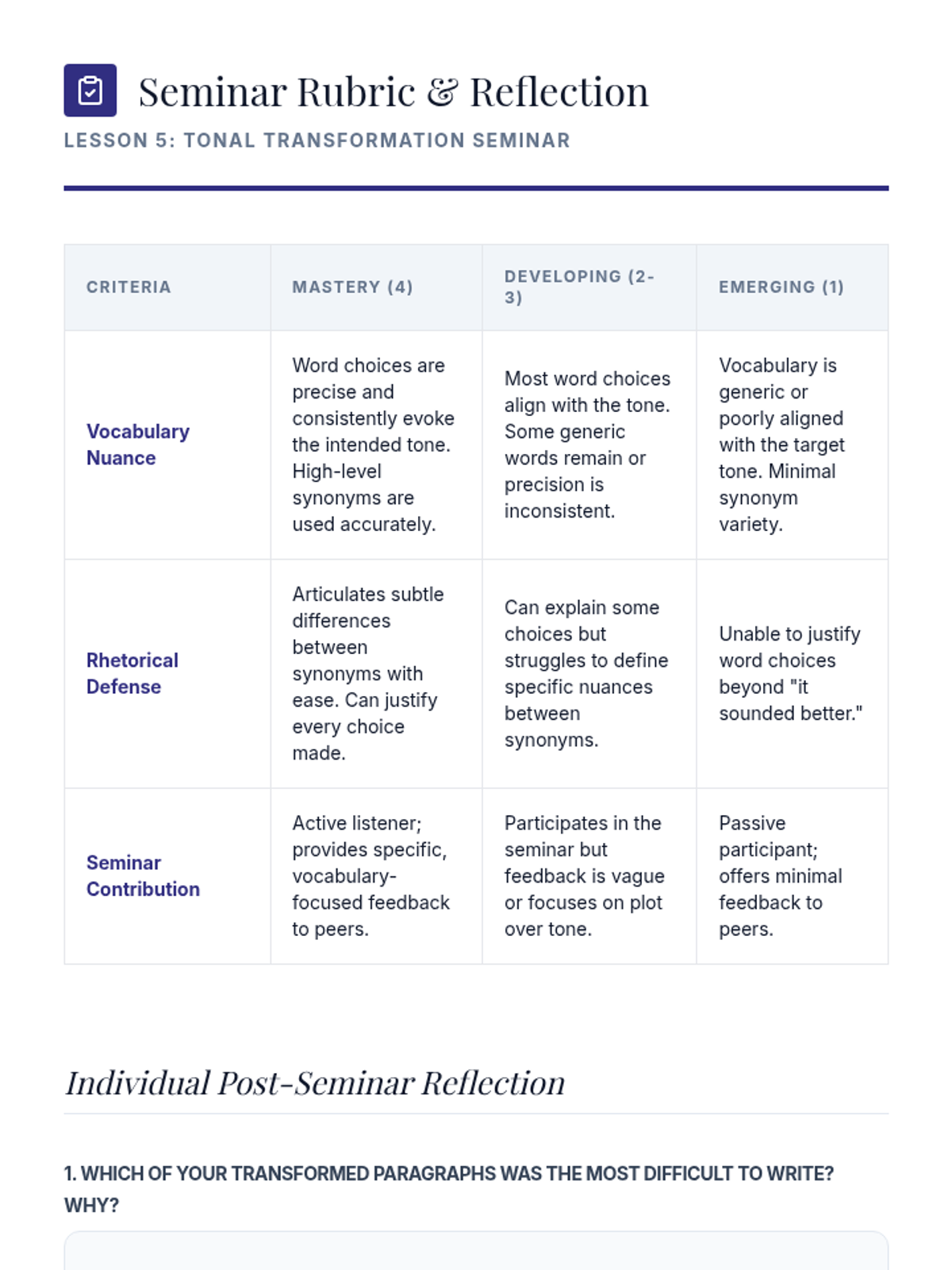 Students rewrite their own work with distinct tonal goals and participate in a seminar to justify their vocabulary choices.
