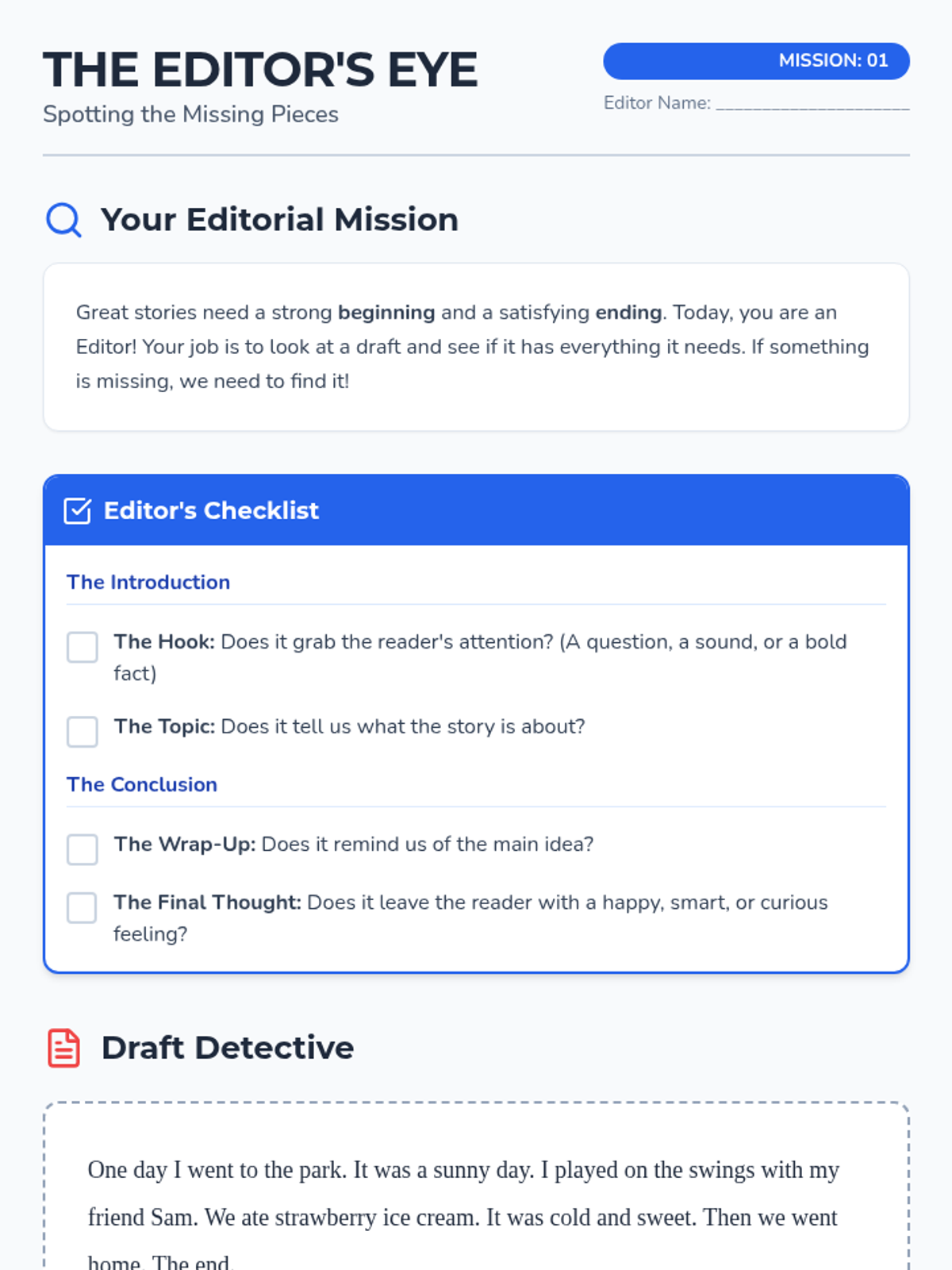 Students learn to identify the key components of an introduction and conclusion using a specific rubric and practice marking up sample texts.